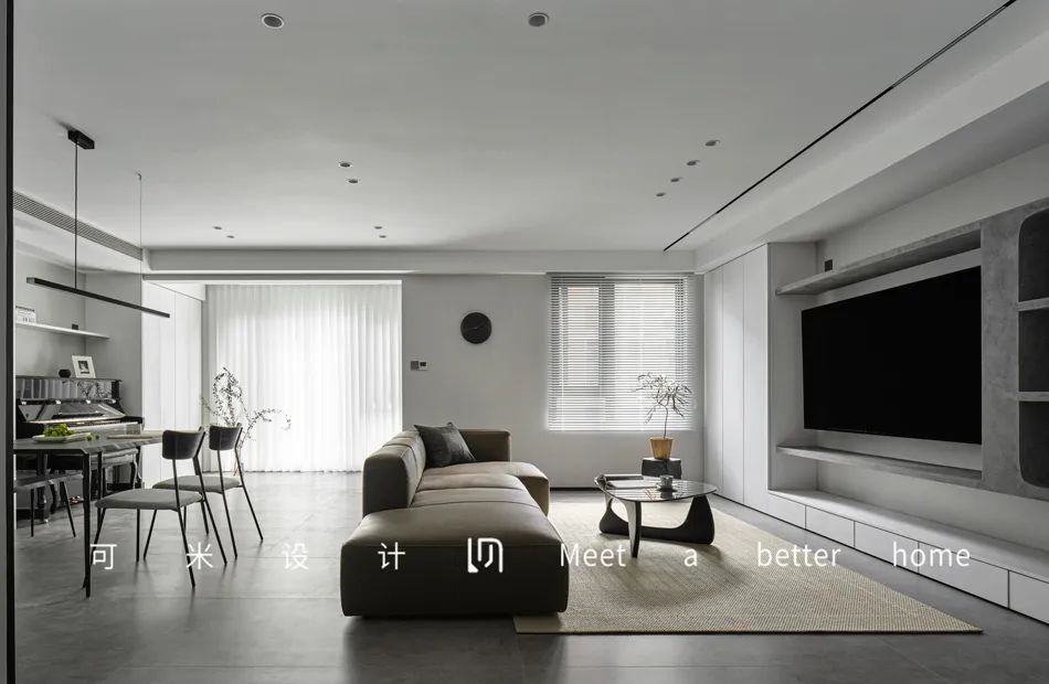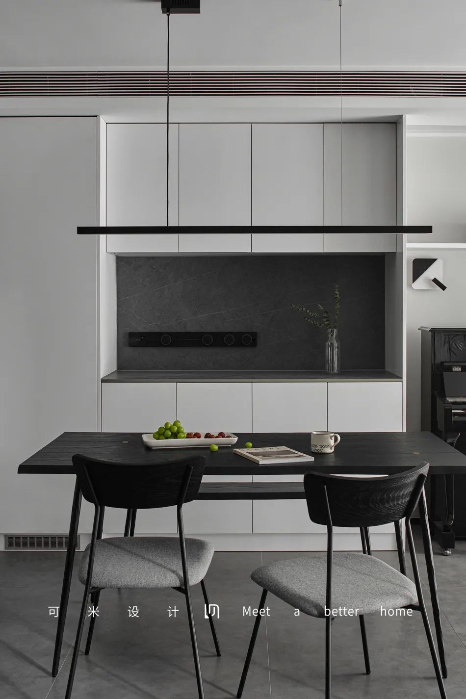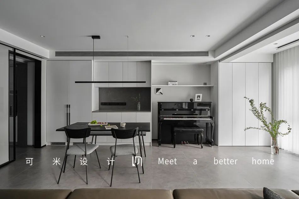 進(jìn)入屋內(nèi),一種歸家的寧?kù)o和安逸撲面而來(lái),滿是令人放松的氣息。客餐廳一體化的設(shè)計(jì),將空間的軸線貫通,開闊式的空間布局納入更多的自然光線,令空間通透而明亮,減少壓抑感和擁擠感??臻g上以現(xiàn)代簡(jiǎn)約為設(shè)計(jì)手法,灰白色調(diào)為主,通過(guò)精致悅目的細(xì)節(jié),使空間結(jié)構(gòu)明確、外觀明快簡(jiǎn)潔,整體呈現(xiàn)寧?kù)o雅致的舒適氛圍。