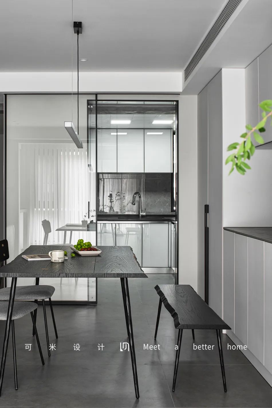 以灰色墻地面作為基礎(chǔ),深灰色石英石作為臺(tái)面,整體櫥柜定制超白玻璃柜門,方便日常清潔打掃,在簡(jiǎn)約的基礎(chǔ)上營(yíng)造出空間的光澤感,整體更加明亮、整潔。