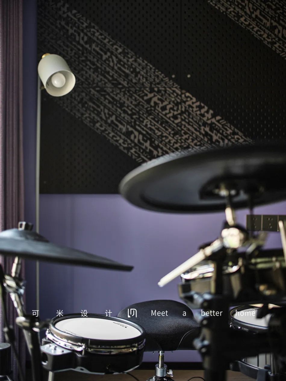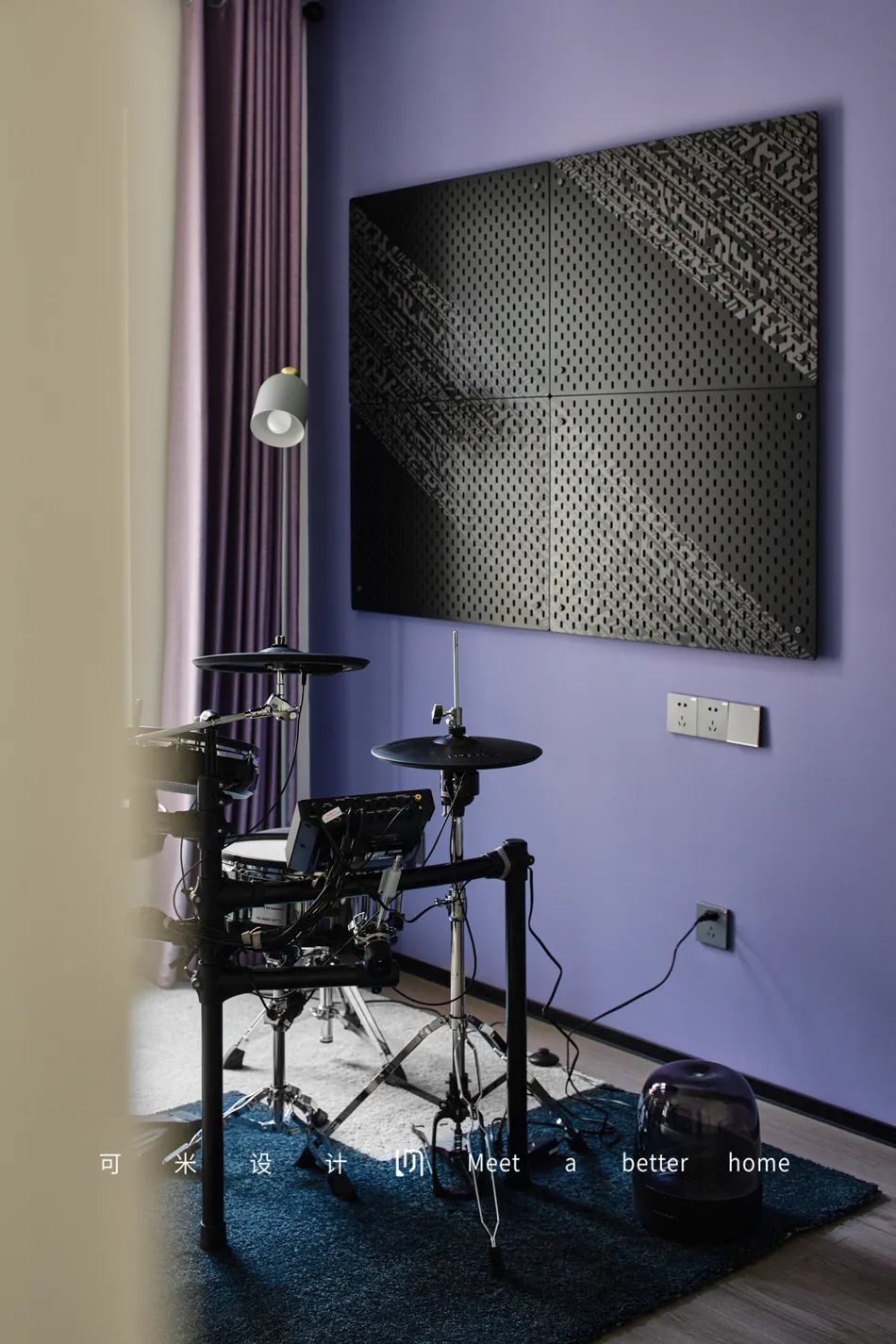 二層朝南的次臥作為娛樂室,架子鼓和舞蹈房設(shè)置在同一個(gè)空間,其中一面墻涂刷了紫色,賦予空間輕松、浪漫的能量,為屋主提供了一個(gè)情趣優(yōu)雅而又文藝的多功能空間。