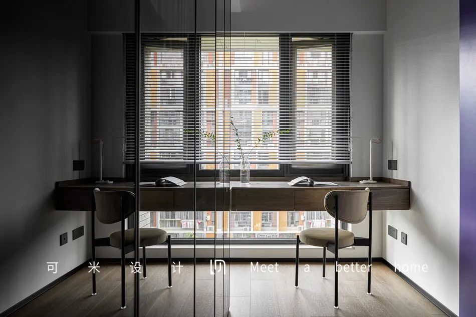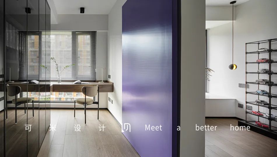 從活動(dòng)室方可進(jìn)入書房,打造一間安謐之所,兩個(gè)空間以紫色的木質(zhì)推拉門相隔,與娛樂室的紫色背景墻相呼應(yīng),在清澈淡雅的空間中增添一份明媚浪漫。沿墻定制一排頂天立地的書柜,采用黑色的玻璃柜門,增加收納的同時(shí)又帶來(lái)高級(jí)感。