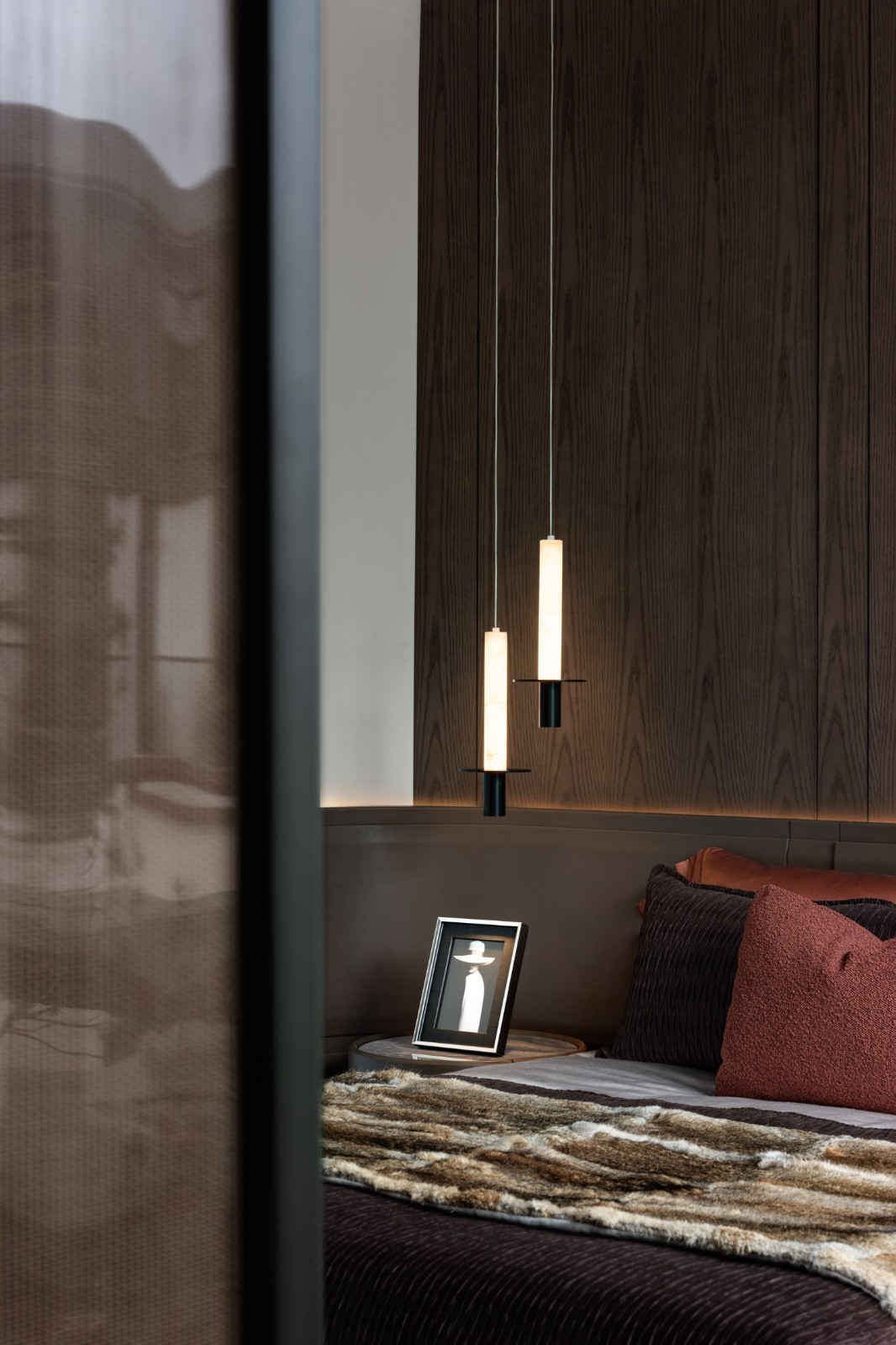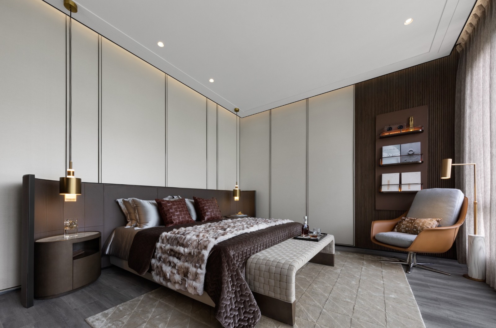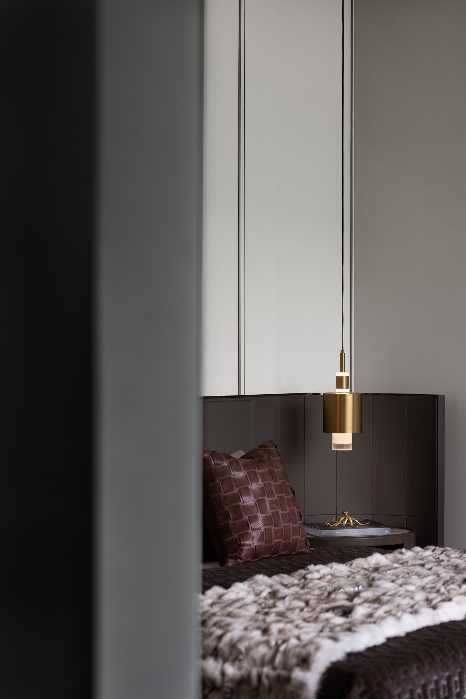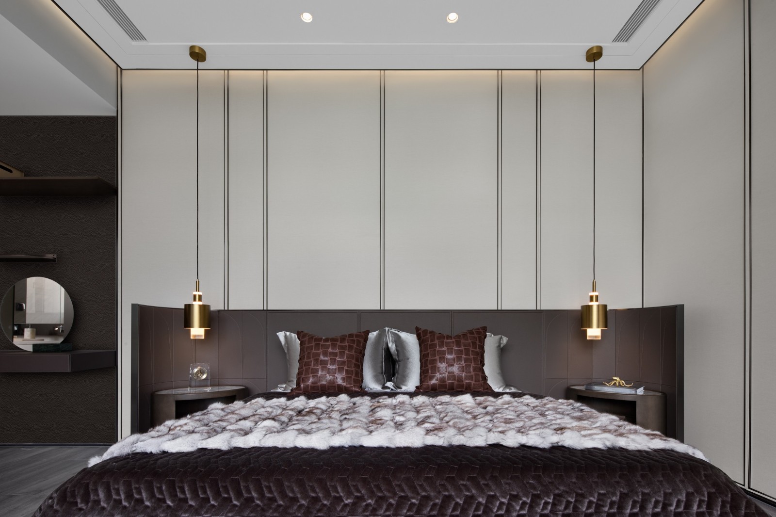 木、金屬、皮革、織物交織融合成的主臥空間,在現(xiàn)代設(shè)計(jì)語言的把握上賦予了空間新的藝術(shù)格調(diào)。