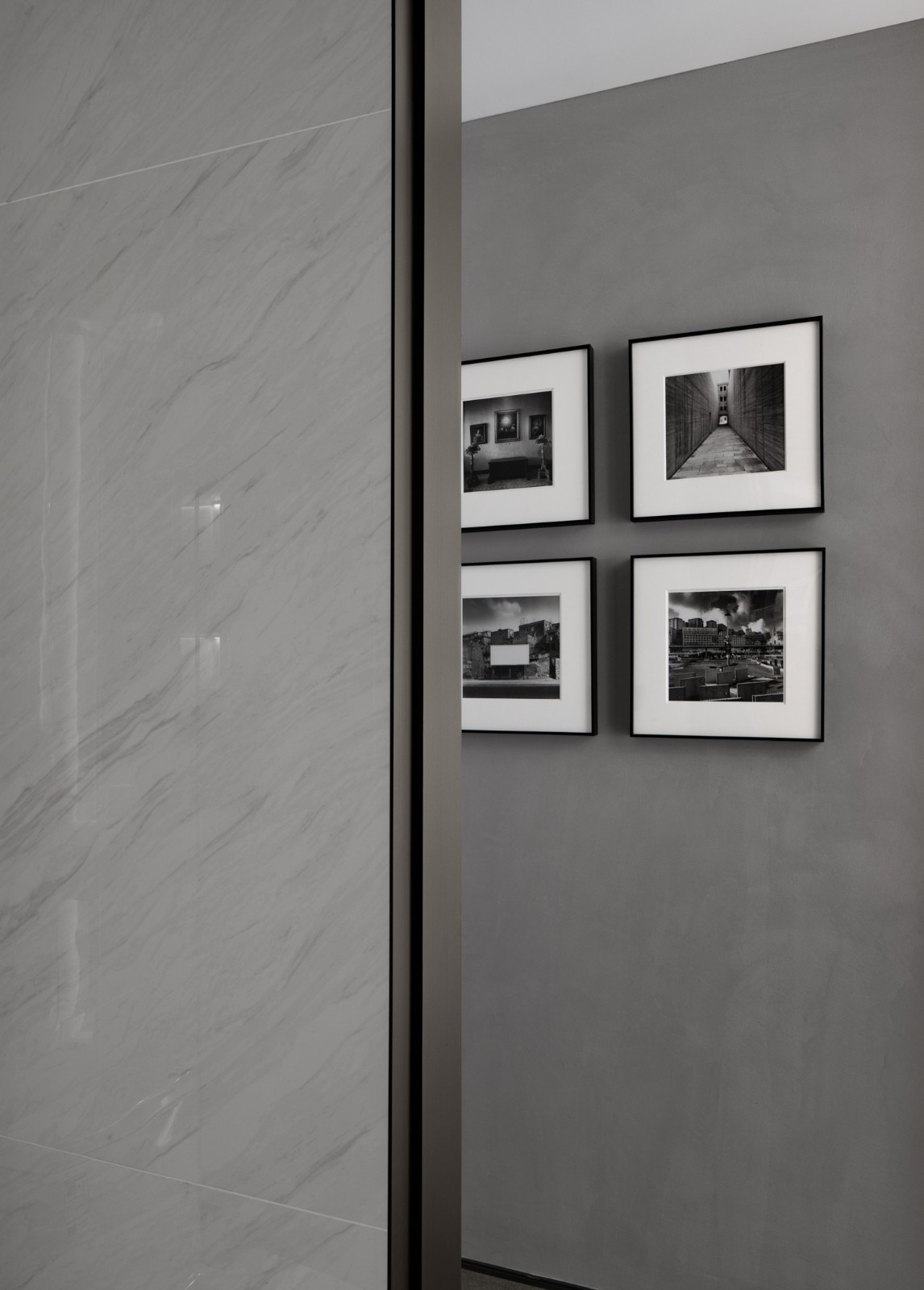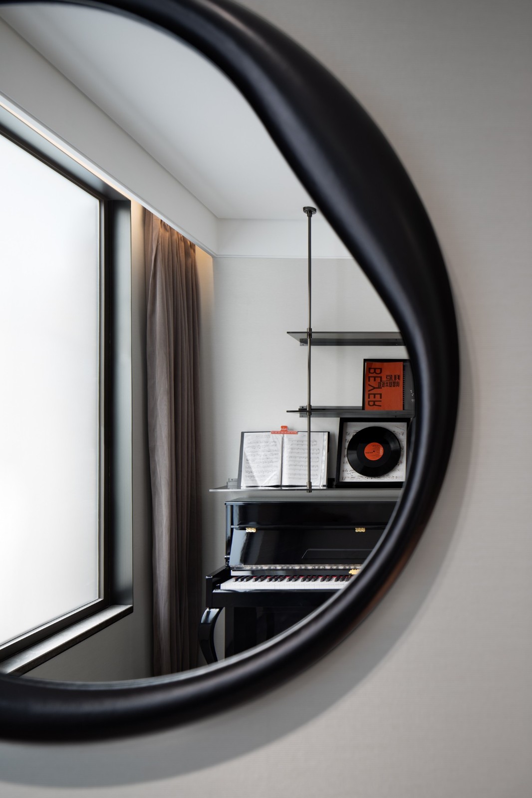 轉(zhuǎn)角樓梯下方創(chuàng)設(shè)的酒吧空間里,燈光和酒瓶折射著光影的明暗,這里著重個(gè)人精神世界的獨(dú)立。通過黑色大理石吧臺(tái)的體量與會(huì)客廳白色大理石的塊立面對(duì)比產(chǎn)生視覺上的對(duì)話,也強(qiáng)調(diào)著個(gè)人世界與家庭公共區(qū)域的呼應(yīng)和互動(dòng)。