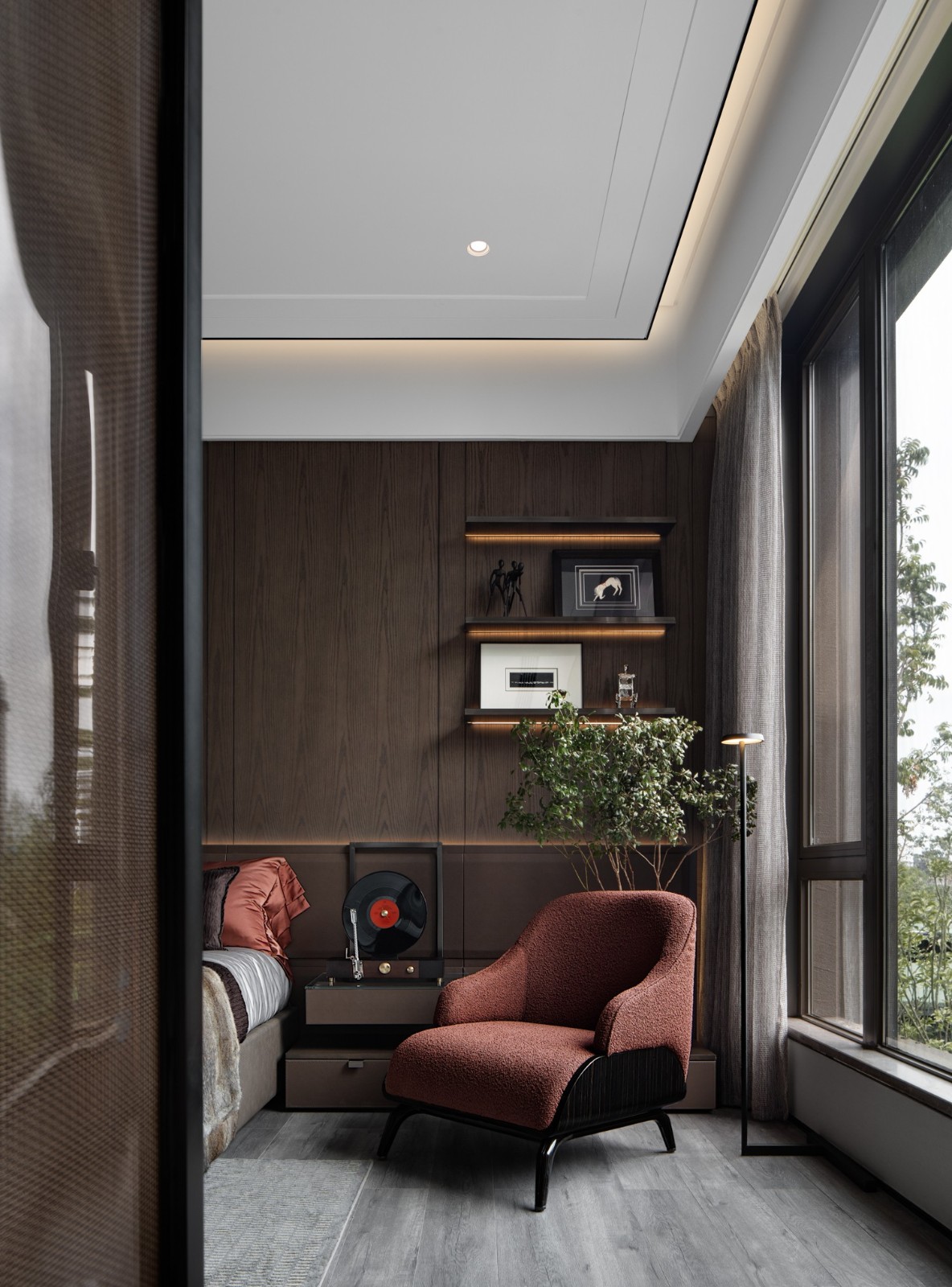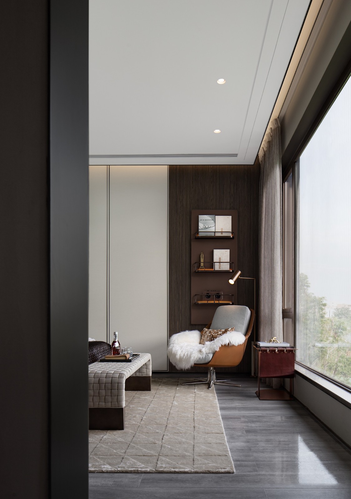 繁華觸手可及,自然近在咫尺,世間存在許多條通往美的途徑,設(shè)計(jì)團(tuán)隊(duì)深挖精睿階層的精神訴求以及他們對(duì)生命品質(zhì)的追求,在主臥的落地窗邊營造了一個(gè)可以自洽的安靜角落。