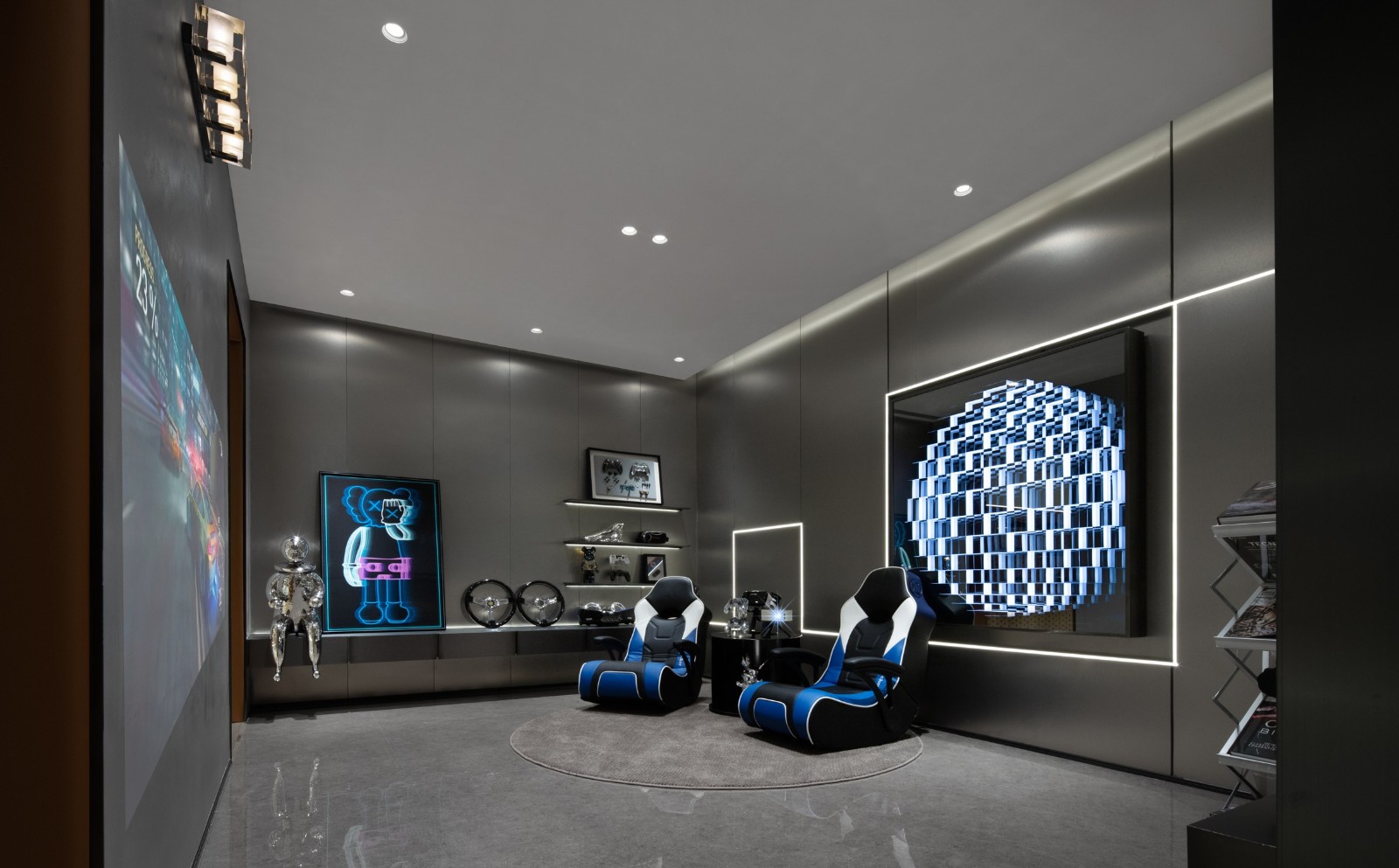 墻面掛畫上閃爍著極富未來科技感的光澤,與KAWS藝術(shù)玩偶的潮玩元素交織融為一體,為VR影音電競(jìng)室注入超現(xiàn)實(shí)感;戴上VR頭盔,沉浸于3D虛擬世界,如身臨其境地體驗(yàn)運(yùn)動(dòng)、娛樂、觀影帶來的趣味,為空間呈現(xiàn)出個(gè)性獨(dú)特的光芒。