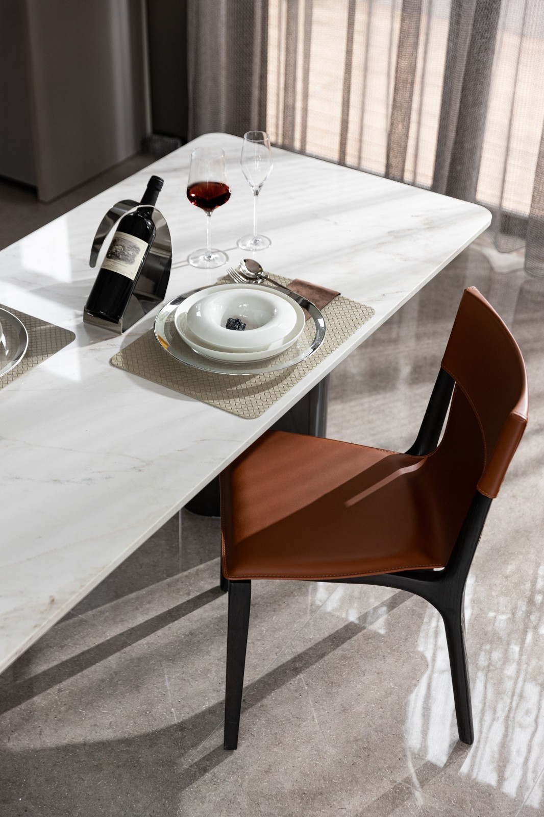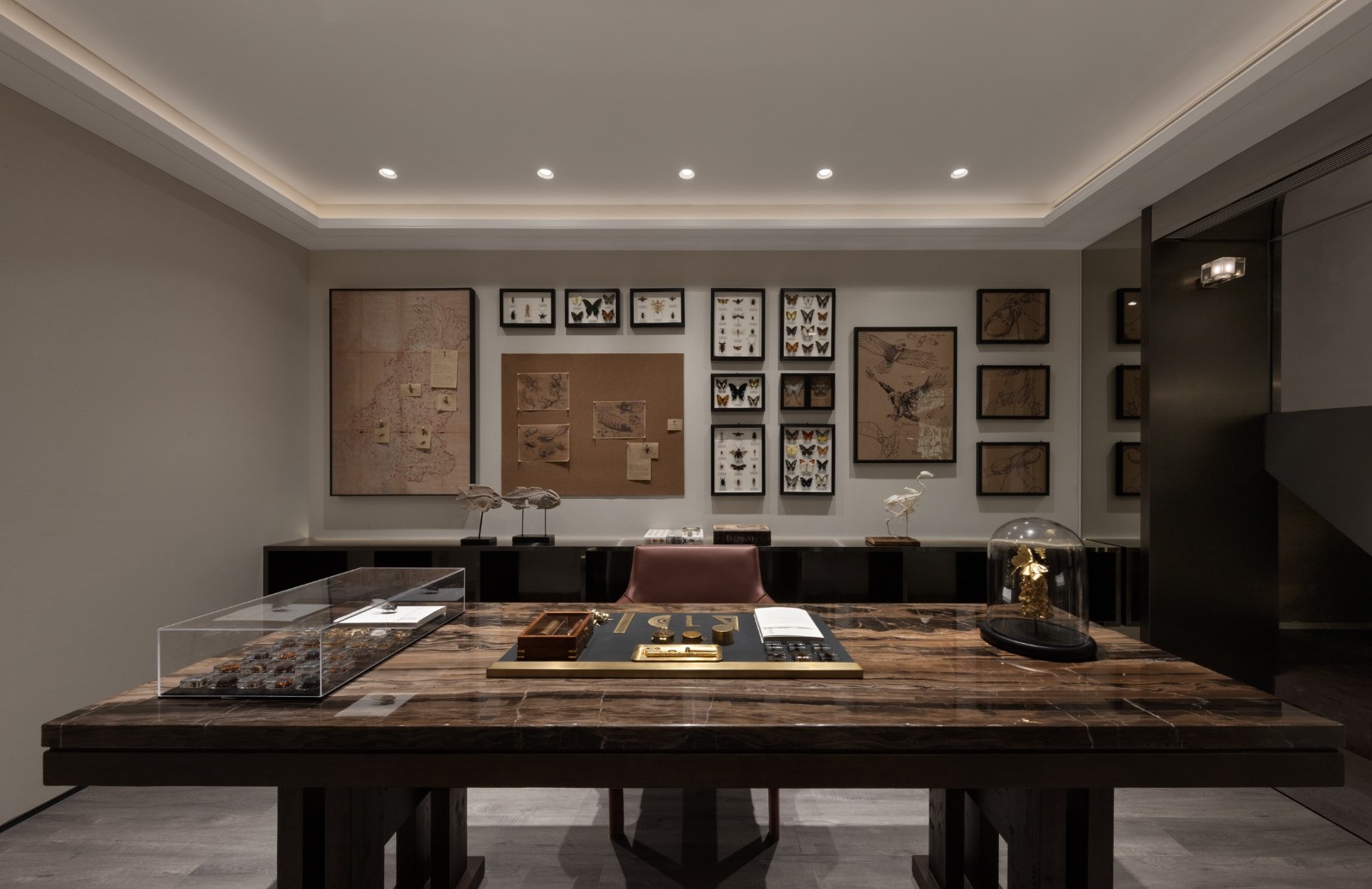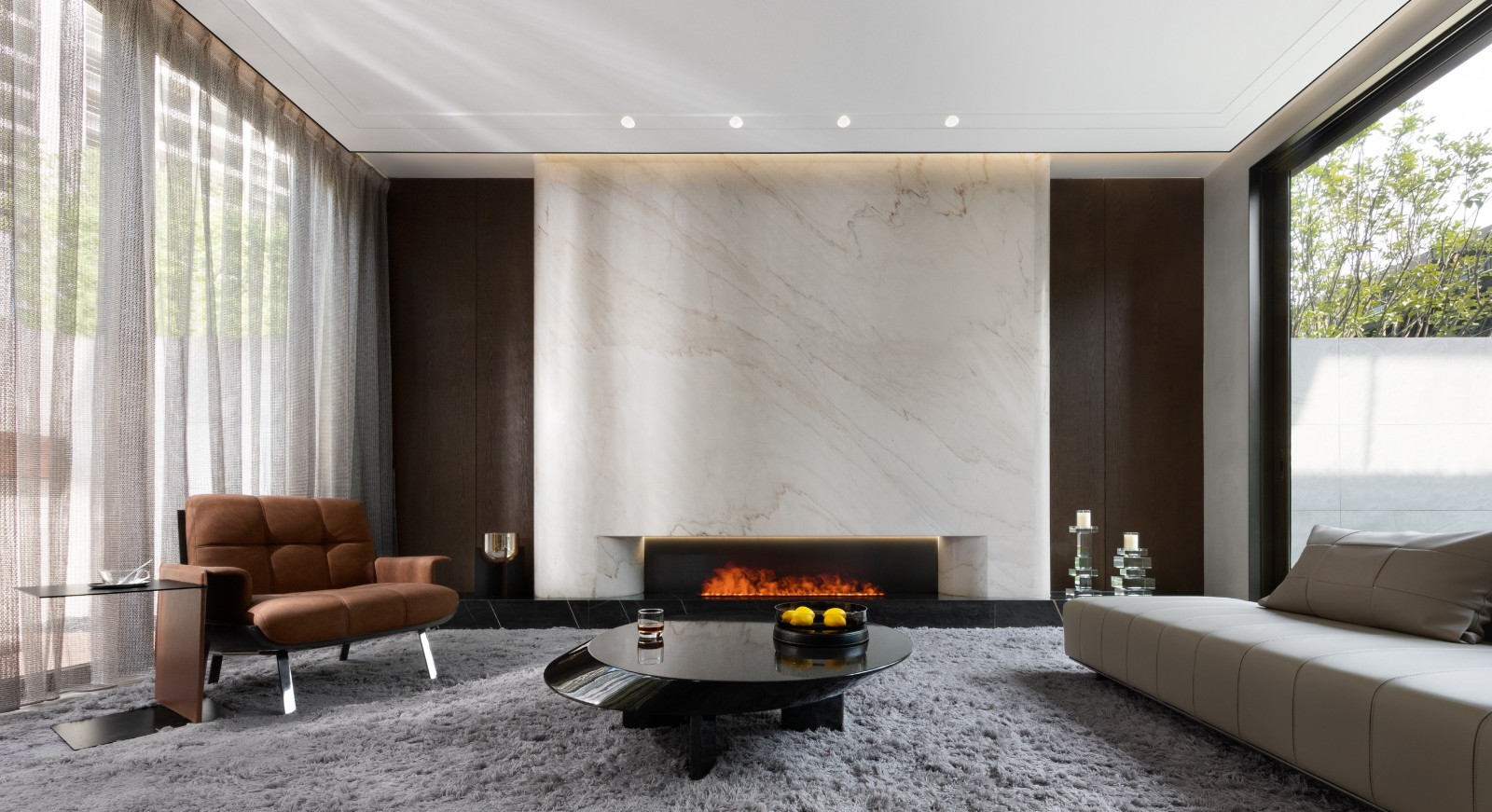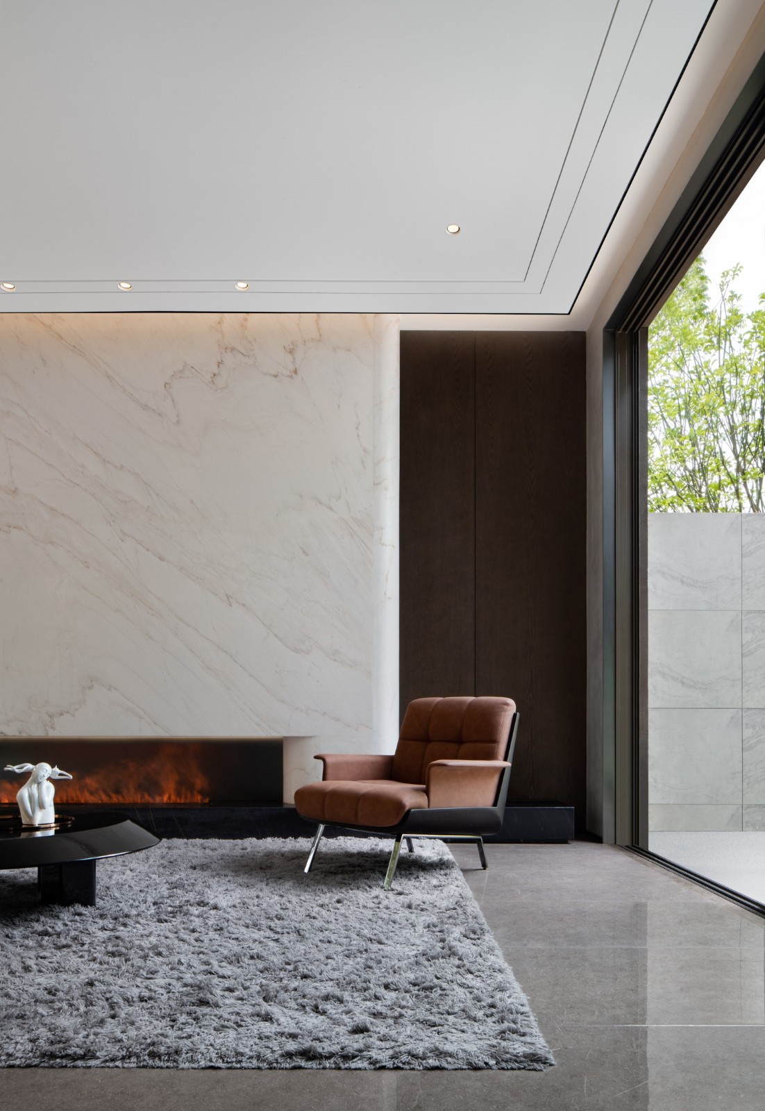 濃郁的深棕木紋、潔白的大理石、硬朗的皮革共同延續(xù)著待客空間的色彩脈絡(luò)與美學(xué)肌理,全景式落地門窗收納著來著戶外的陽光與綠意。
