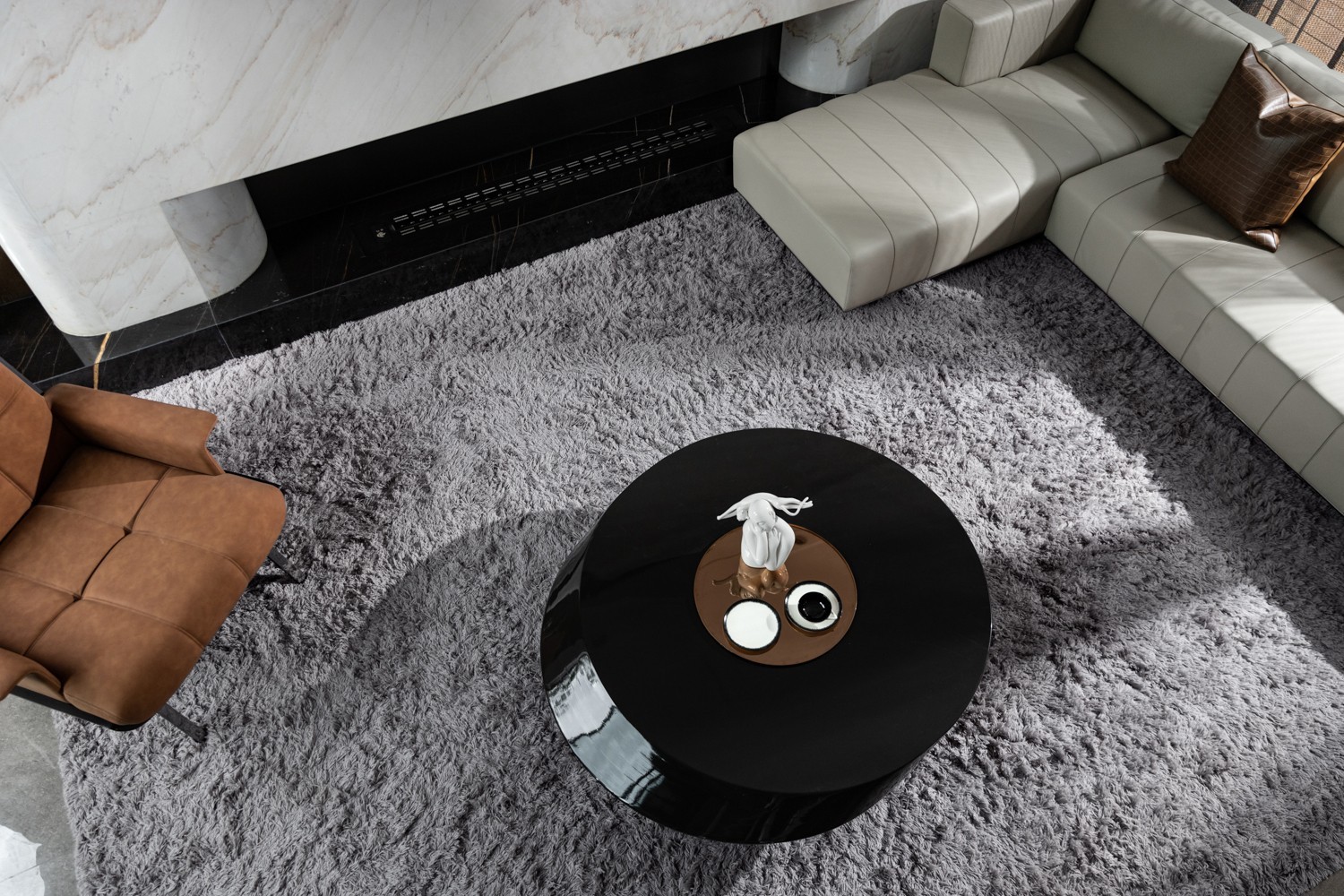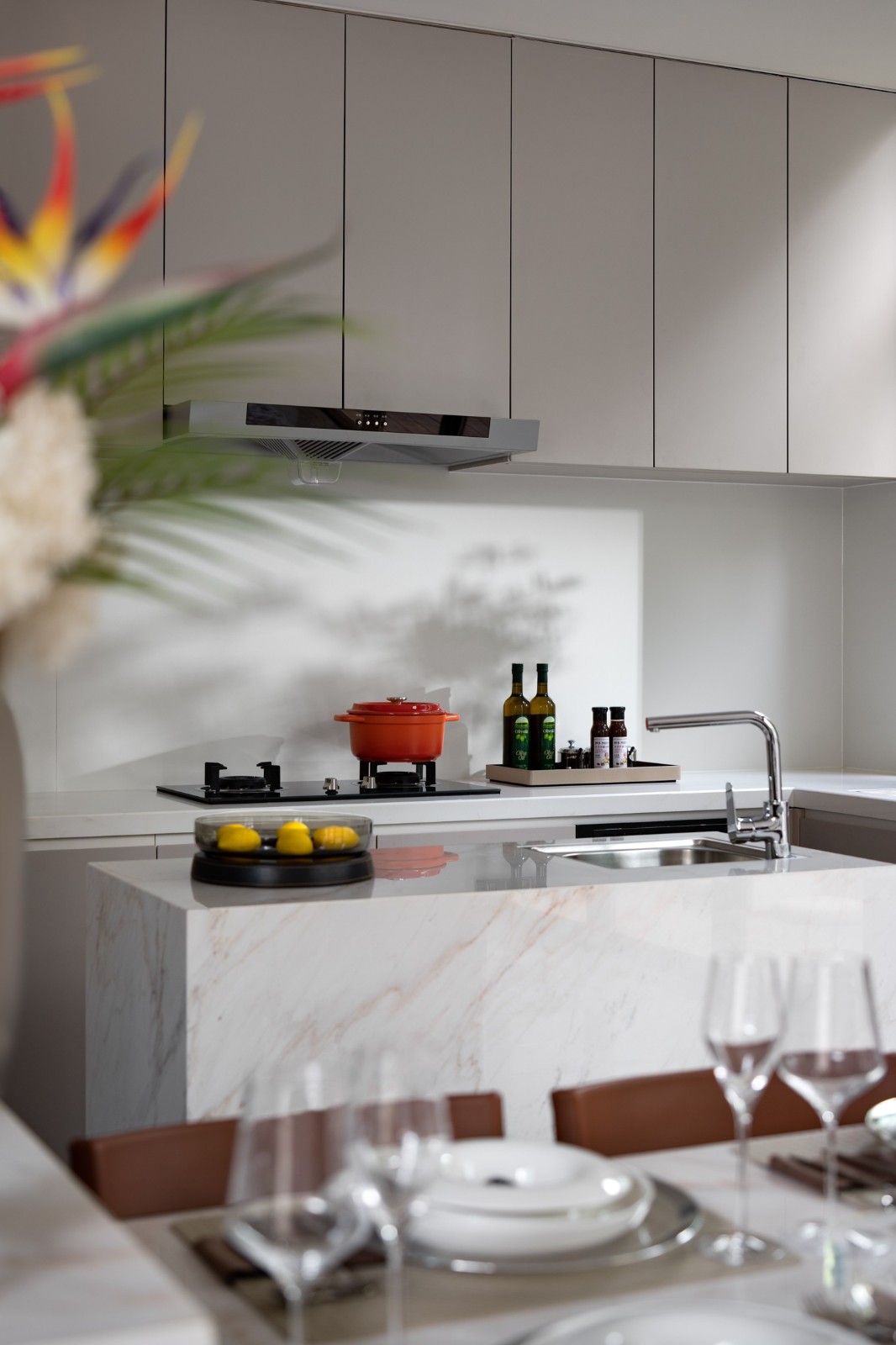 歸家動(dòng)線自負(fù)一層車庫延伸開來,無縫連接會(huì)客空間,高聳濃郁的深棕木紋,調(diào)和潔白雅致的大理石立面,自帶中性氣息的硬朗皮革坐椅和沙發(fā),將空間氣息勾勒得猶如意式濃縮一般,濃厚香醇且回味無窮。