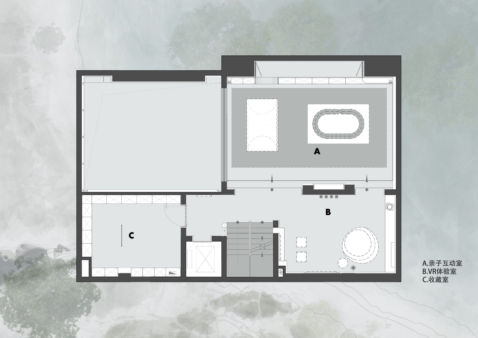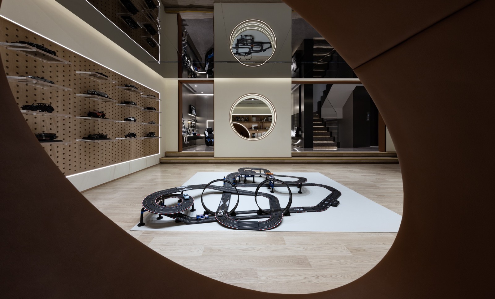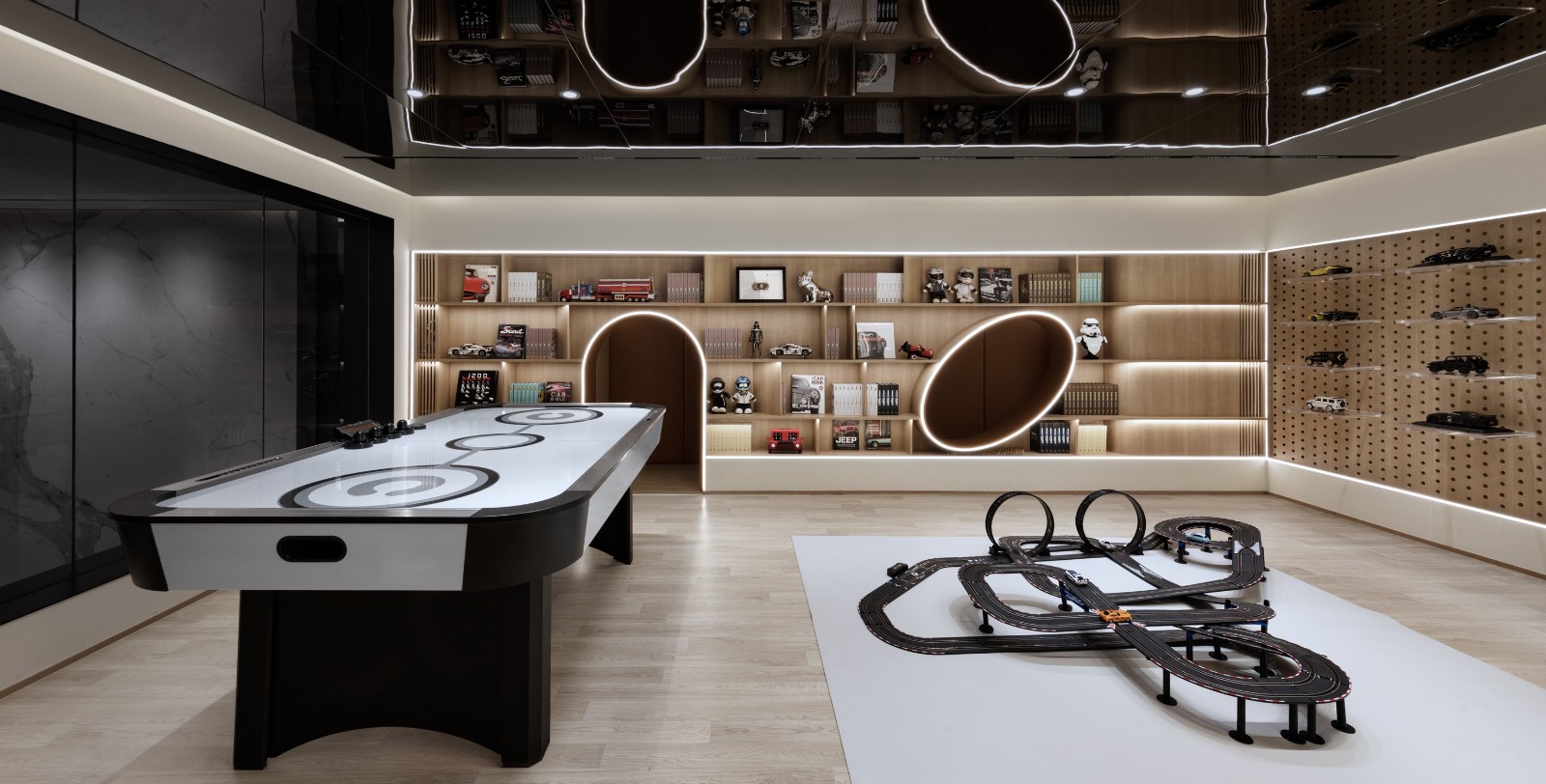 考慮負(fù)一夾層的層高,突破建筑初始層板邊界拓展垂直空間尺度,采用下沉的設(shè)計(jì)手法構(gòu)建親子游戲室,并結(jié)合原有梁架結(jié)構(gòu)打造了整面可收納的展示柜體,在柜體內(nèi)部空間巧妙地設(shè)置可供兒童穿梭嬉戲的隧道。