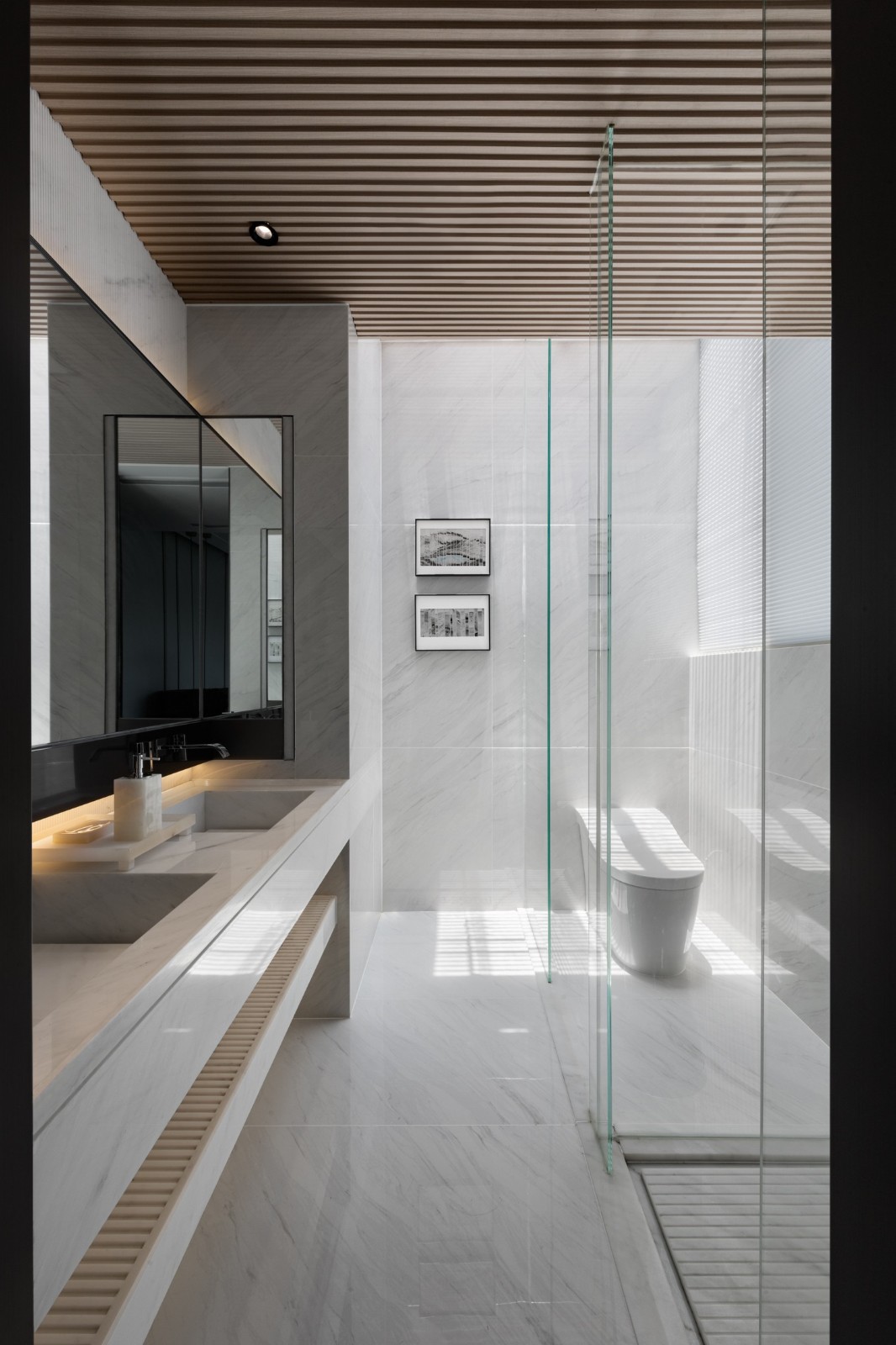 運(yùn)用落地玻璃打造了一條室內(nèi)景觀廊道,玻璃扶手的樓梯在空間視覺上取得精妙的平衡,空間變得通透同時(shí)延展著空間尺度,溫潤的燈光將空間浸潤得平靜而柔和。