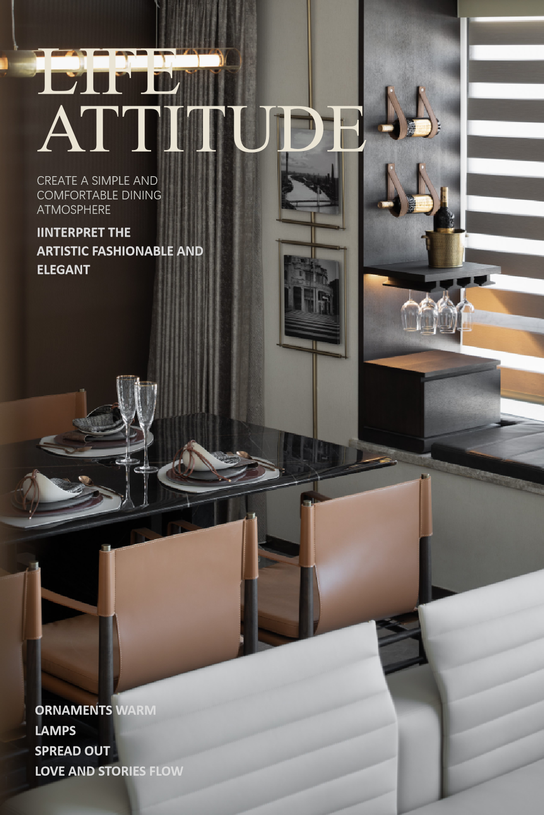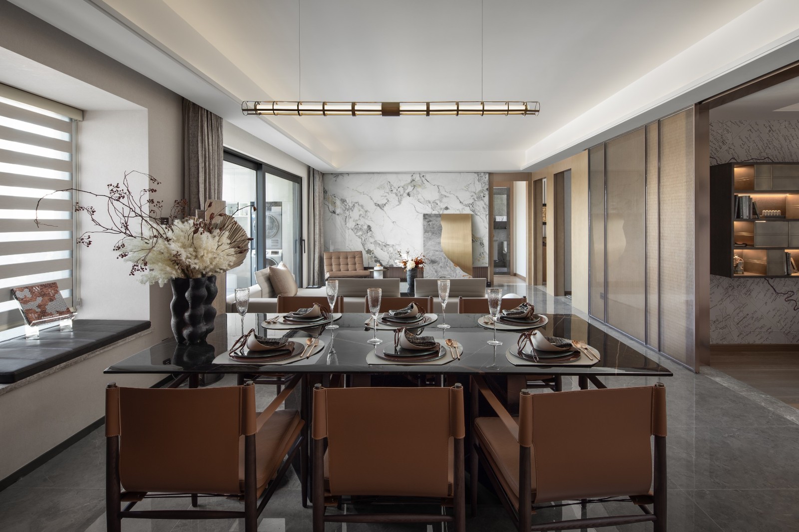 跟隨墻面的攝影作品,我們看到了男主人對于生活感性的一面,他們對于自我的釋放是內(nèi)斂的、穩(wěn)重的,咖色桌椅與大理石形成統(tǒng)一視覺,筆直的線條呈現(xiàn)簡約低調(diào)的空間氣質(zhì)。
