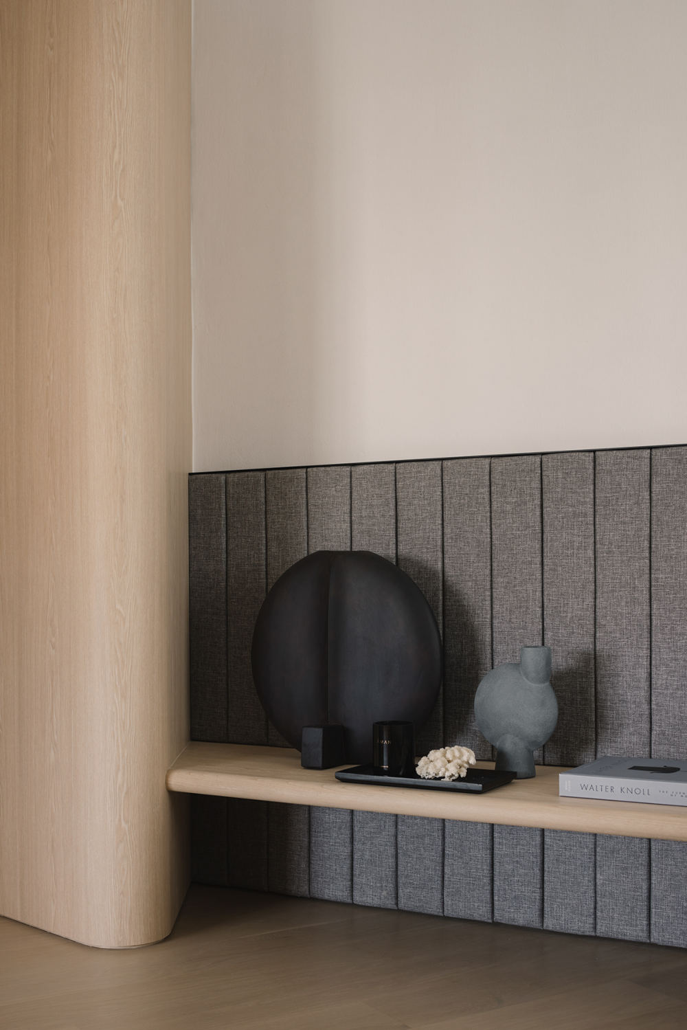 這種平靜也被帶入了主臥室。同樣的橡木飾面和彎曲的姿態(tài)被用來保持這個(gè)空間的柔軟和通風(fēng);帶軟墊的床頭包裹著有紋理的灰色織物,使房間更具質(zhì)感和柔和。通過間接照明進(jìn)一步增強(qiáng)了這一點(diǎn),真正讓人們舒適地撤退。