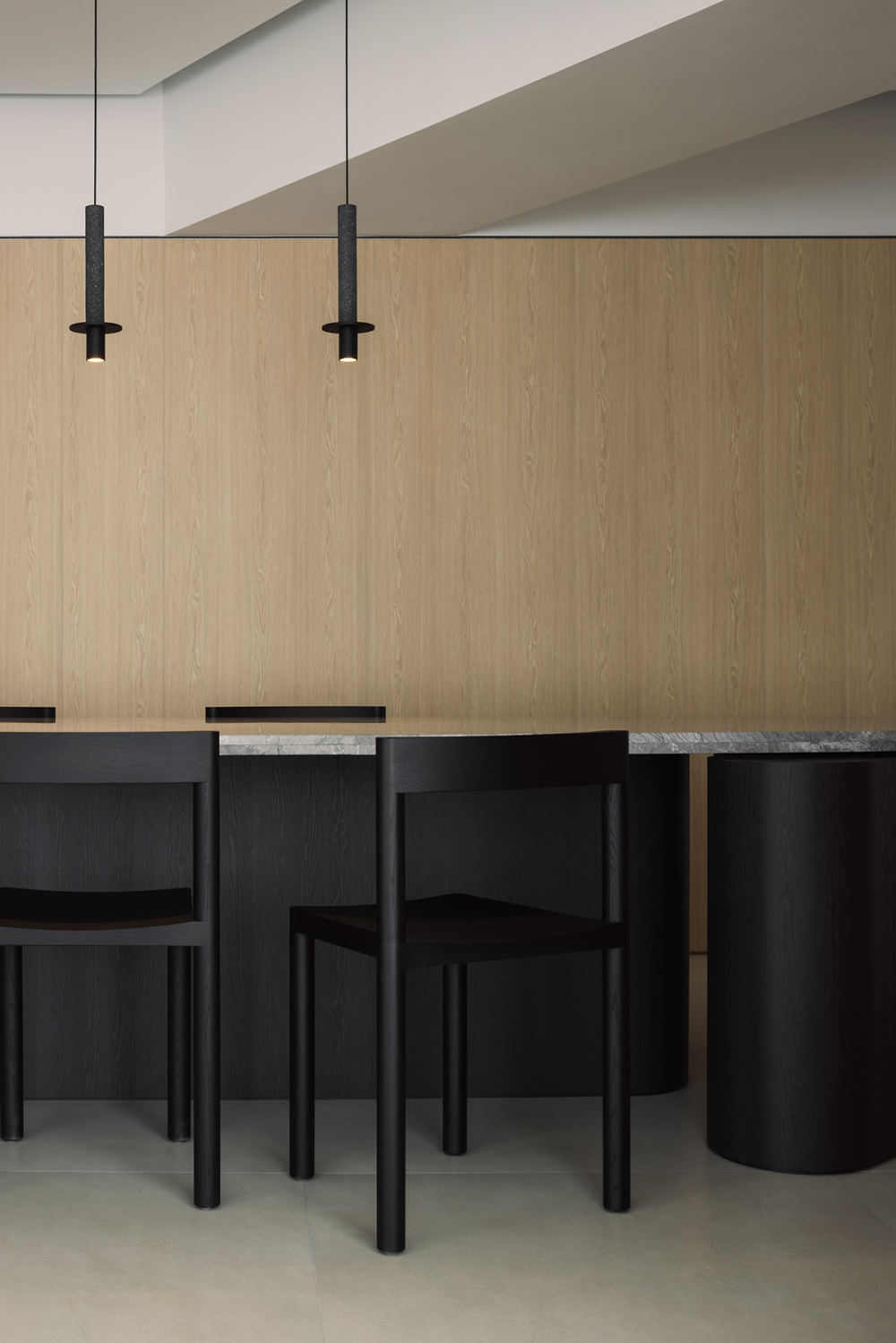 現(xiàn)有的較高樓層有助于將用餐區(qū)與起居區(qū)區(qū)分開來,同時(shí)仍保持兩個(gè)空間之間的視覺連通性。在那個(gè)用餐區(qū)內(nèi)有一張定制的餐桌,上面包裹著黑色的木材飾面和精致的灰色大理石臺(tái)面,增添了一種奢華感,因?yàn)樗谶@個(gè)空間內(nèi)并置為一個(gè)個(gè)性鮮明的作品。