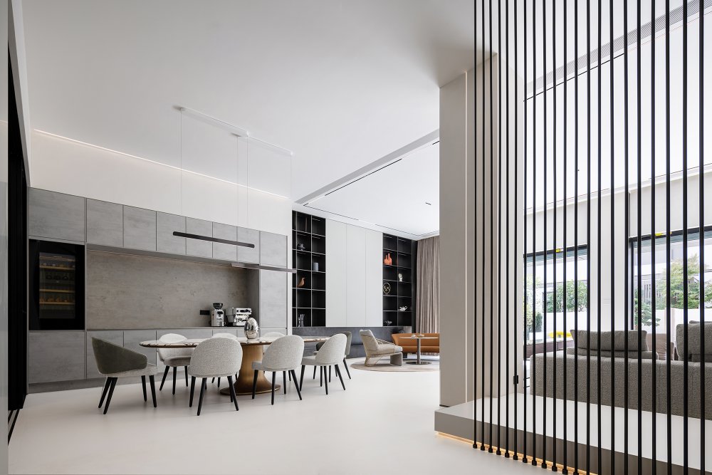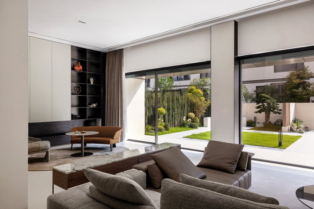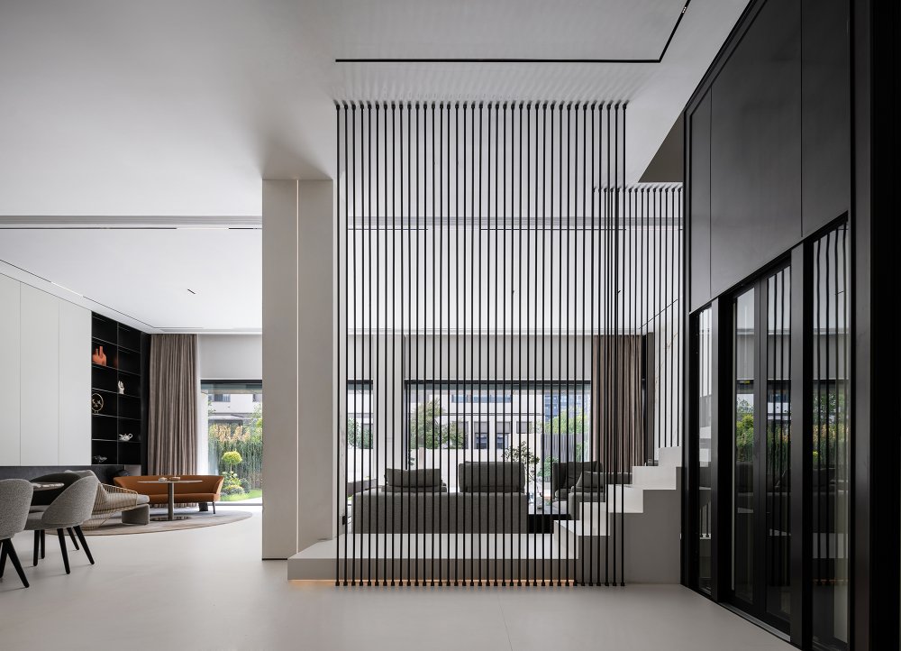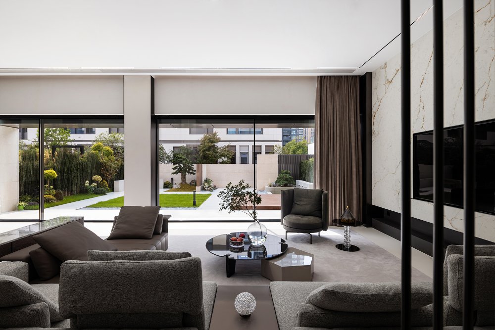 通過庭院步入客廳,閑坐于客廳的沙發(fā),任何位置都不會(huì)錯(cuò)過飽覽庭院美景的機(jī)會(huì)。南向超大面積的極窄邊電動(dòng)玻璃移門,最大限度地讓自然光進(jìn)入室內(nèi)。光與影的交織,是空間最靈動(dòng)的所在。