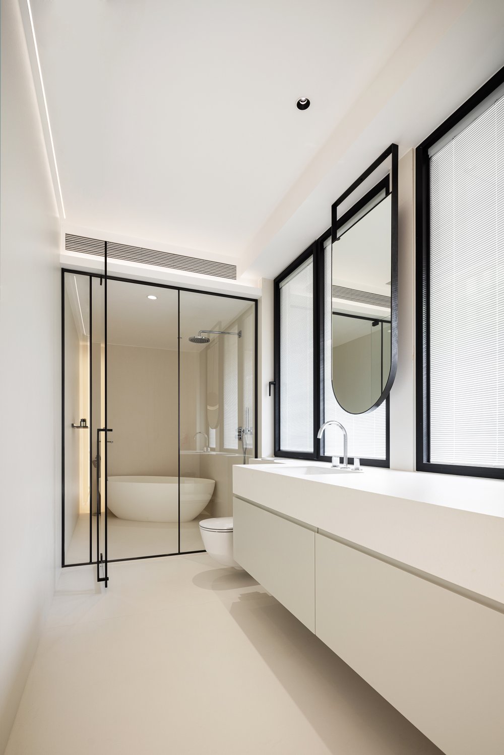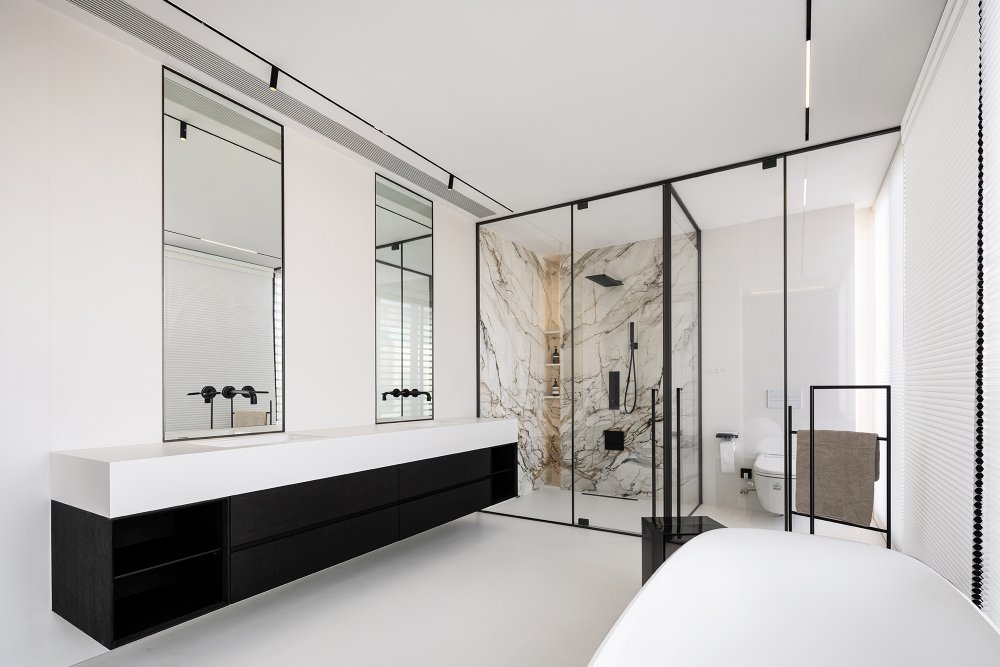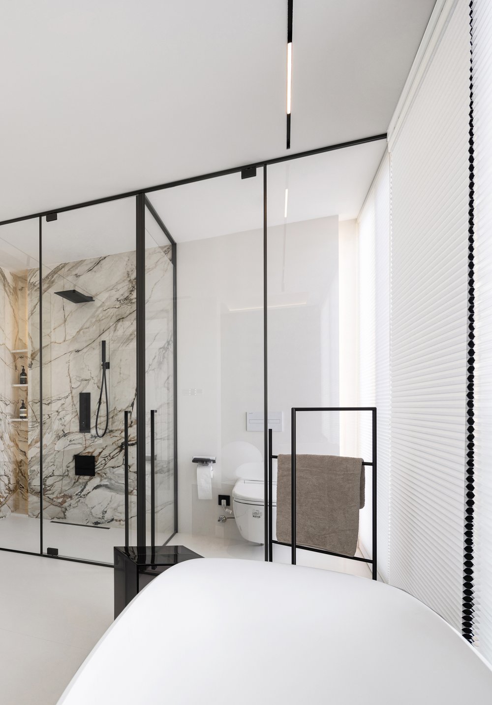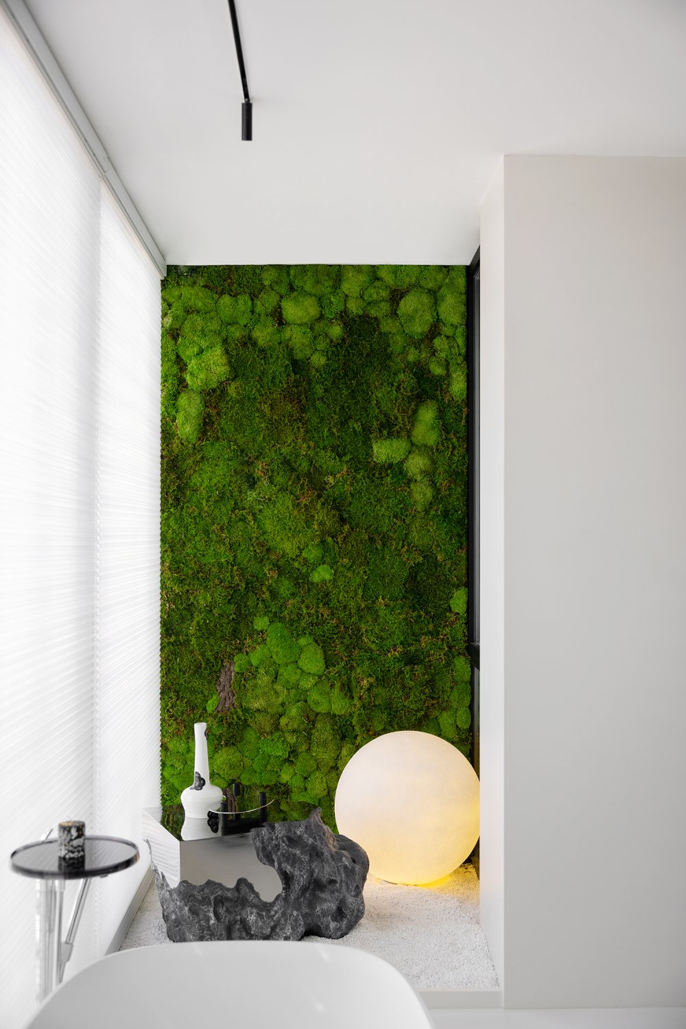 衛(wèi)生間的格柵和落地玻璃窗亦可隨心情打開或關(guān)閉,浴室的一整面墻也設(shè)計(jì)了垂直綠化,透過淺淺的光,新鮮的綠植在純凈的白色巖板襯托下更顯得生機(jī)盎然。