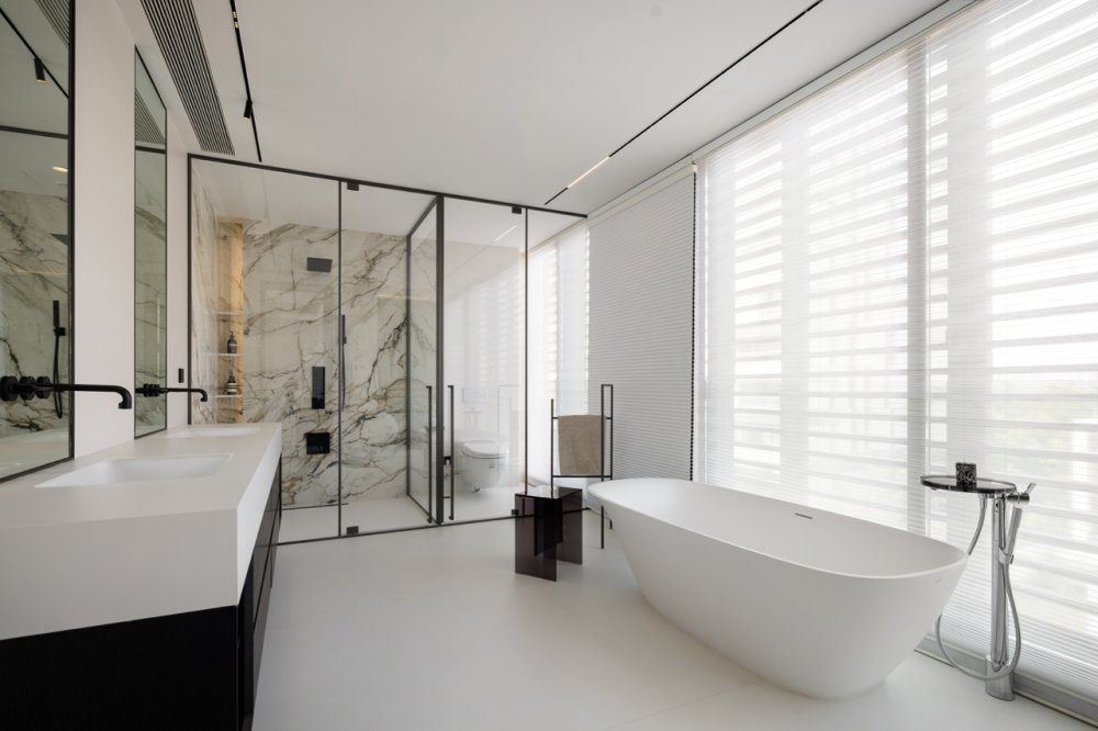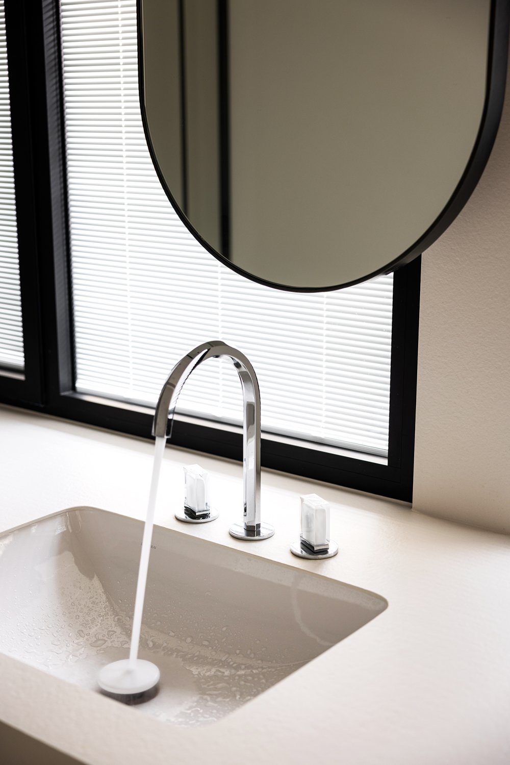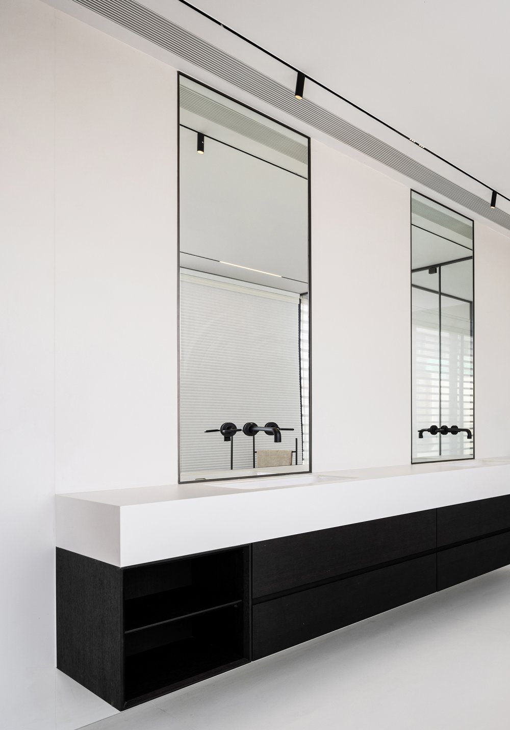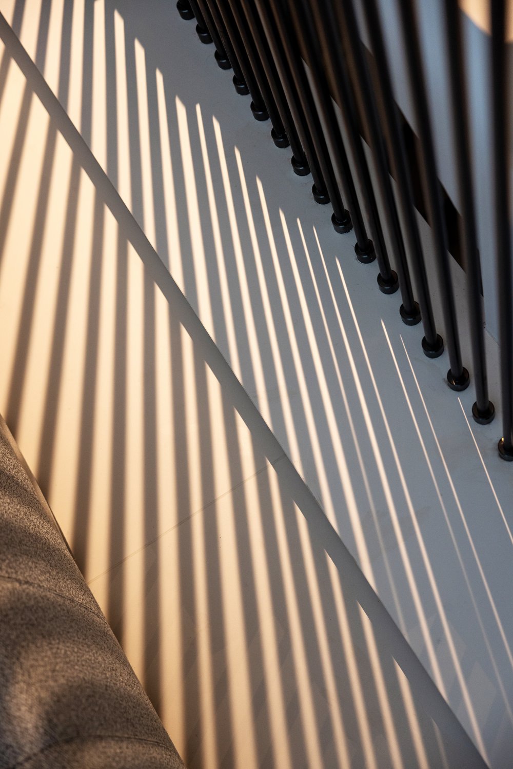 衛(wèi)生間的格柵和落地玻璃窗亦可隨心情打開或關(guān)閉,浴室的一整面墻也設(shè)計(jì)了垂直綠化,透過淺淺的光,新鮮的綠植在純凈的白色巖板襯托下更顯得生機(jī)盎然。