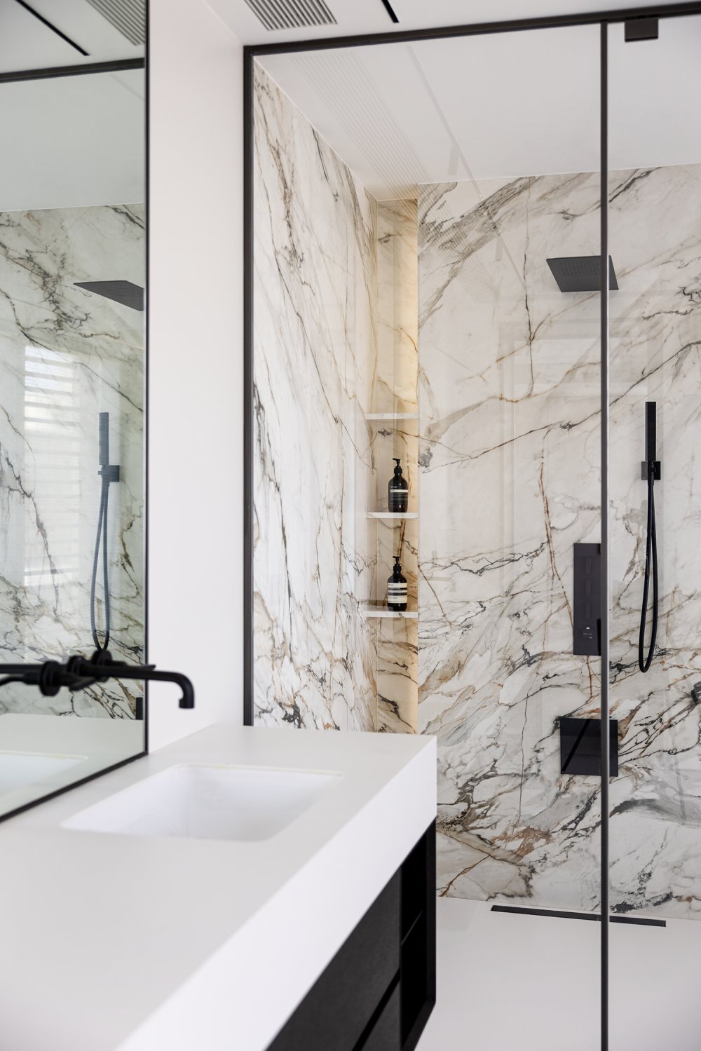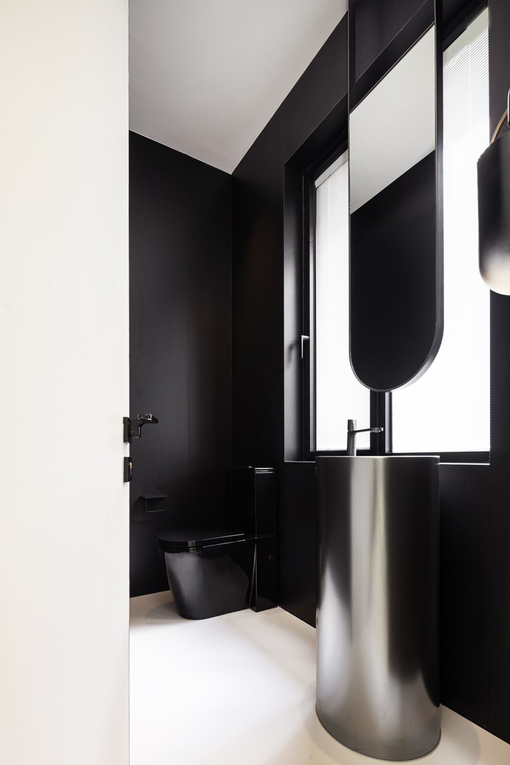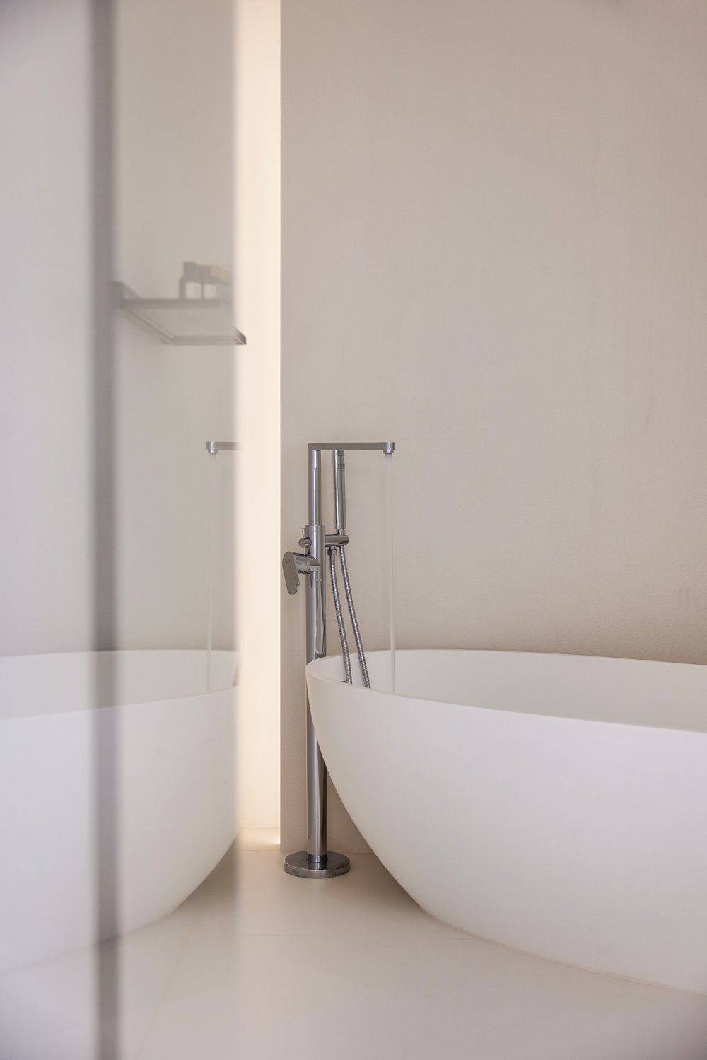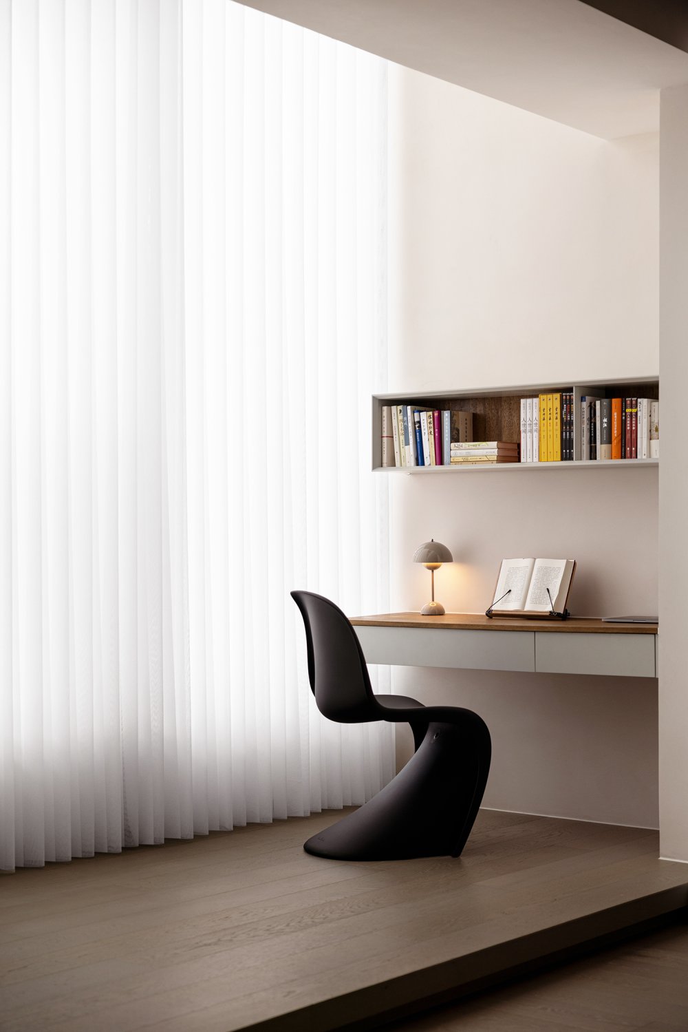 衛(wèi)生間的格柵和落地玻璃窗亦可隨心情打開或關(guān)閉,浴室的一整面墻也設(shè)計(jì)了垂直綠化,透過淺淺的光,新鮮的綠植在純凈的白色巖板襯托下更顯得生機(jī)盎然。