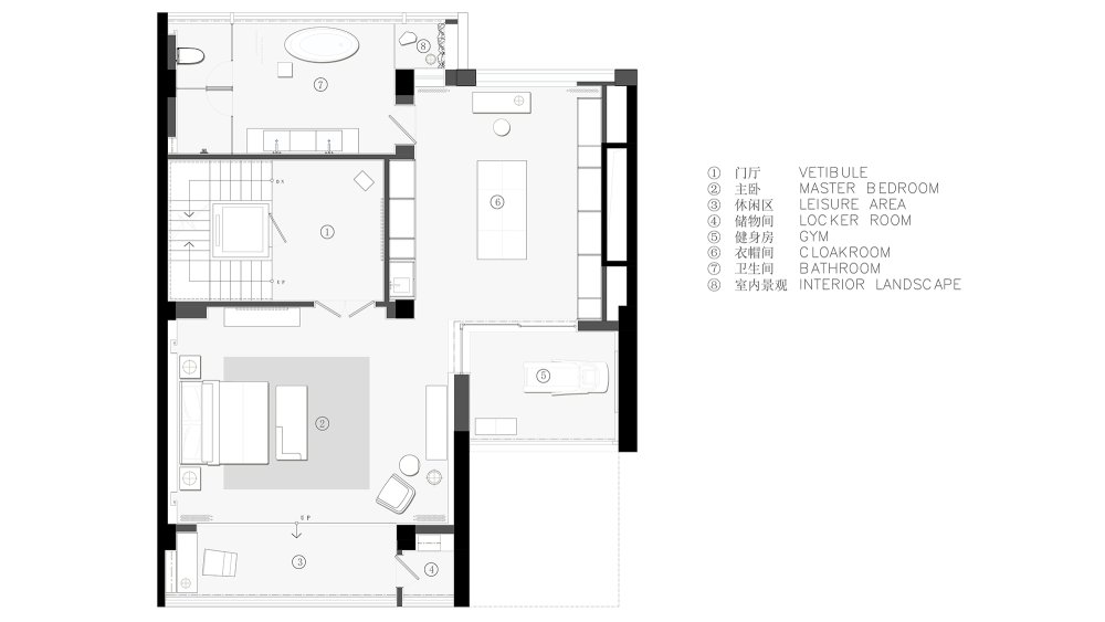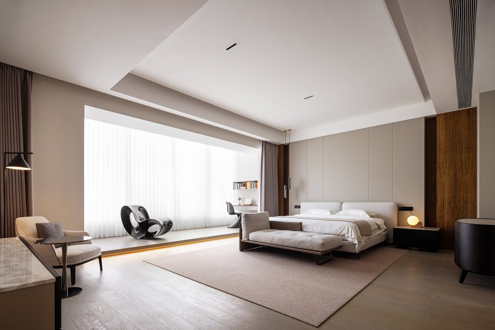 三層整層是業(yè)主的起居室,除了臥室外,還配備了衣帽間、水吧臺(tái)、衛(wèi)生間、健身房、書吧等。臥室陽臺(tái)的日光可充分灑進(jìn)房間。