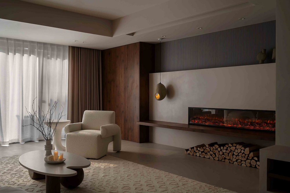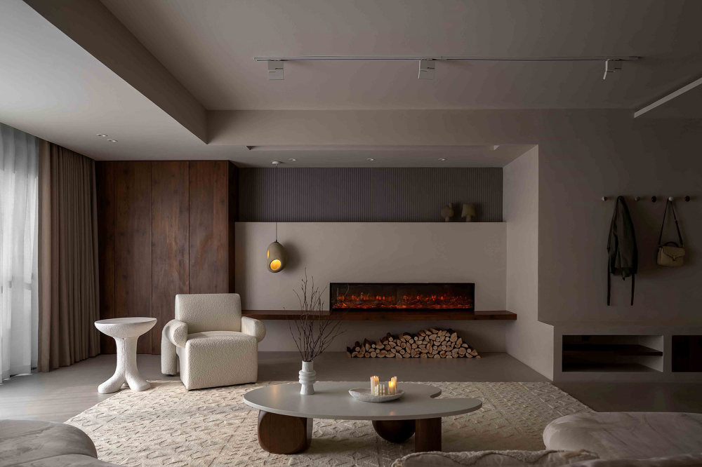 硬裝上:設(shè)計師采用全屋微水泥, 加上逼真的實木的板材來整體打造全屋格調(diào), 電子壁爐與木柴放在一起, 等著在秋冬來臨之際, 讓濕冷的重慶也顯得不那么寒冷。軟裝上,無需過多色彩,用淡雅從容的顏色即可。不必過于復(fù)雜的線條元素以大地、草木、云朵色系為主,家具選擇布藝,樸實而親切。