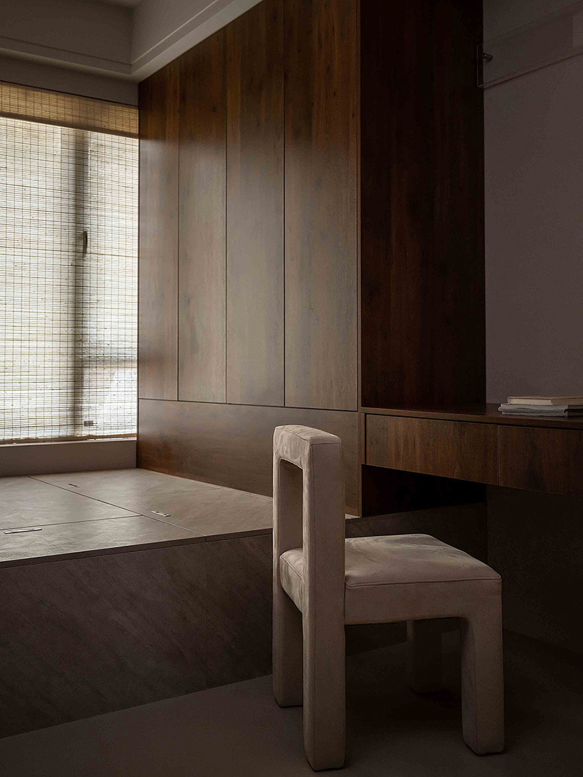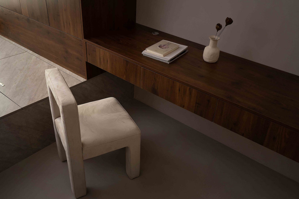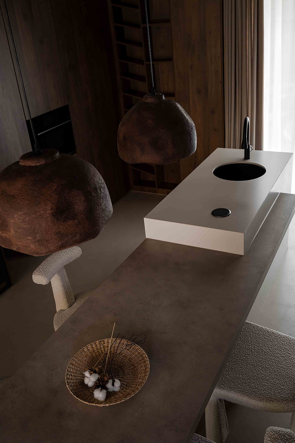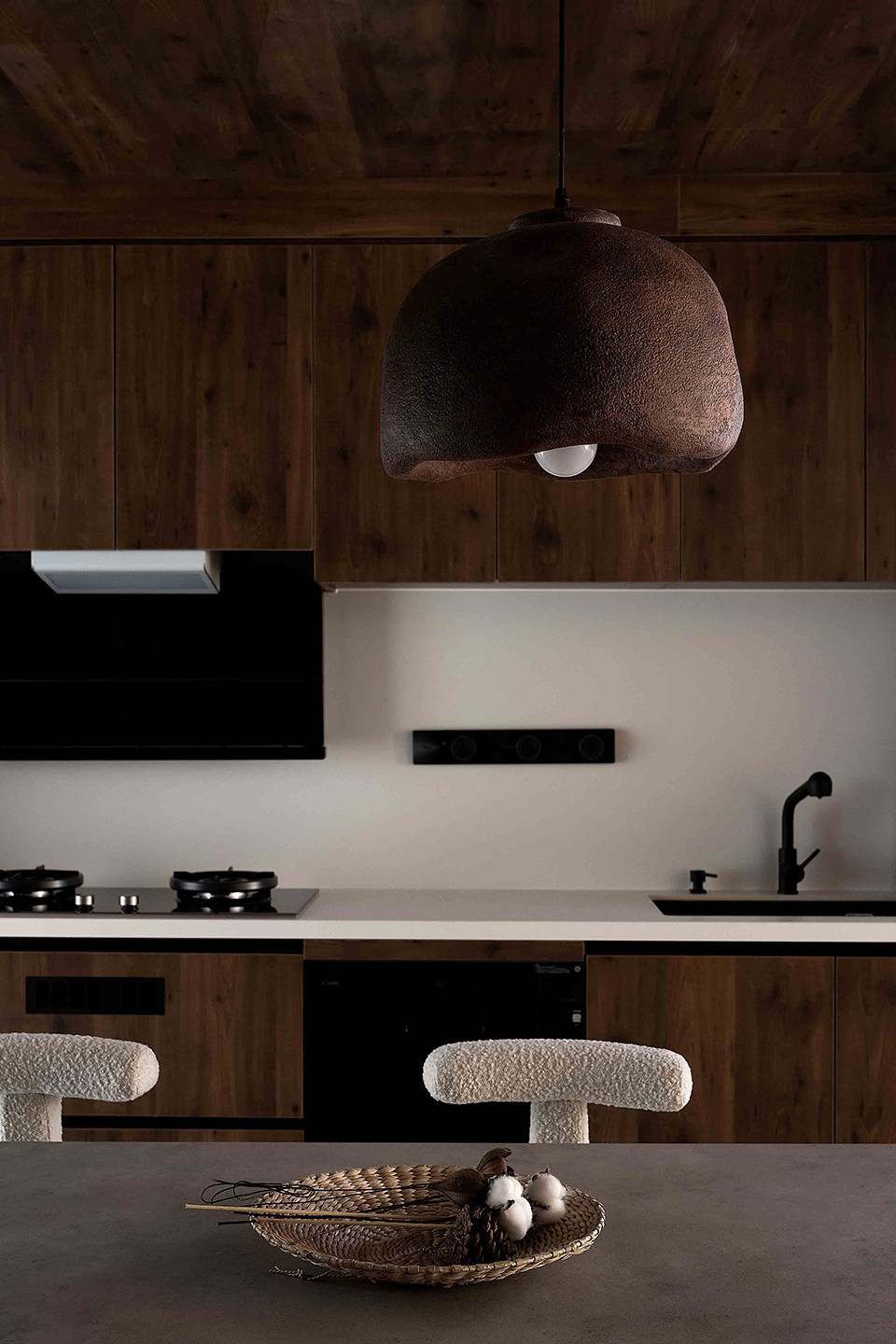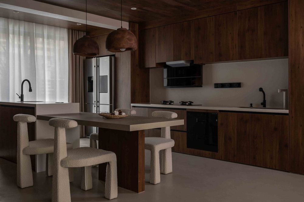 餐廚是最具煙火氣息的地方。中西廚的規(guī)劃,正符合屋主小云的心意 開放式廚房讓烹飪也變得有趣。廚房一面作為蒸烤與紅酒柜的西廚功能 一面作為清洗、烹炒的中廚功能。四人位餐廳營造就餐的儀式感,椰子殼餐燈獨具一格。