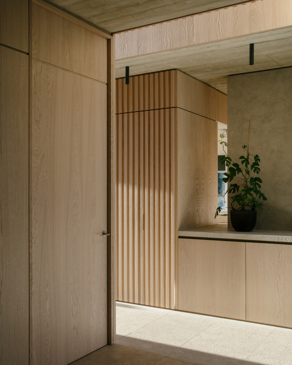 - 這些材料以粗略但熟練的方式應(yīng)用。 天然石材地板和橡木細(xì)木工制品經(jīng)過拉絲處理,增添了獨(dú)特的觸感。 木制品簡潔,沒有多余的裝飾,就像建筑的骨架。 書架和廚房設(shè)備部分開放,櫥柜門采用木板條和明顯的把手,門道不僅沒有隱藏,而且突出突出。 為了將室外帶入室內(nèi),每個空間都裝飾有合適的家具、裝飾、建筑照明,以及站立和懸掛的植物。 這已經(jīng)擴(kuò)展到外面,露臺和室外廚房位于遮陽篷的陰影下。