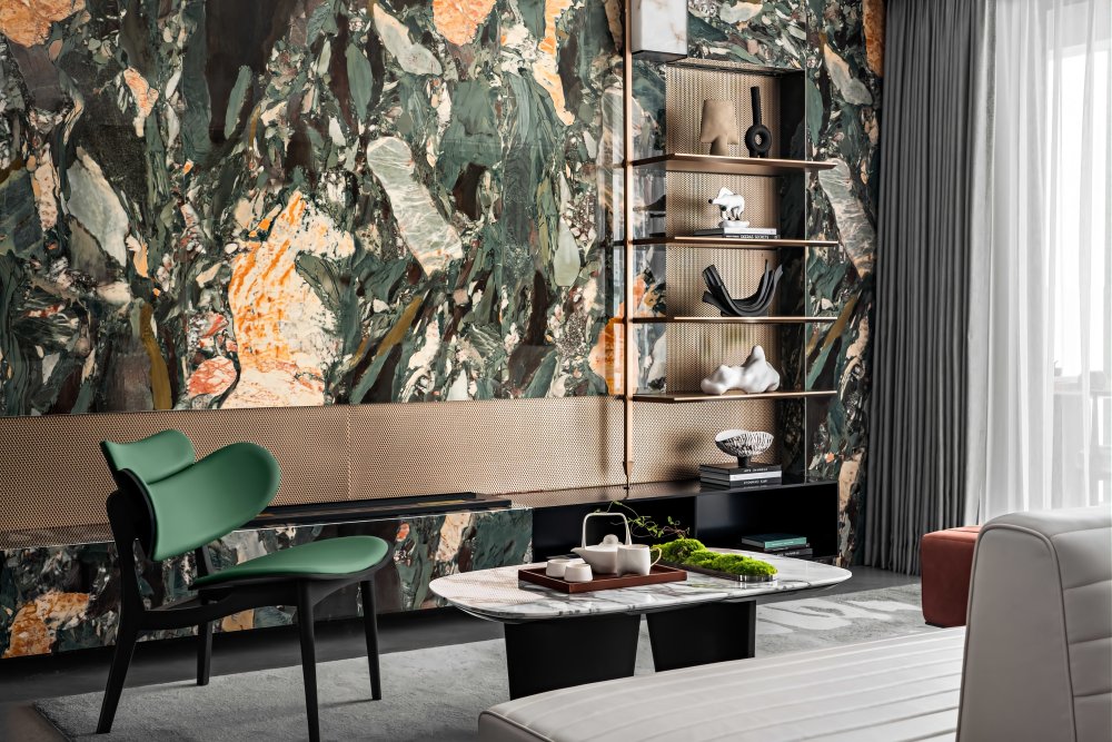 透過色彩的轉(zhuǎn)換定義空間不同主題的情緒表現(xiàn),原始森林般的大理石墻面帶來自然特色,開放式的空間架構(gòu)透過型態(tài)的切割,創(chuàng)造出不同框架式戶型上的空間效果。