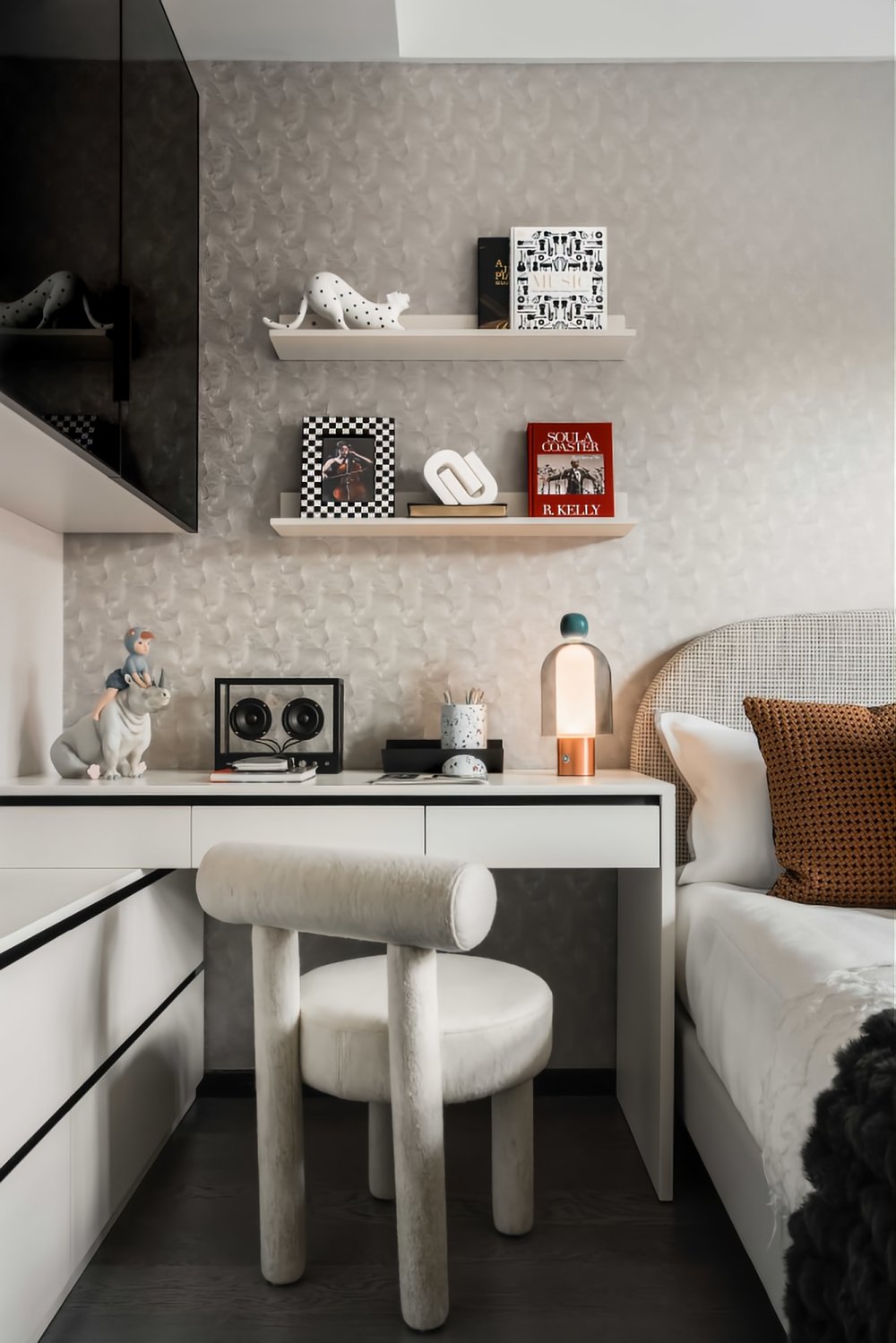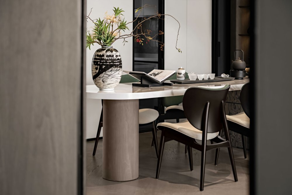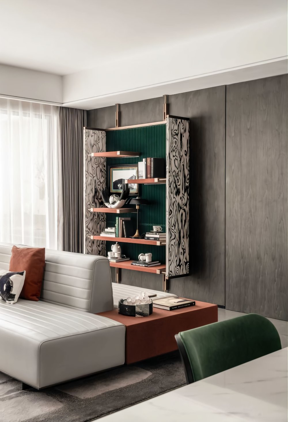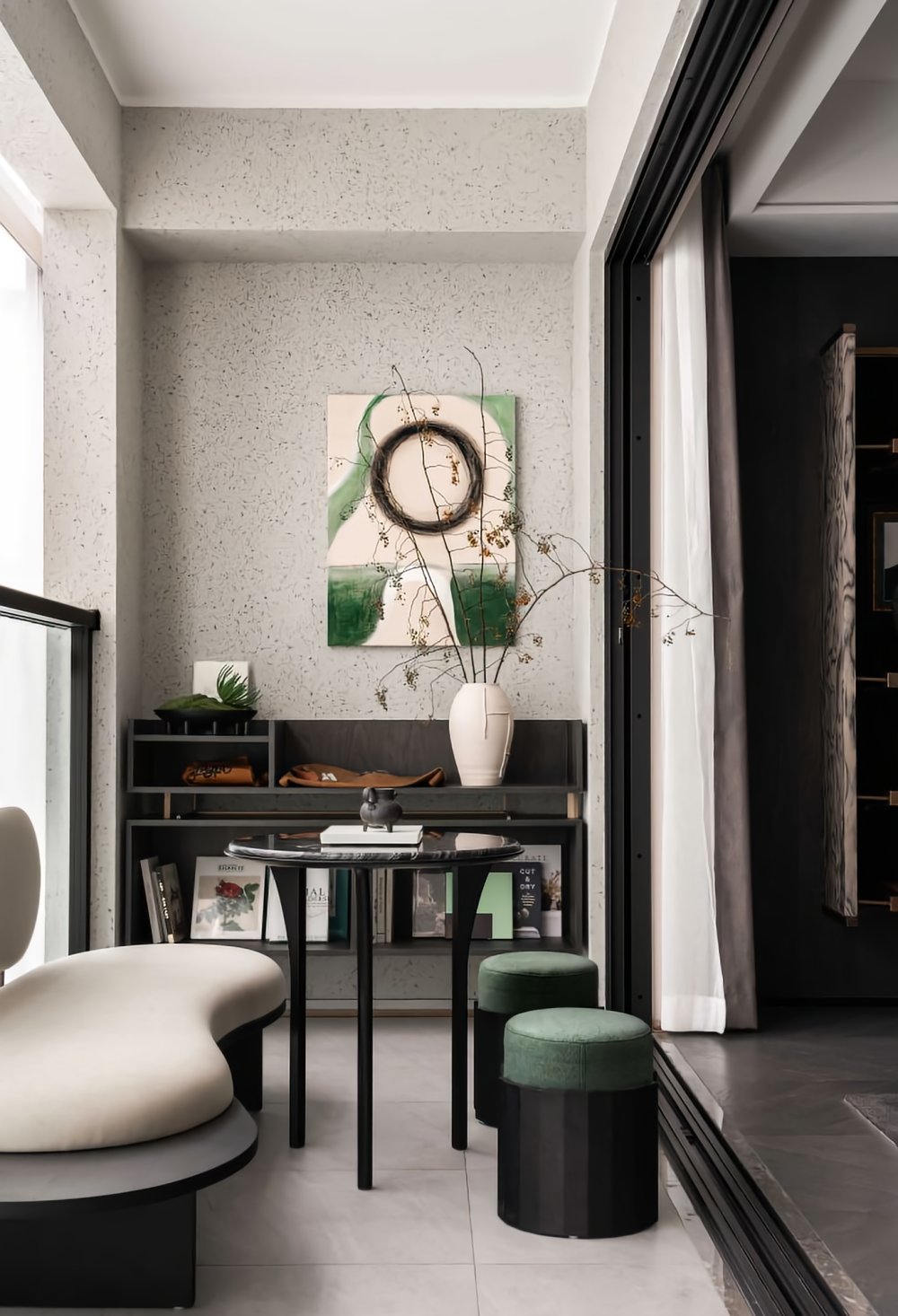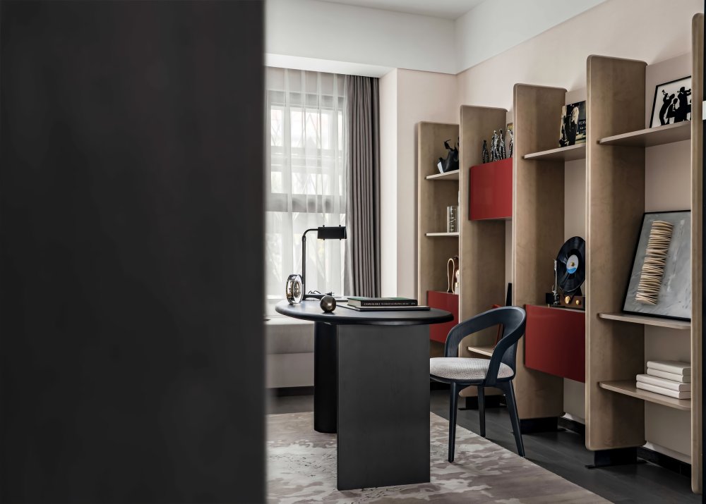 以現(xiàn)代主義去融合江南文人的含蓄與靜默,書房中以大面積陳列架衡量空間尺度,突破傳統(tǒng)書房的采光樣貌,搭配落地飄窗,引入自然光以慰藉內(nèi)心的精神世界。