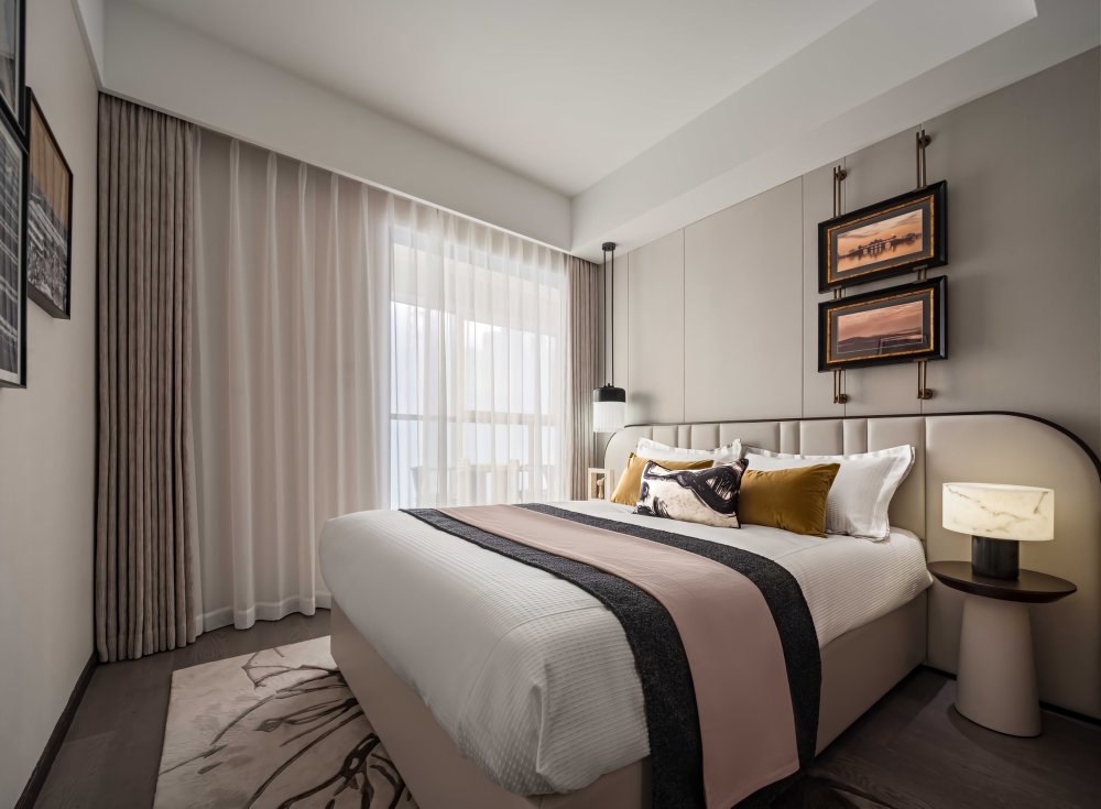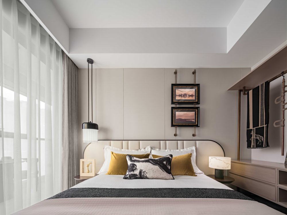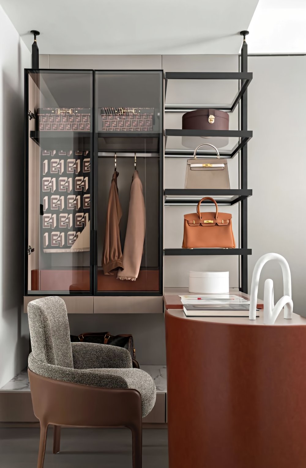 隨著空間動(dòng)線步入主臥,才算是進(jìn)到空間敘事的高潮。衣帽間與梳妝臺(tái)貫通在一條視覺線上,全透明的飄窗予以空間溫柔的自然光線。