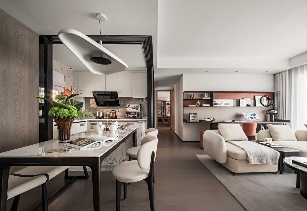 客廳根據(jù)光亮的材料和建筑線條再定義,大理石島臺(tái)與墻面不規(guī)則紋理塑造感性家居形式,從喧囂的城市中抽離,營造舒適、私密且平靜的居住空間。