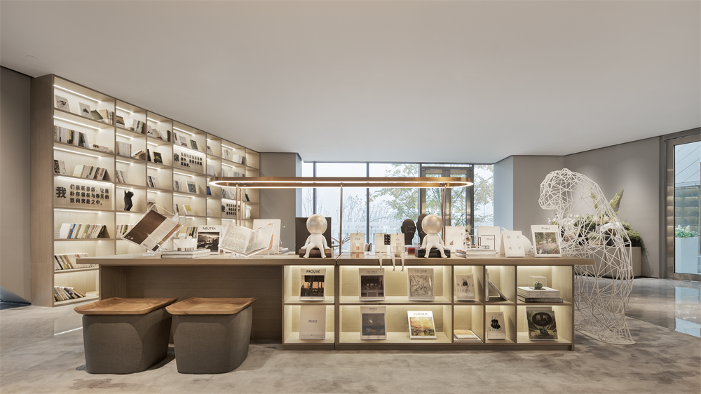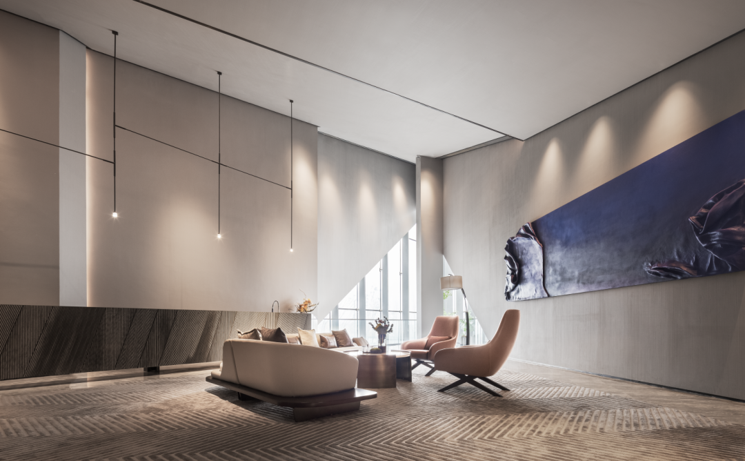整個(gè)空間定性為城市展廳,巨大玻璃幕墻將室外景色納入室內(nèi),在明亮的光線下,大型藝術(shù)品雕塑與蓬勃向上的植物相映成趣,訴說(shuō)著空間的張力與生機(jī),呼應(yīng)萬(wàn)科致力于和諧生態(tài)城市建設(shè)的理念。