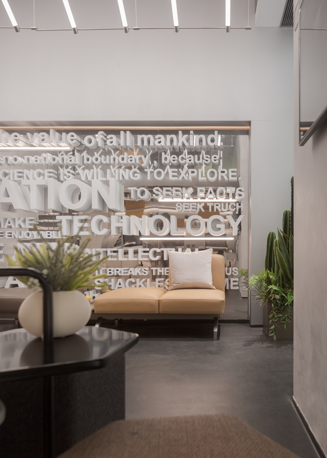打破傳統(tǒng)的空間界限,開放辦公區(qū)方便互相交流,鮮活的社交氣息,使空間氛圍變得親近而有趣。盡頭處意大利藝術(shù)家Biasi的作品《門》以虛擬運(yùn)動(dòng)學(xué)的概念呼應(yīng)Robot的主題。
