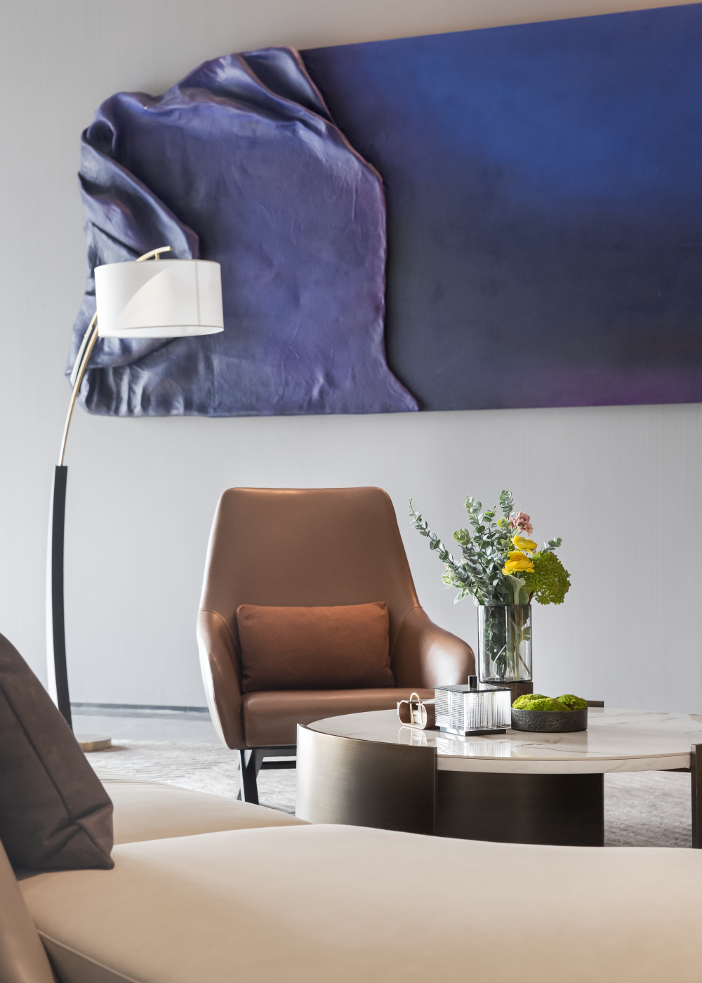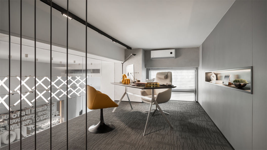總裁辦公室整體以灰色營(yíng)造出簡(jiǎn)約沉穩(wěn)的氛圍,空間內(nèi)的藝術(shù)擺件有著明顯的體塊感,為整個(gè)區(qū)域錦上添花。