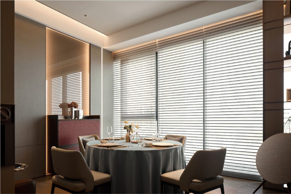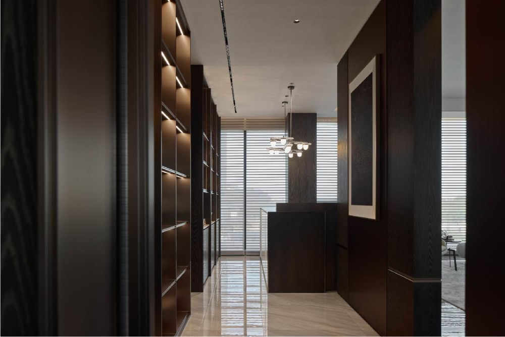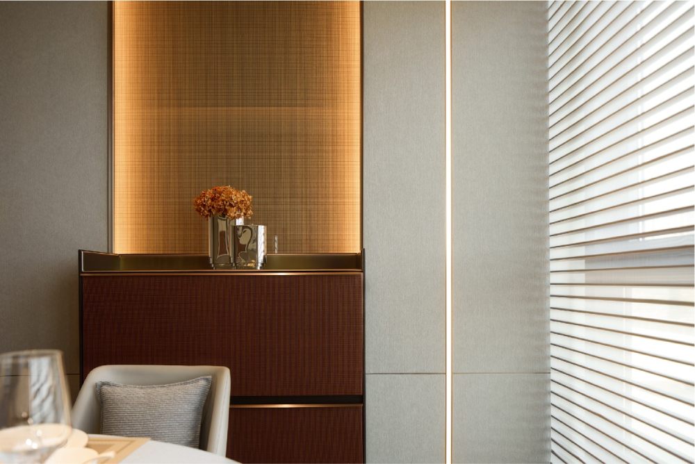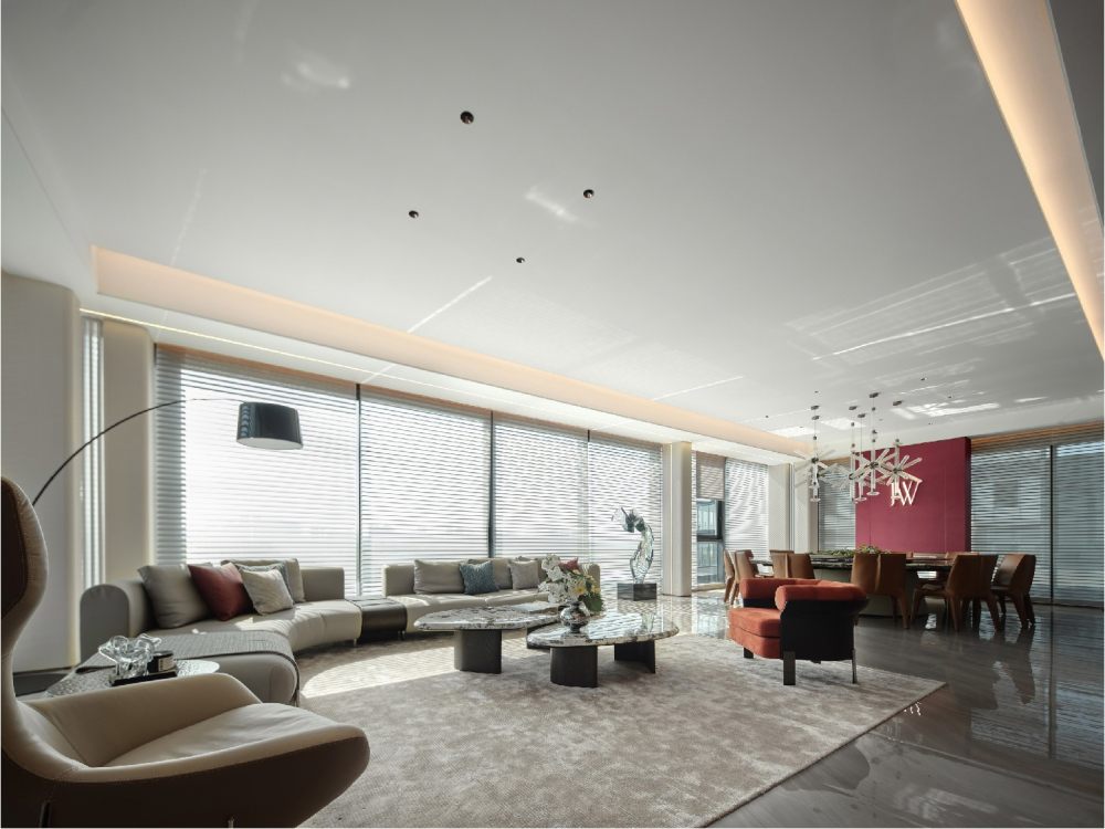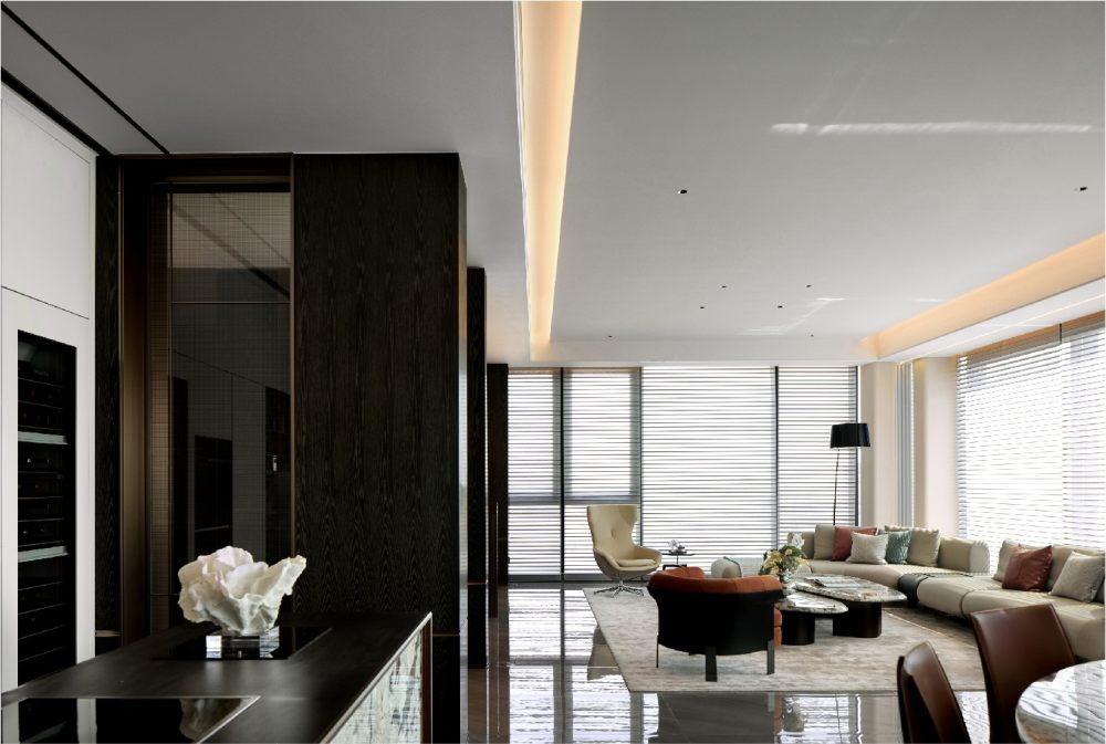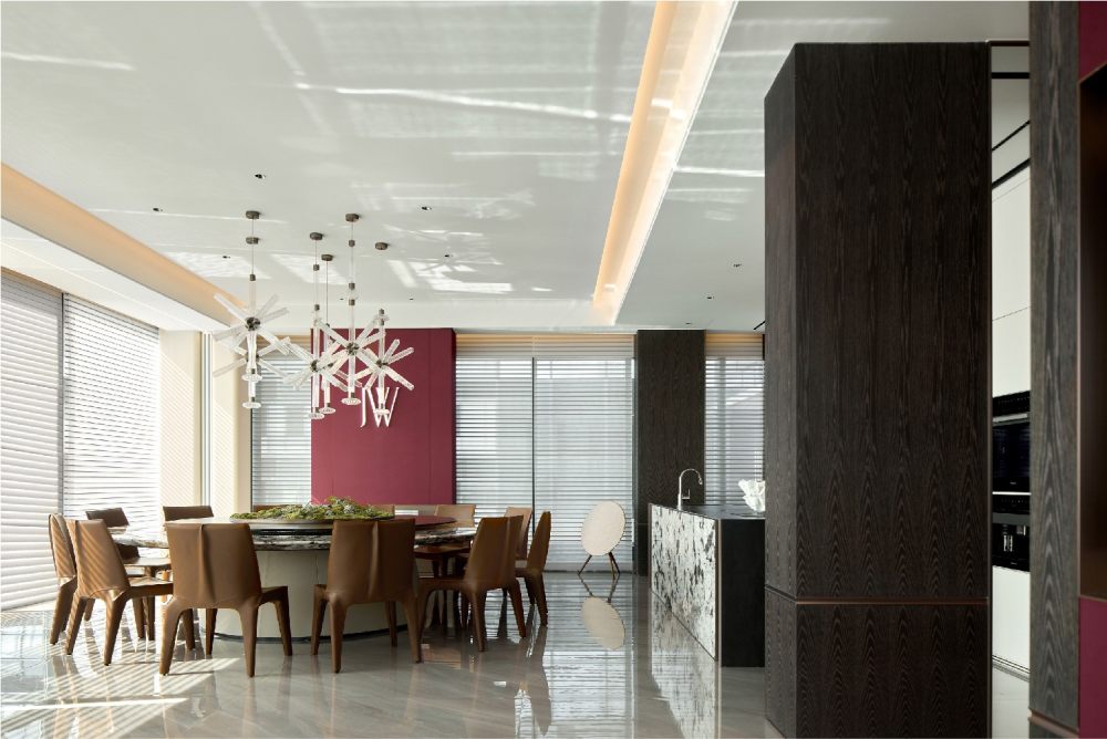 百葉簾將光的語素打破重組,展露出和諧柔暖的氣質(zhì),輔以線性光強調(diào)飾面奢感,從上至下地增加色彩的溫度,同時甄選灰色調(diào)陳設(shè),通過錯落形態(tài)創(chuàng)造新的意趣,經(jīng)由色彩碰撞傾訴溫馨氛圍。