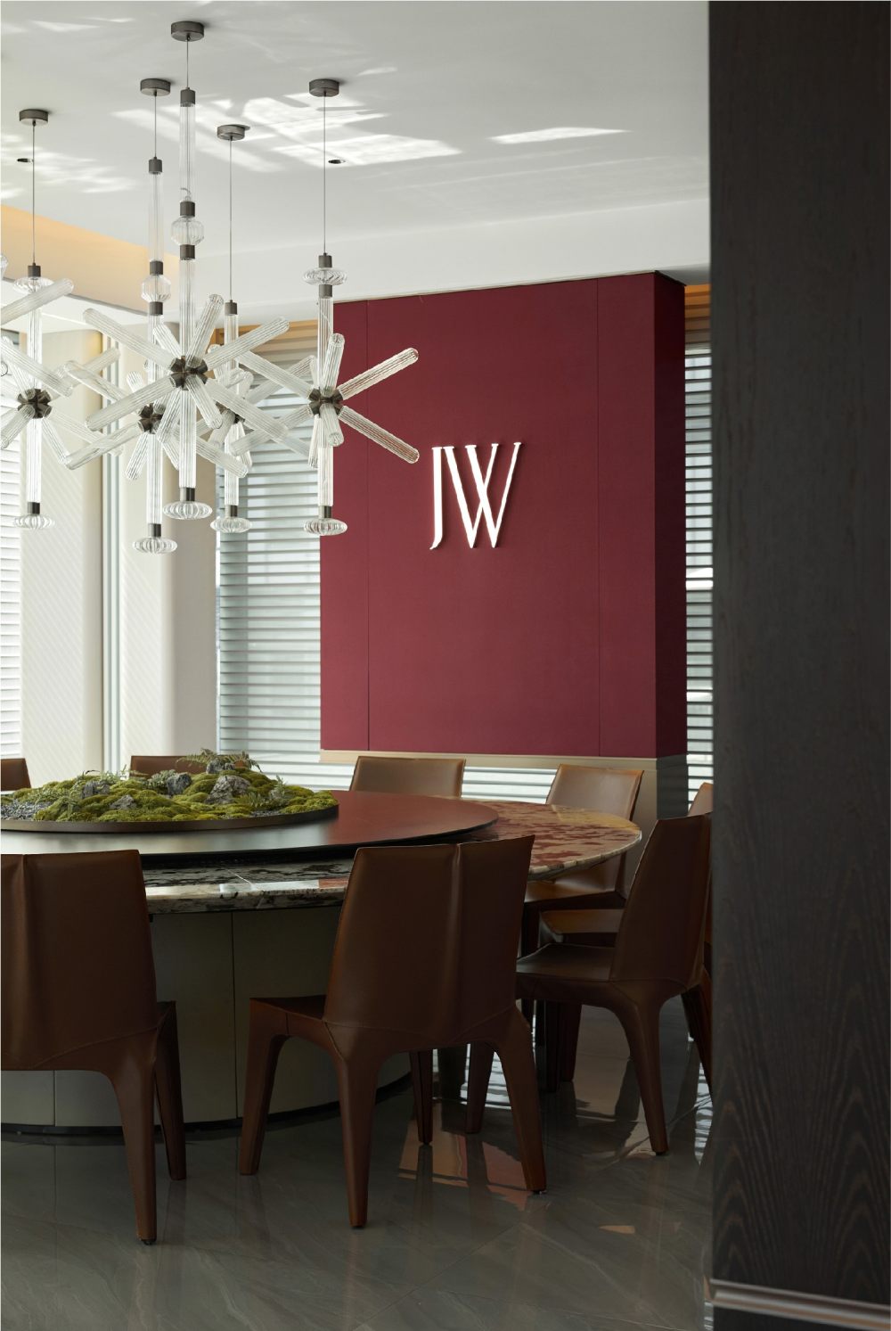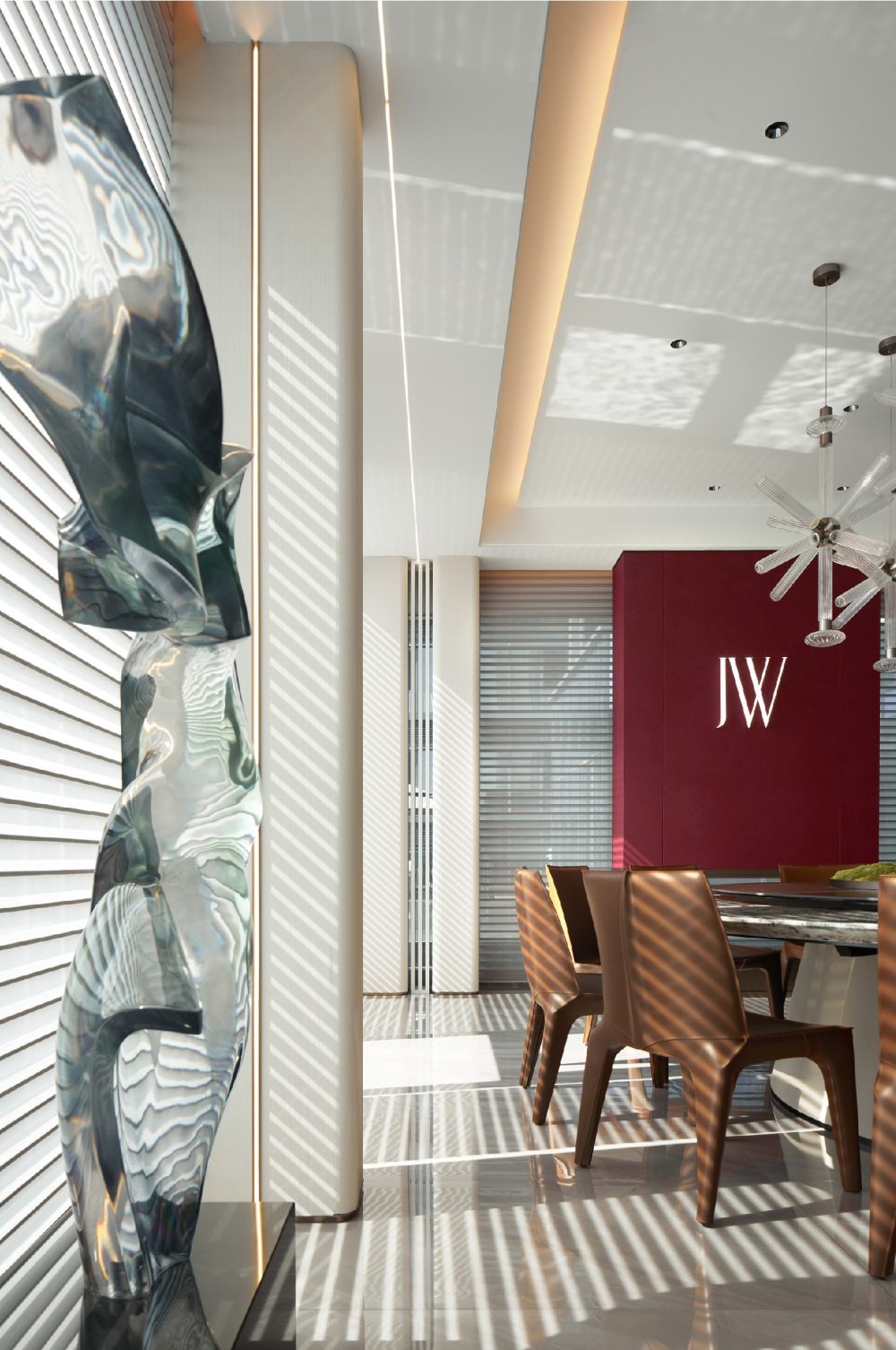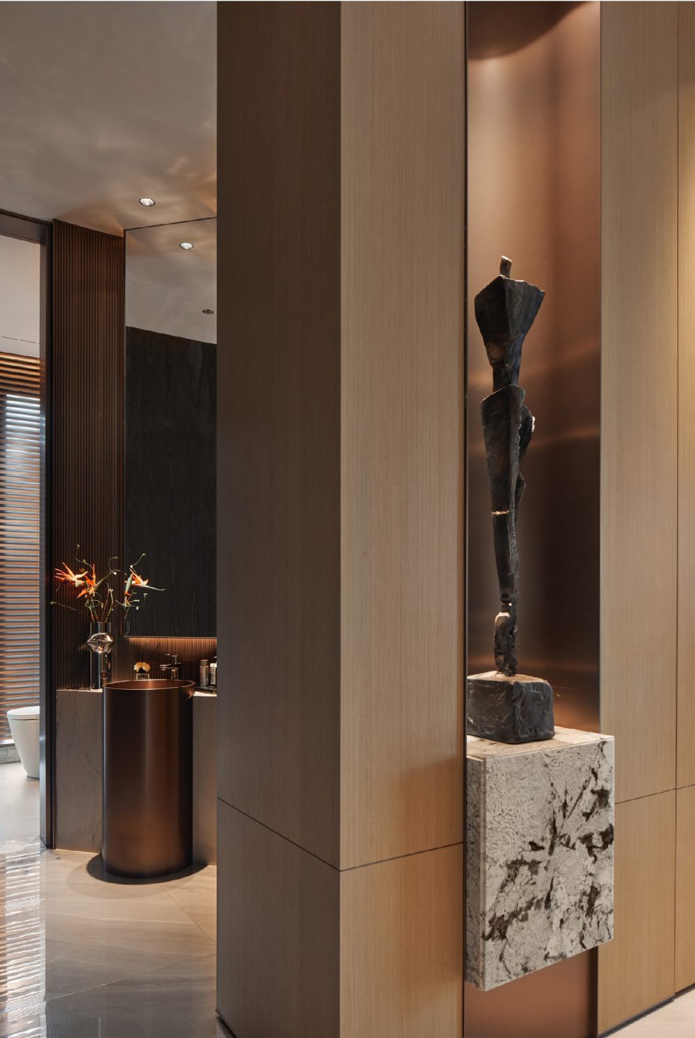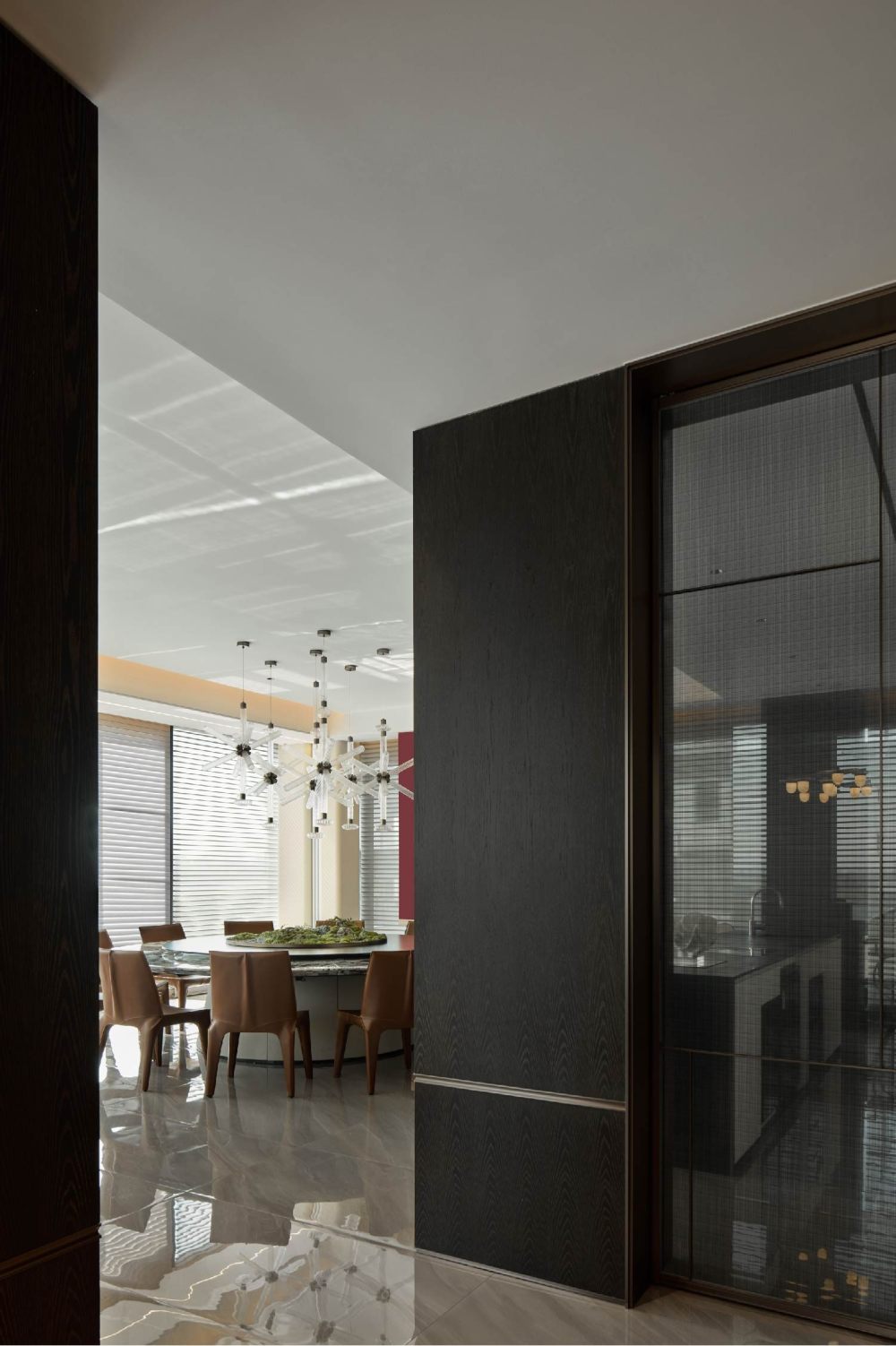 百葉簾將光的語素打破重組,展露出和諧柔暖的氣質(zhì),輔以線性光強調(diào)飾面奢感,從上至下地增加色彩的溫度,同時甄選灰色調(diào)陳設(shè),通過錯落形態(tài)創(chuàng)造新的意趣,經(jīng)由色彩碰撞傾訴溫馨氛圍。