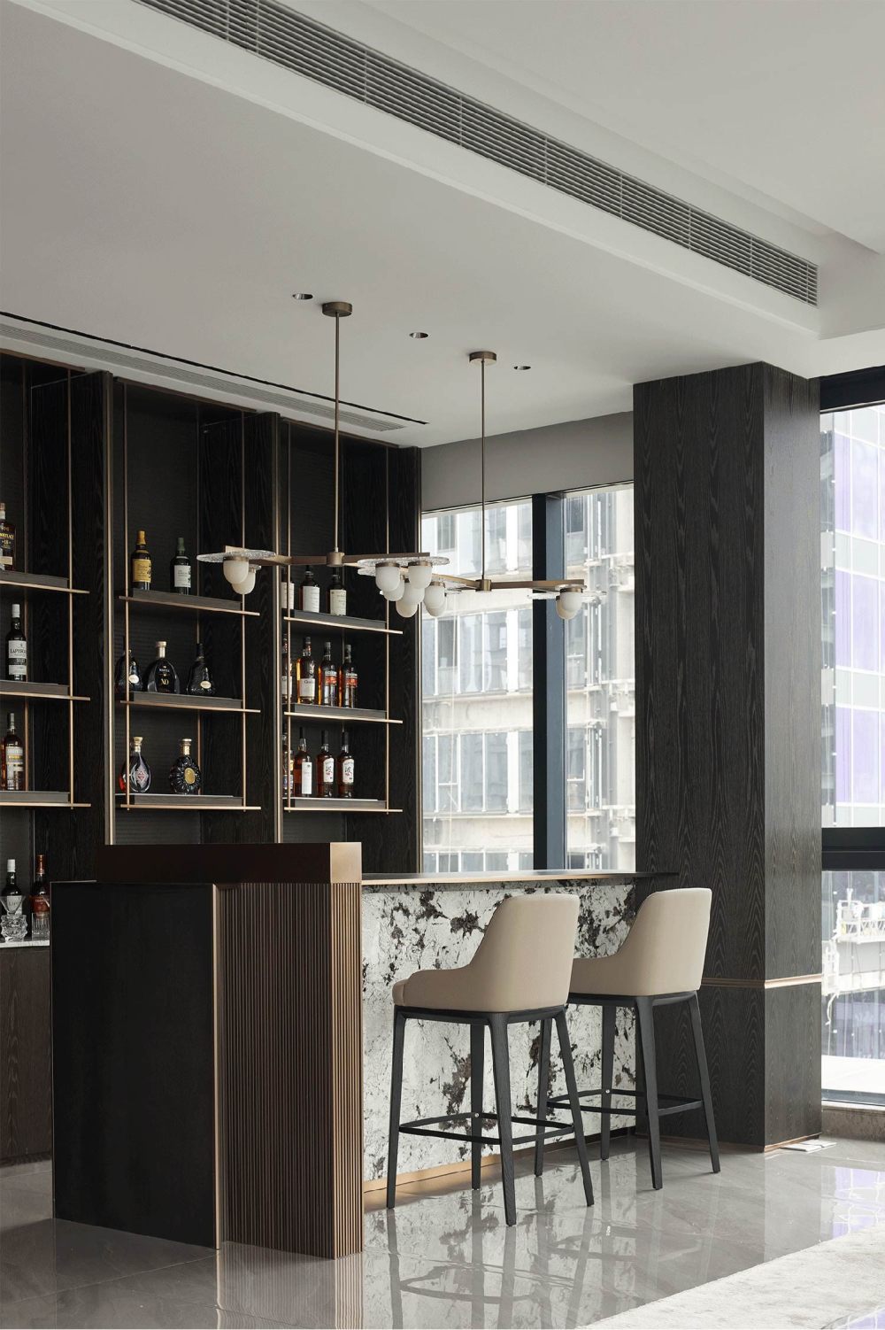 沿用金色材質(zhì),書寫隔層韻律和體塊層次,釋放出暗色蘊含的慵懶感、神秘感與高雅感,兩人并排小坐,一邊欣賞窗外精美景致,一邊沉浸于微醺狀態(tài),達成了放空思緒、感知美好的需求。