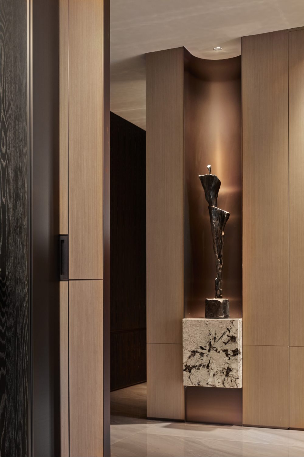 飽含漸變美感的輪廓,激活了深淺木色的細膩感,與詩意盆景相鄰,碰撞出人文與自然共通的美學意境,從初始階段便注入了別樣的生活情趣。嵌入自然奢石,以簡約配色凸顯藝術(shù)氣質(zhì),定義了空間深層的審美與涵養(yǎng)。