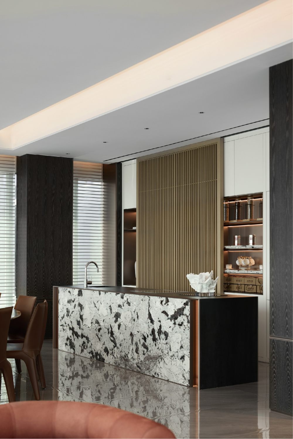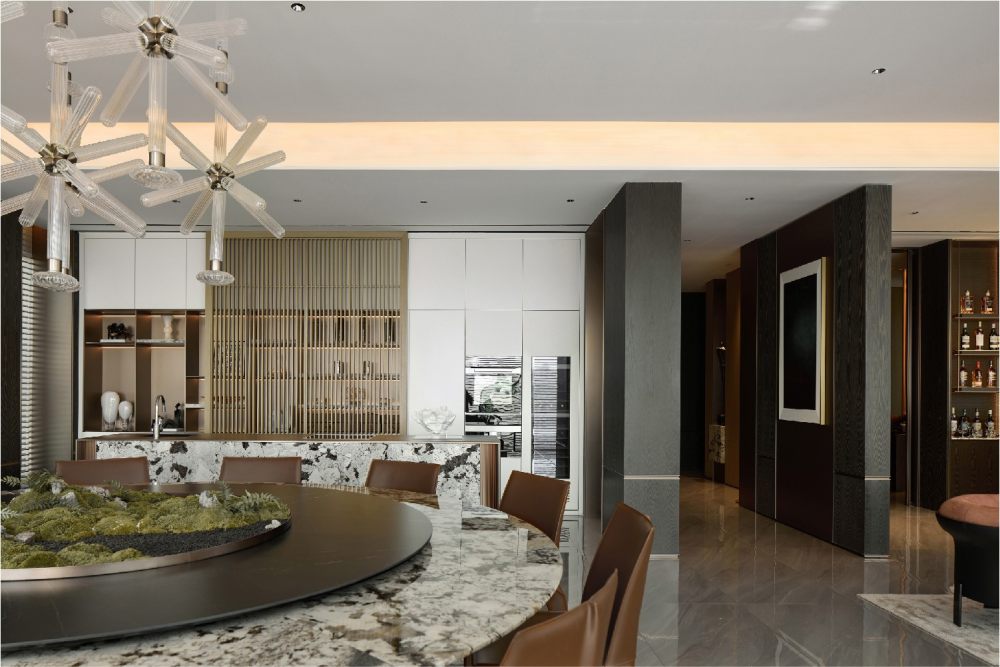 格柵以均衡的圖紋排列,既細化了場域功能,又重塑出另一重美感。更具藝術(shù)力的大理石元素,讓設(shè)計產(chǎn)生了隔空呼應(yīng)的趣味,并以不同切面帶給觀者不同感受,讓自然氣息與煙火氣交織。