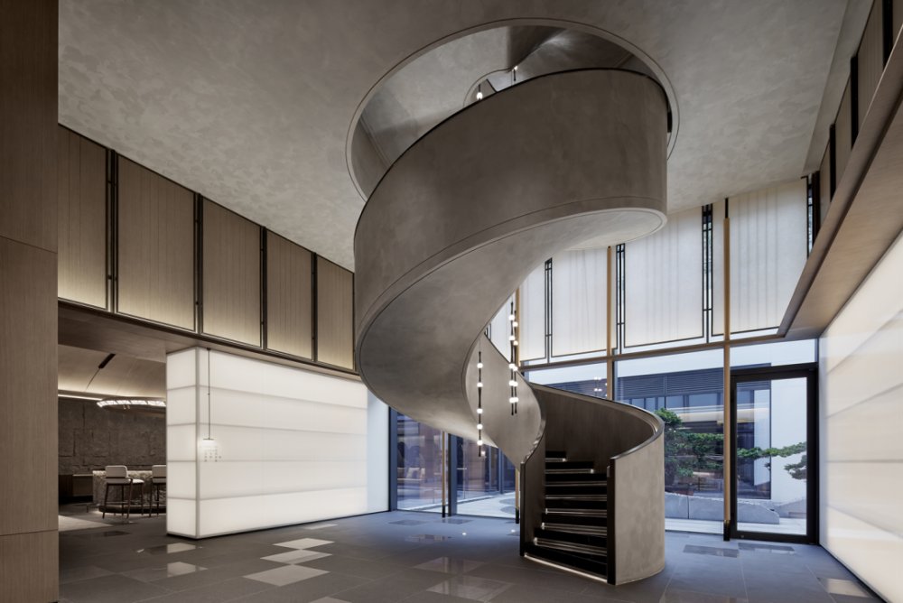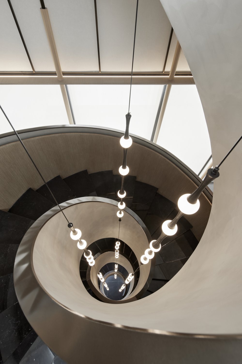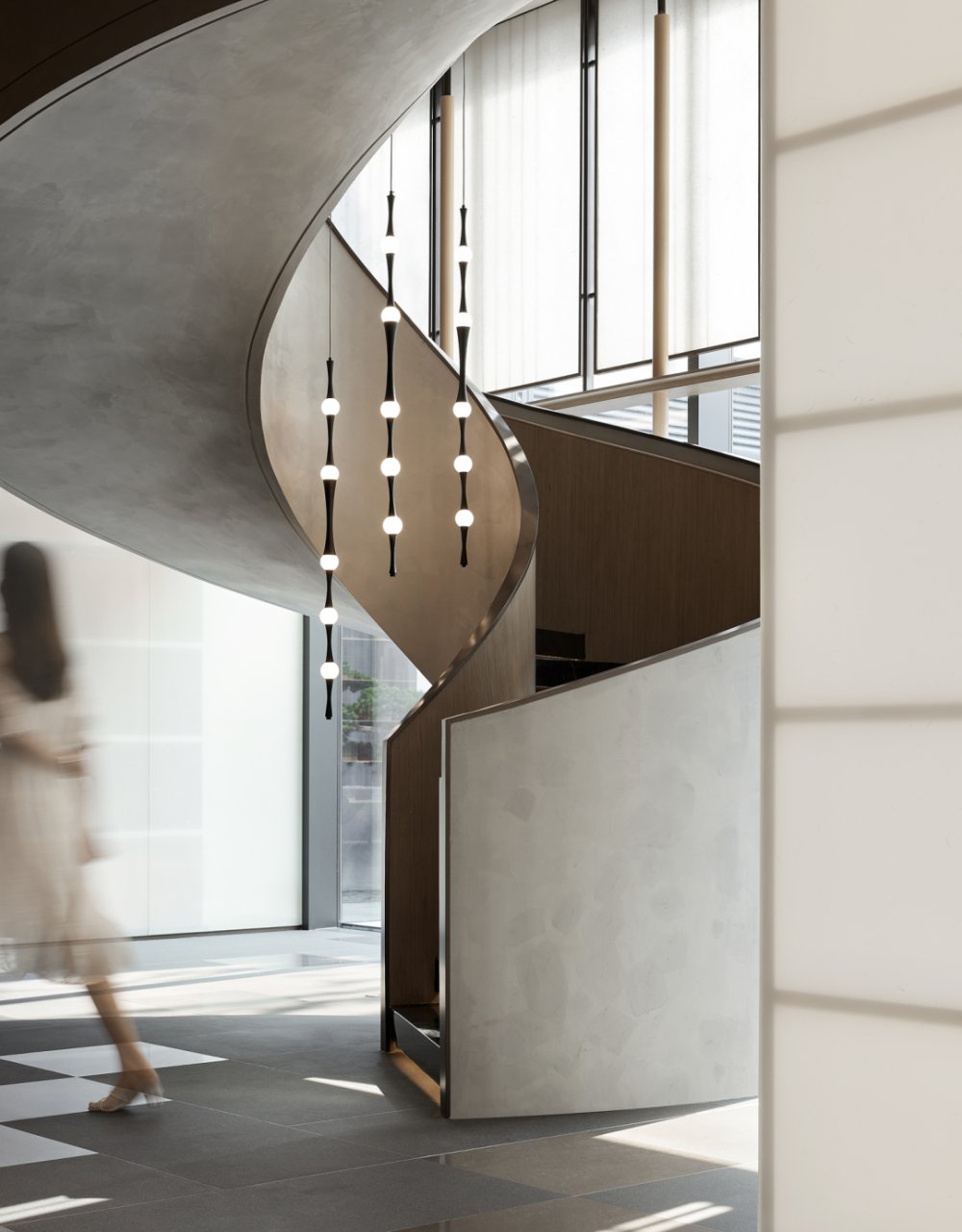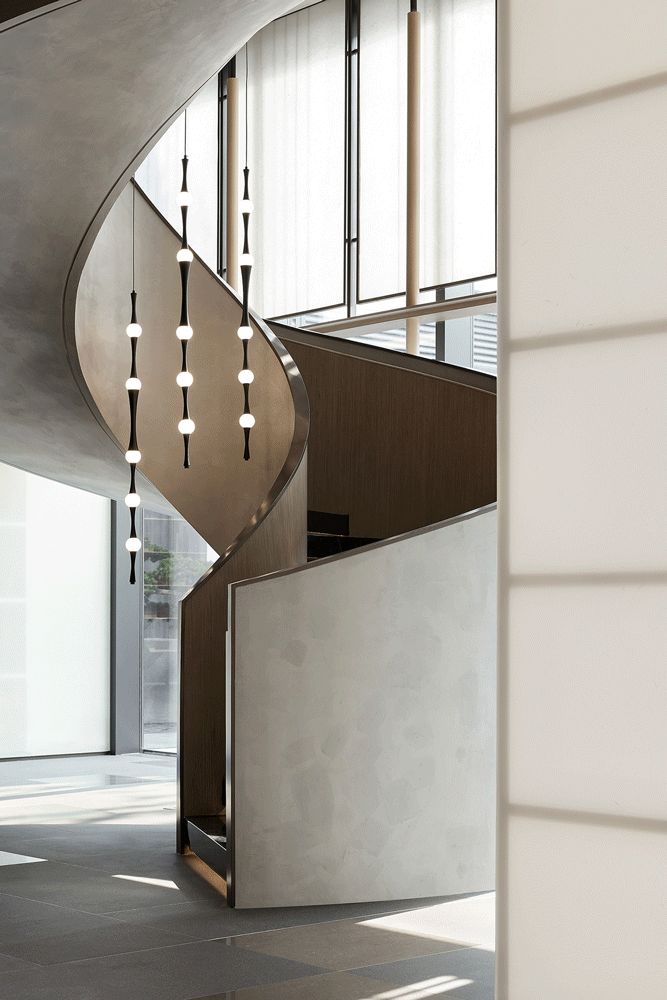 對于層與層之間的連接,樓梯旋轉似一抹飄帶扶搖而上,保持造型與質感的合適距離,就能探索出有溫度有情感的設計,人們在上下穿行時會保有一絲別樣的期待。