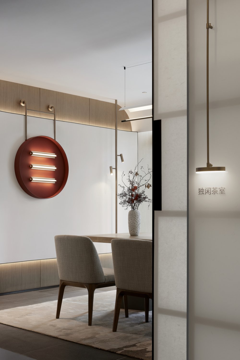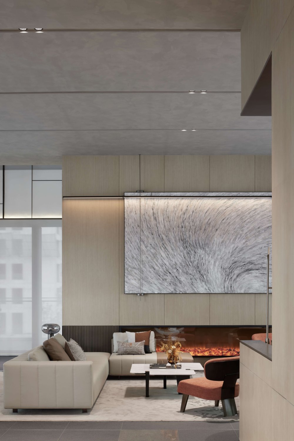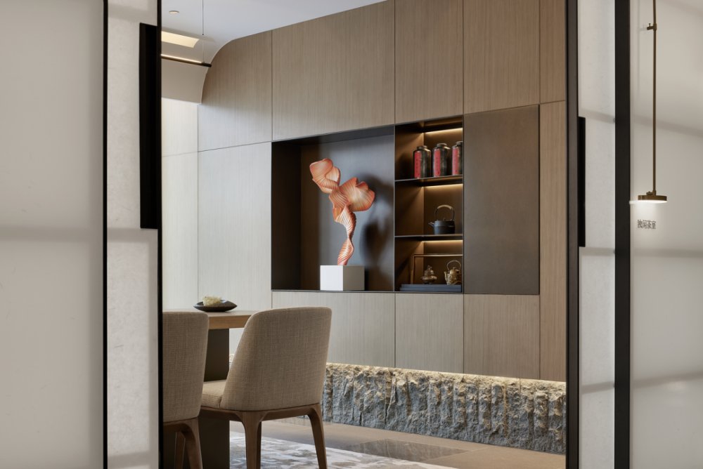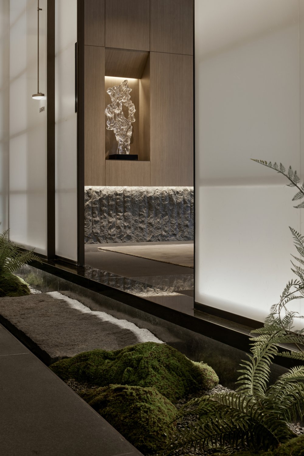 進入前廳,在室內裝飾元素的選擇上,脫掉現(xiàn)代“奢享華麗”的厚外套,讓溫潤的木飾作為點綴穿插其間,奠定高級的“隱奢”生活基調,意在強調回歸生活本身的返璞歸真之意,構成室內環(huán)境與外部自然的緊密連接。