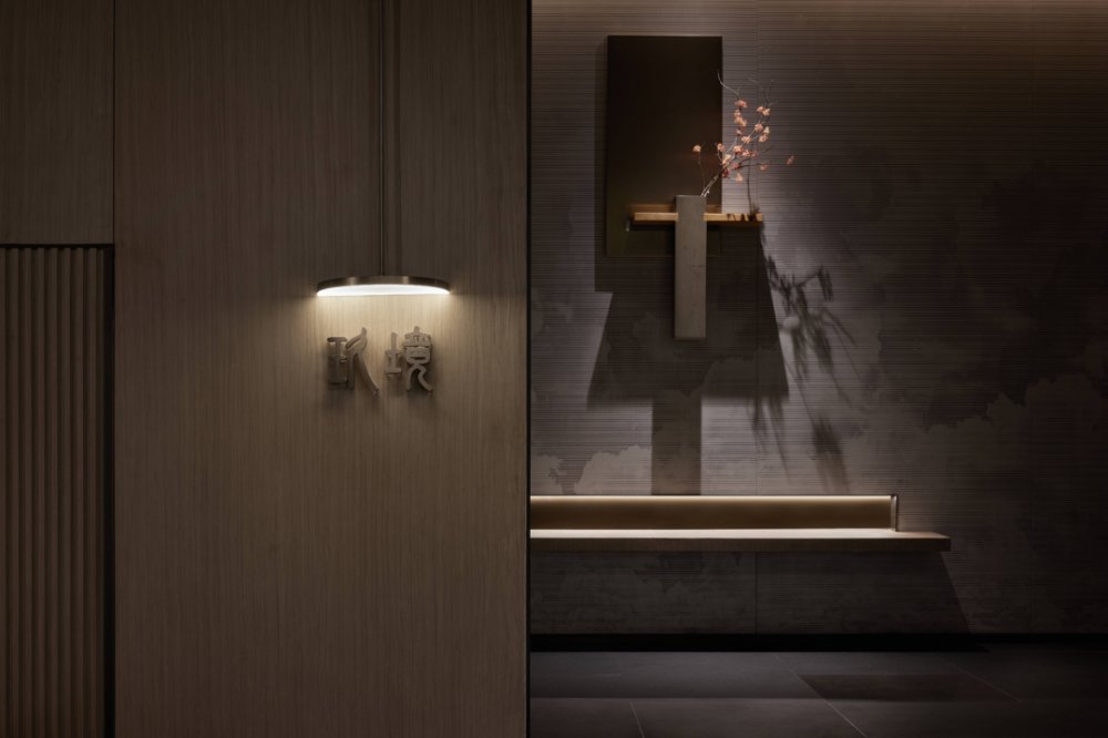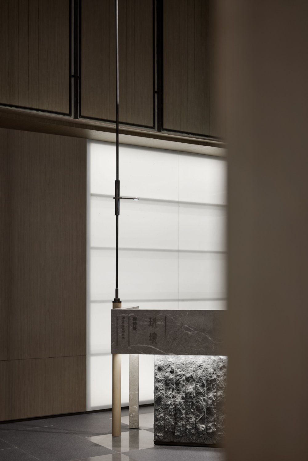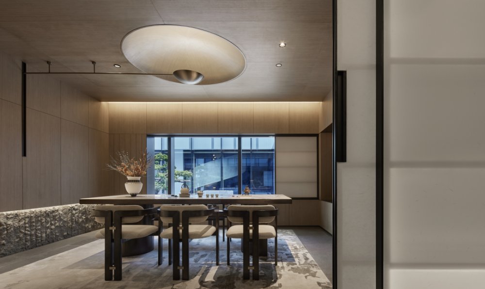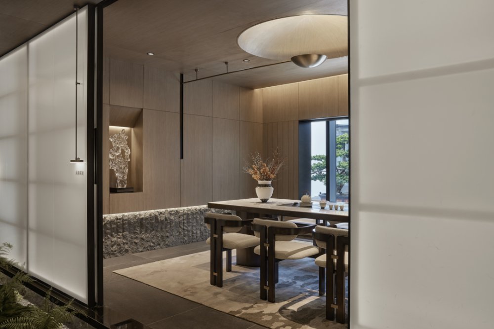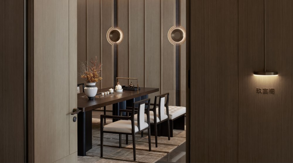 進入前廳,在室內裝飾元素的選擇上,脫掉現(xiàn)代“奢享華麗”的厚外套,讓溫潤的木飾作為點綴穿插其間,奠定高級的“隱奢”生活基調,意在強調回歸生活本身的返璞歸真之意,構成室內環(huán)境與外部自然的緊密連接。