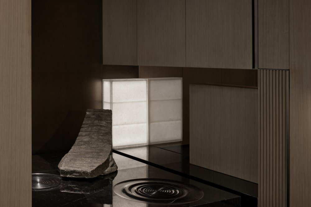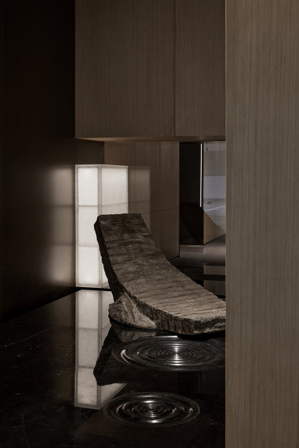 青灰石面、細韌織物,簡素造型借材質突顯肌理,創(chuàng)設一份獨屬得的靜謐怡然。