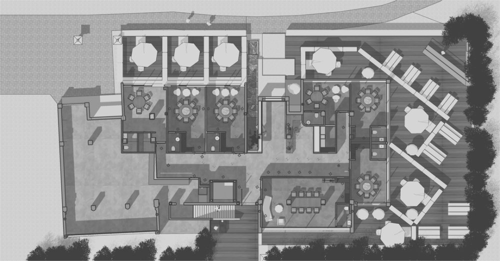倘若“大隱于繁華都市意趣,又不得隱入塵煙”,那什么才是設(shè)計的最優(yōu)解?入戶外立面整體采用灰白、深灰色,打造出干凈整潔的空間肌理,玻璃投投射出的暖黃色光影為素雅的空間注入了明凈的暖意,每一層綠意圍繞,延伸成為各個包間的庭院,在靜謐輕盈的質(zhì)感里從自然走向自然。