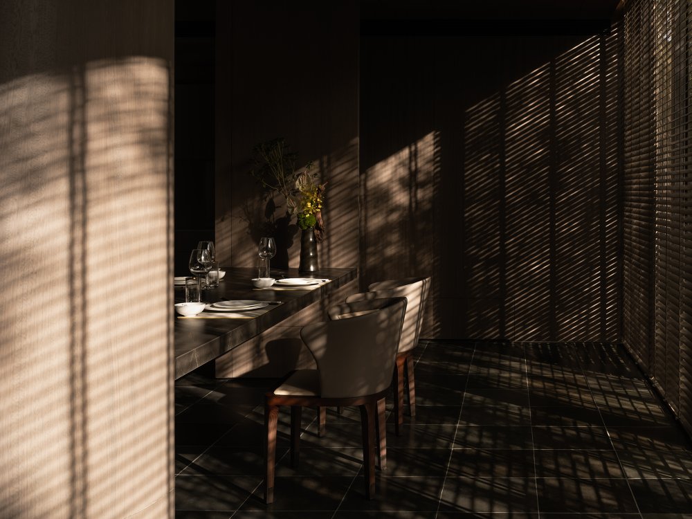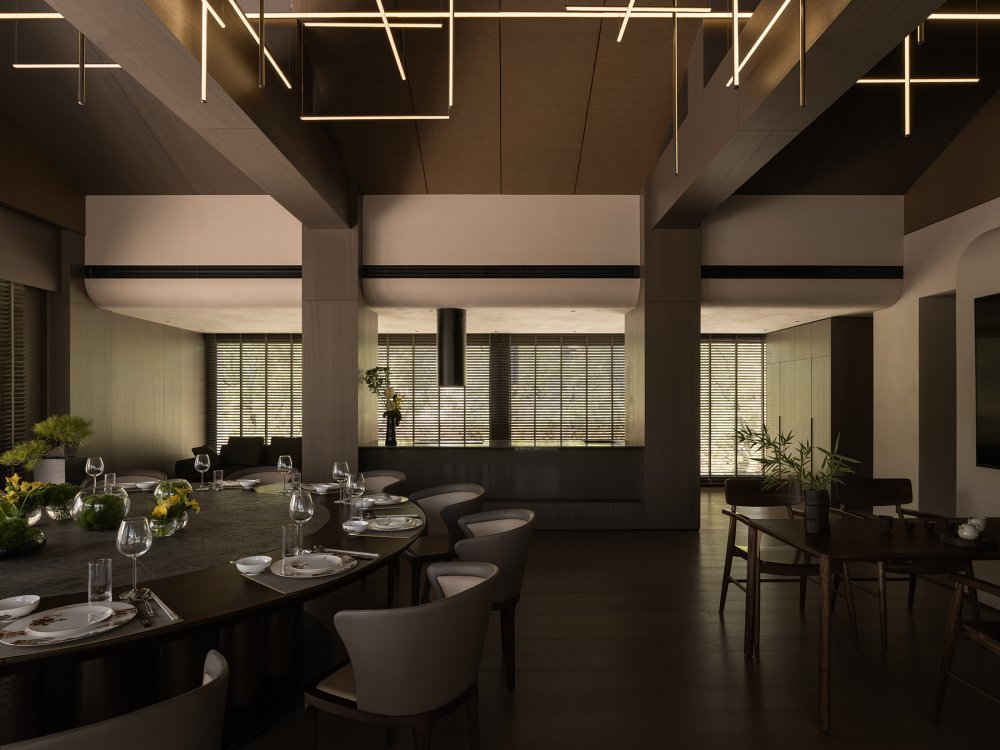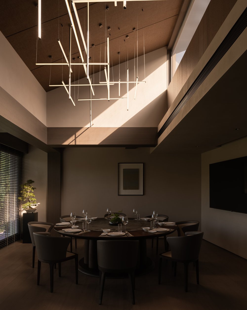 為緩解空間略顯平鋪直敘的體塊化觀感,設(shè)計以打破和重組細節(jié)的方式破解視覺疲憊。細節(jié)處,包間玻璃門沒有選擇通頂設(shè)計,反而留有一圈鏤空,在似透非透之間,視覺上完成了空間的延續(xù);選用線條燈打破方方正正的結(jié)構(gòu),并用百葉切割落地窗的光纖,線條與線條交叉、日光與燈光呼應(yīng),為空間呈上逐漸立體、活潑的氛圍。