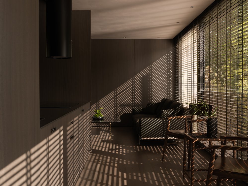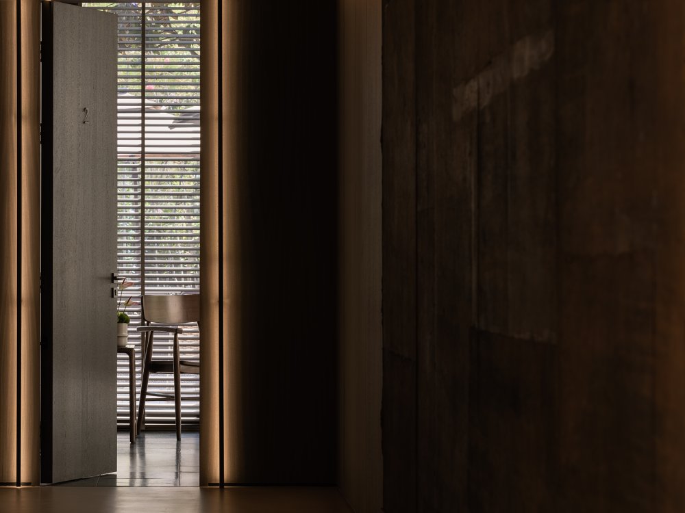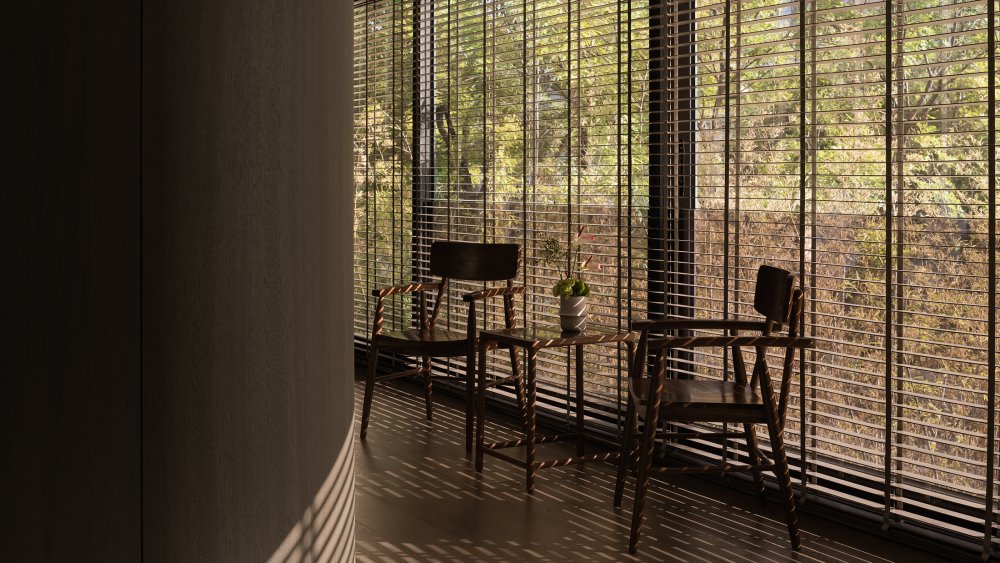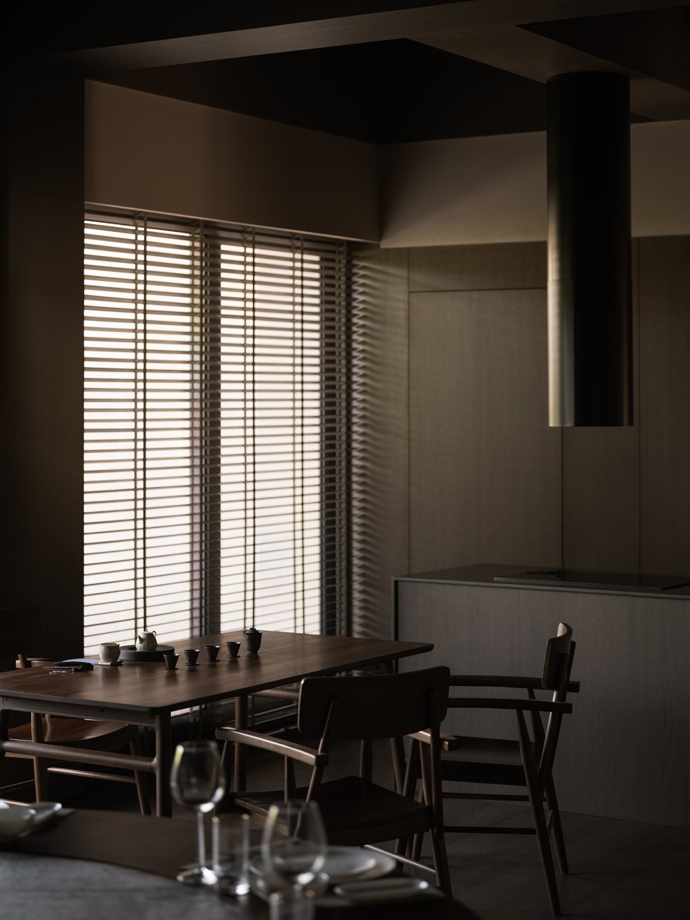 通頂落地的百葉窗成為最佳氛圍感的“單品”,天氣晴好時,陽光穿過百葉間映出斑駁的墻面,躍動的光影也成了室內(nèi)裝飾的一部分。