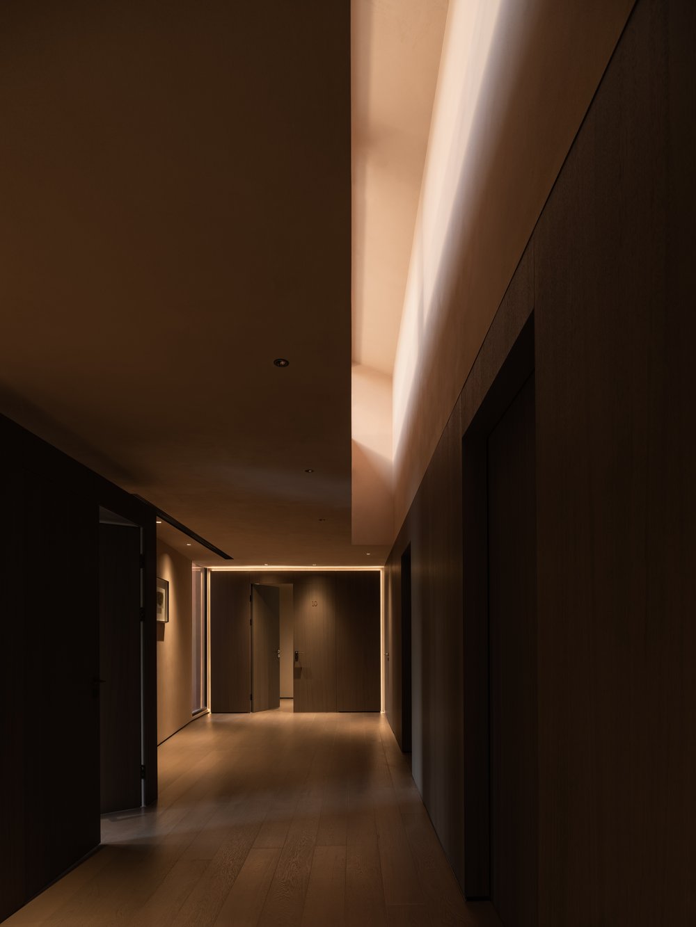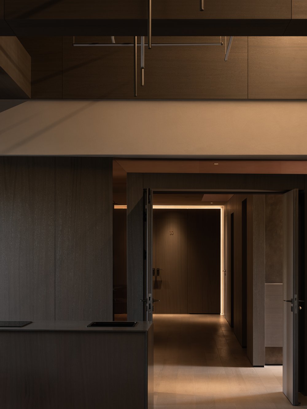 功能區(qū)域以視線延伸動線,一樓餐廳的六個包間門均被隱形在空間中,發(fā)光的細形銅框繼續(xù)衍生勾勒,最大程度地保留了環(huán)境氛圍的整體性和延展性。