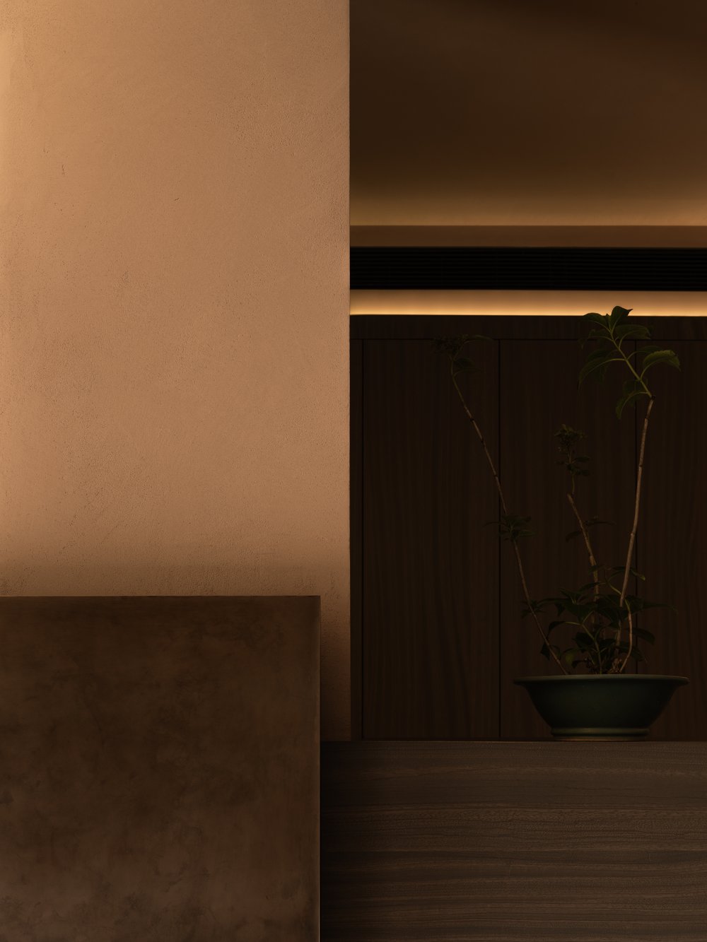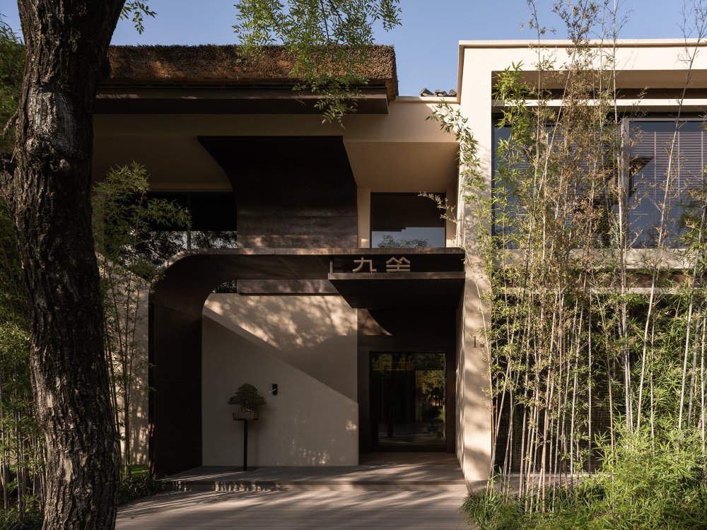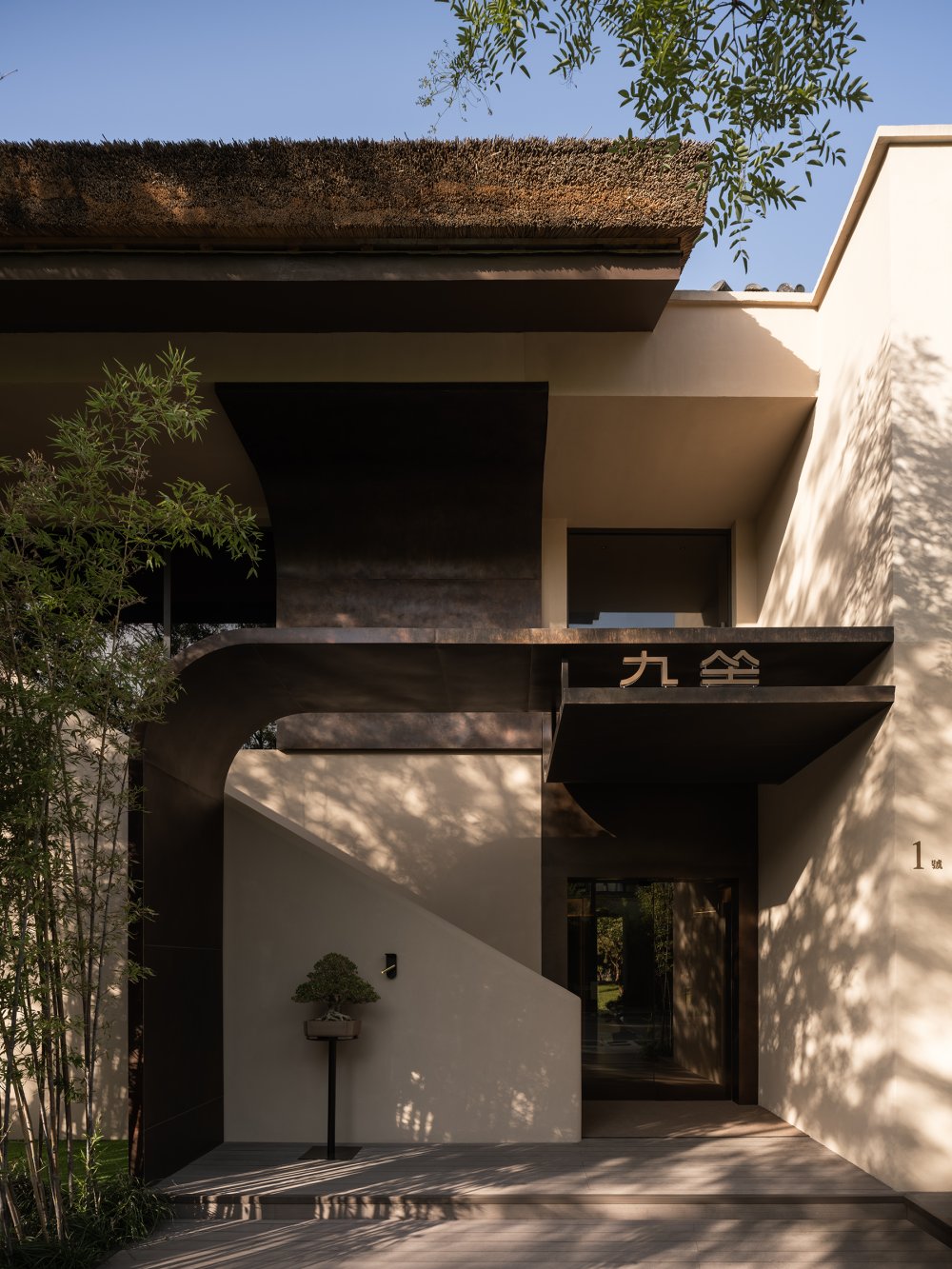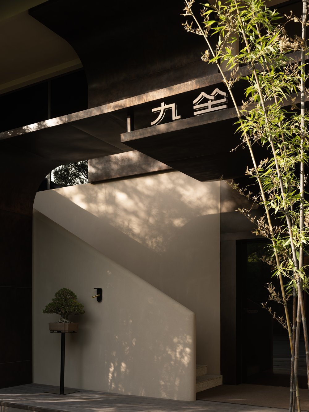 倘若自南湖對面的自然之門進入九坐1號,那么漫游過后,便將由另一扇門而出,這里延展出空間的另一重精神性,戶庭無雜塵,主入口的設(shè)計更顯含蓄高古的建筑感,它指向設(shè)計師對西安城市文化的理解,也是對未來城市藝術(shù)的致敬,一簇竹林旁,兩塊異形銅板搭建出極簡的門頭,銅板交疊處為”九坐“特意設(shè)計的字體克制地嵌入其中,克制而洗練,隨著柔白的素色砂質(zhì)墻面拾階而上,便抵達又一重詩意之境。