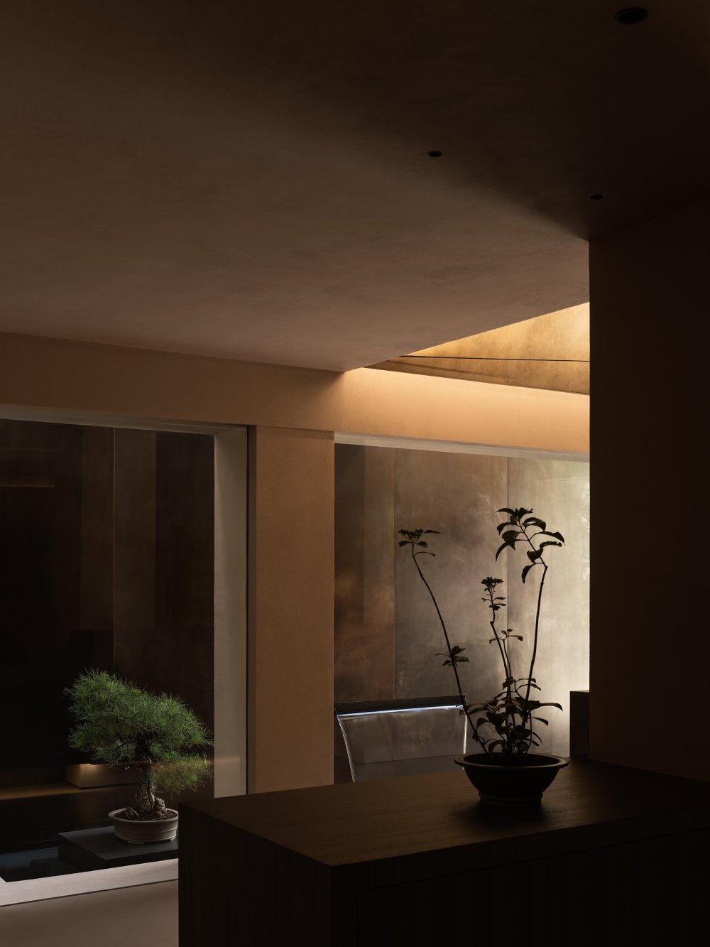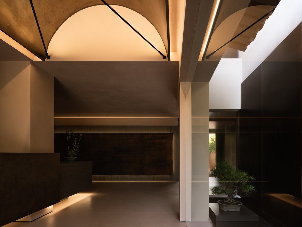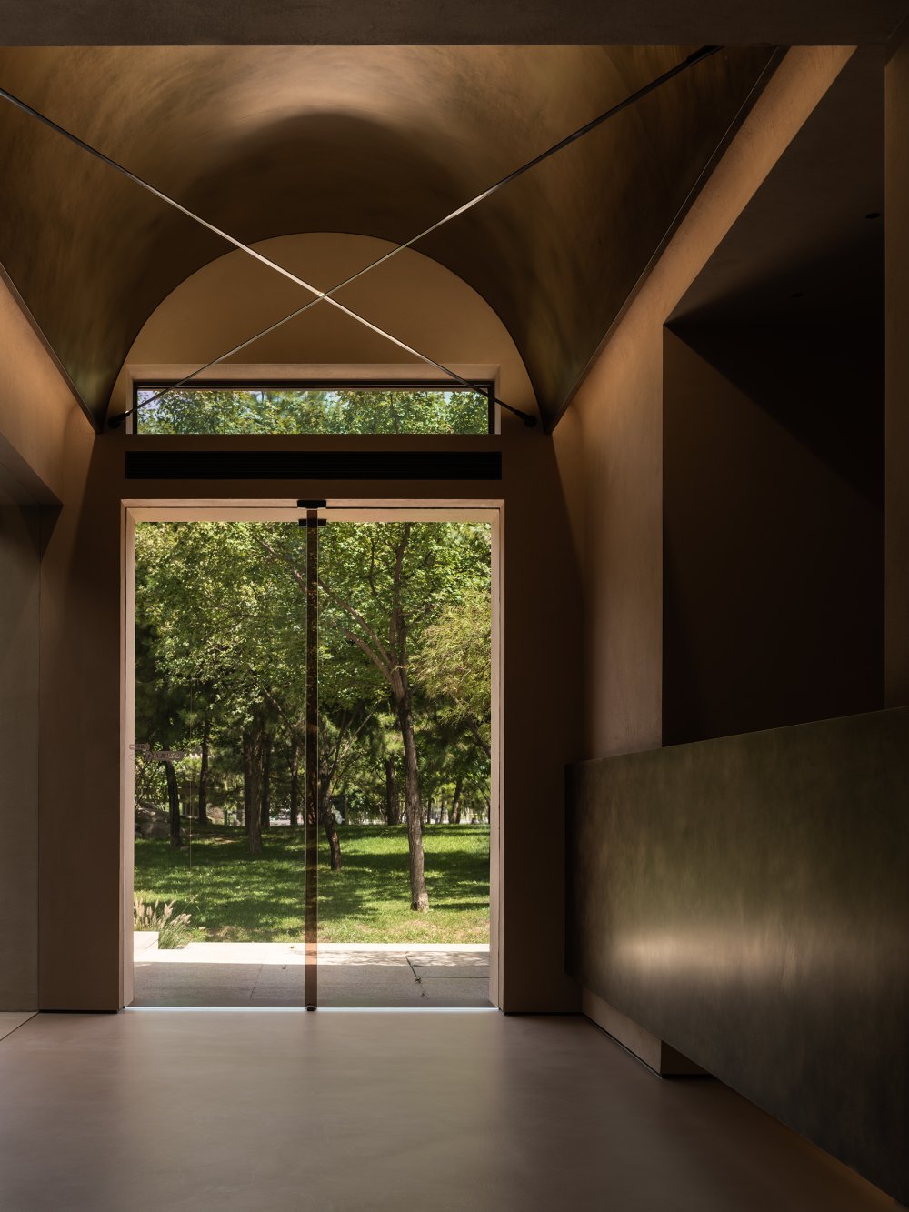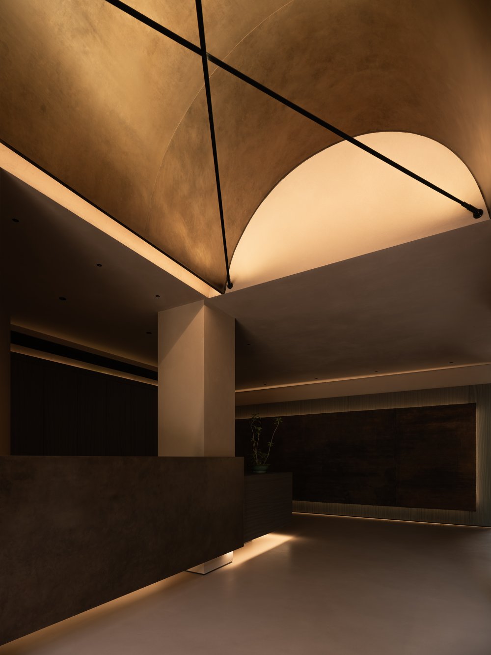 進入室內(nèi),尖頂屋面被改造成更舒緩柔和的拱形,在圓融的空間質(zhì)感中與“九坐”整體的文化屬性產(chǎn)生對話,一方面做舊的銅器材質(zhì)以更現(xiàn)代的筆觸表現(xiàn)中式審美,在凸顯時光肌理的同時與建筑本身的造型融為一體,另一方面,金屬發(fā)出的銳意之感和泥土、木質(zhì)營造的模糊意向形成視覺碰撞,搭配燈帶反射出銅的質(zhì)感,呈現(xiàn)飽滿、斑駁的肅穆,拱頂下細長的金屬交叉造型正好消解嚴肅,現(xiàn)代與自然以此為點,向整個空間散發(fā)、互相烘托成全。