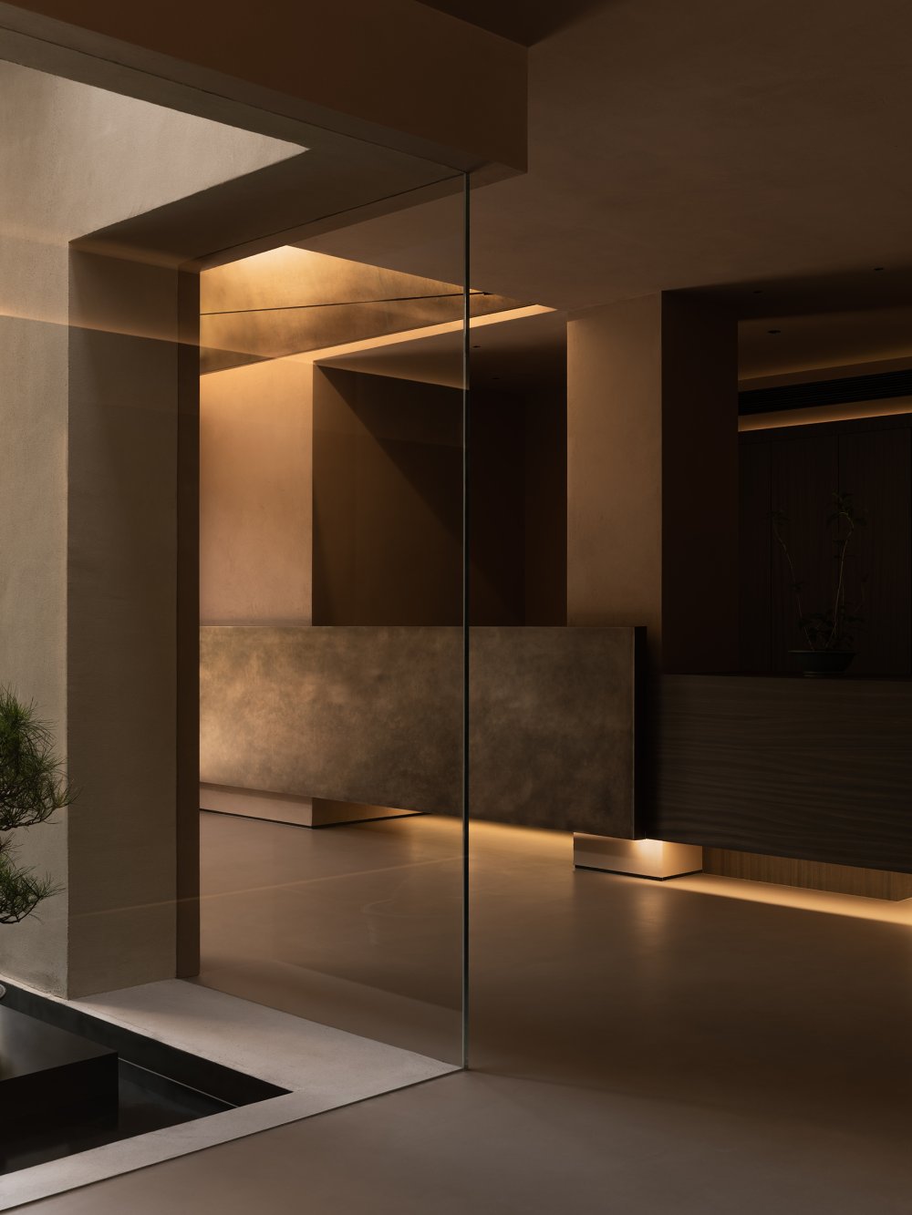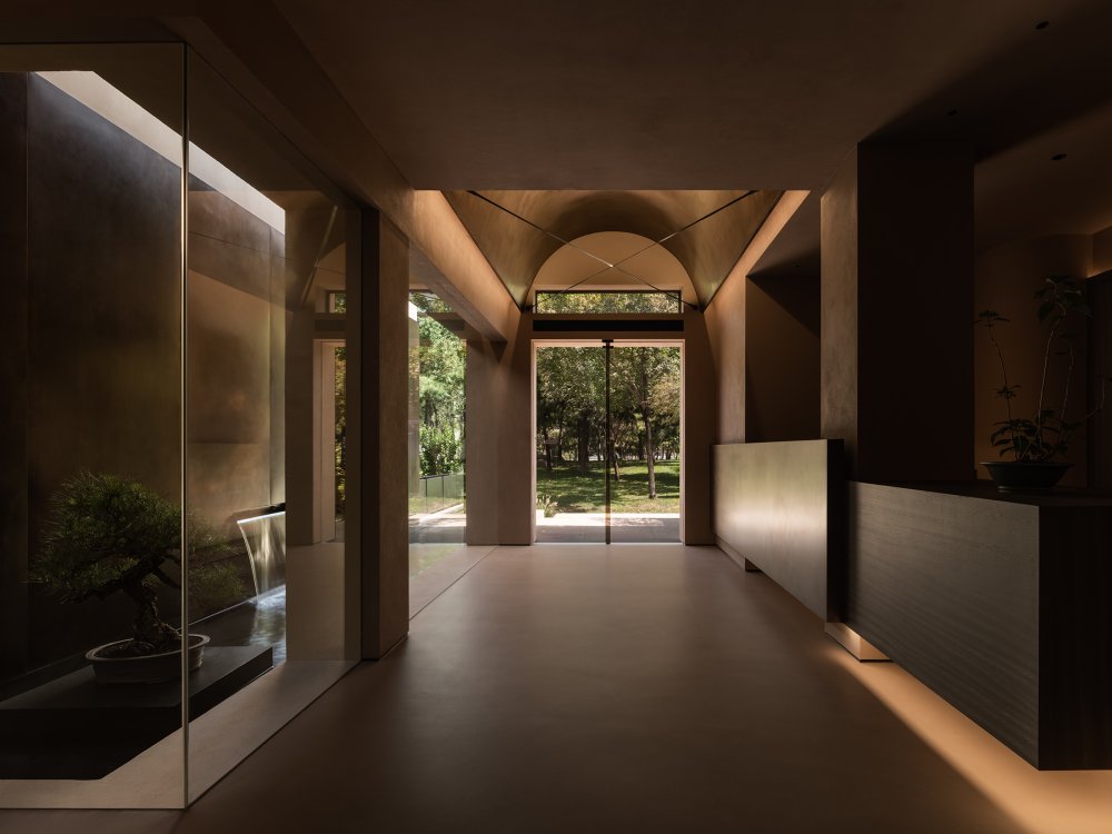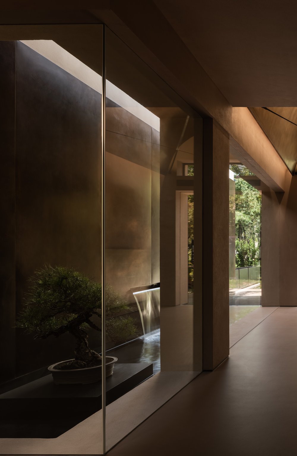 - 設(shè)計師將兩個出入口抽象成一實一虛對比,一個代表自然性,另一個代表精神性。正對湖面的入口,潺潺水流繞過草坪,匯入湖中,設(shè)計將這一動態(tài)的水景納入室內(nèi),構(gòu)成門頭的一部分,也成就了巧妙的自然裝置,以活水景觀為起始點,隱于鬧市的畫面開始徐徐展開。