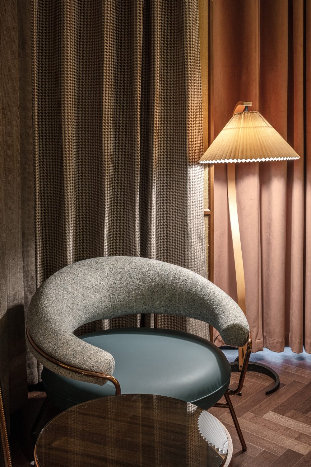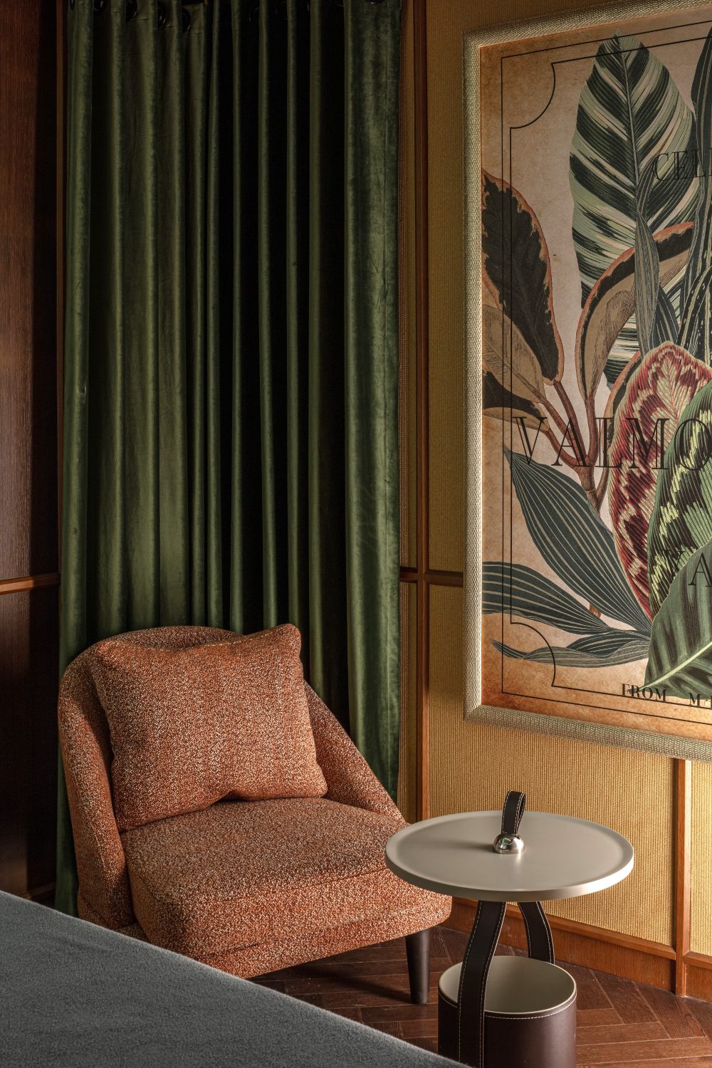 室內(nèi)整體以大地色系為主,旨在呼應(yīng)木材和藤編的自然質(zhì)感。使用翡翠綠的撞色花磚、珊瑚紅吊頂,灰藍(lán)色的絲絨窗簾等,重新詮釋了一種濃烈的女性色彩美學(xué)。