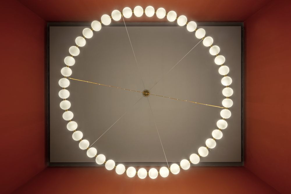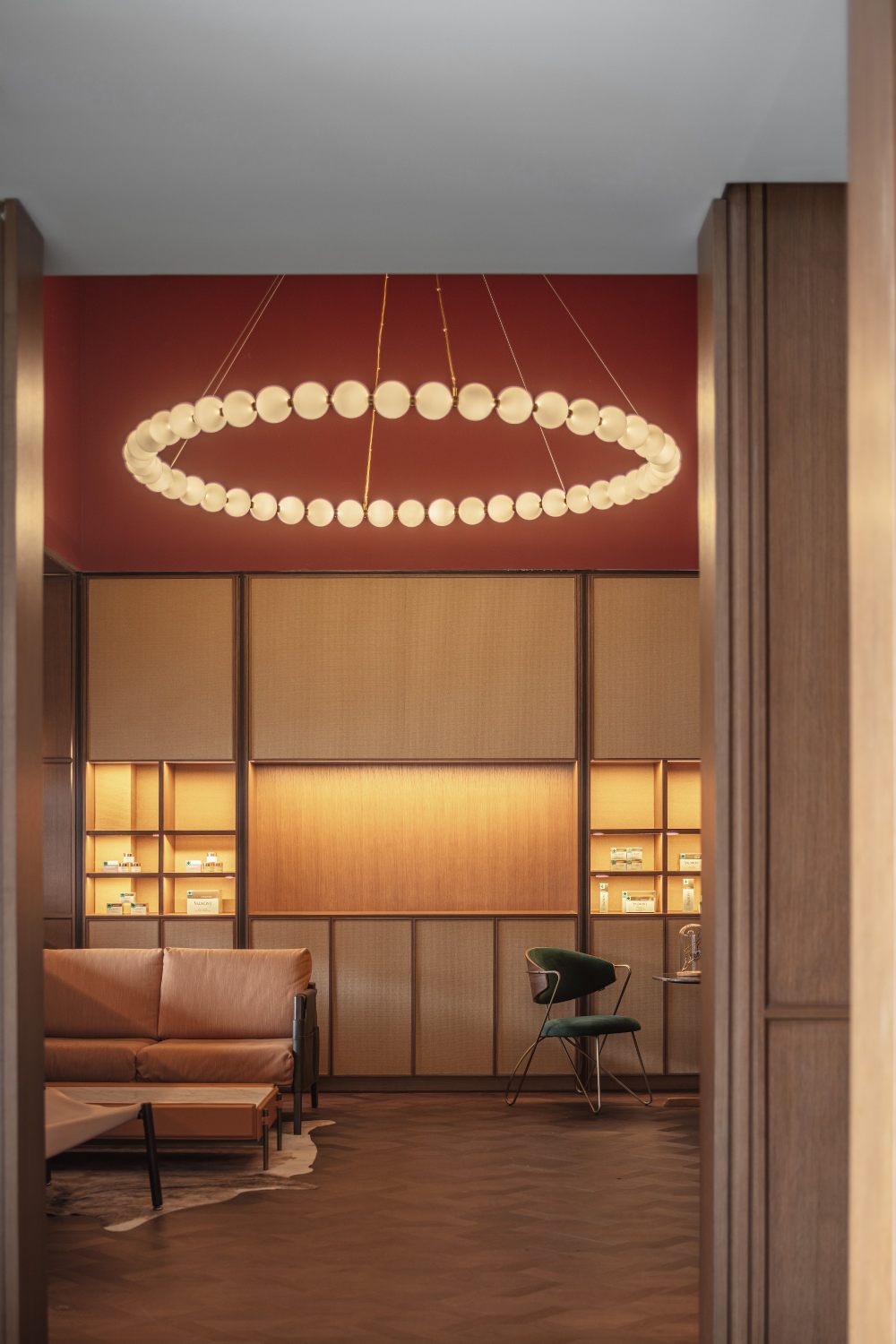 頂面的乳白色球形燈宛如貴婦脖頸上的珍珠項(xiàng)鏈,映照得珊瑚色頂面,為空間鋪上暖色的基調(diào)。