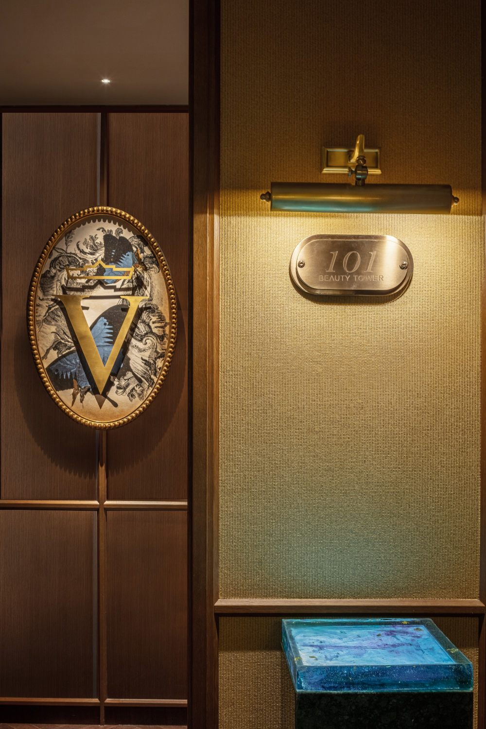 琥珀,凝固時(shí)光的美麗。從前廳通往 SPA 的過(guò)道,是一段由小及大的空間,四個(gè)深綠色大理石方柱靜靜地立在道路兩邊,其上各放置一塊特制的琥珀造型臺(tái)面,來(lái)來(lái)往往間,在燈光的渲染中沉淀每一位客人的美好回憶。