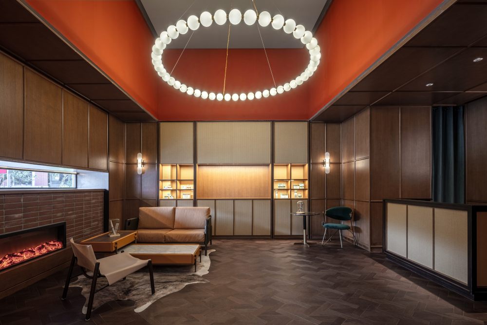 空間中的護(hù)墻板與拼花木地板體現(xiàn)出了經(jīng)典的裝飾韻味,但墻面簡(jiǎn)約的造型線(xiàn)以現(xiàn)代化的手法加入了時(shí)尚屬性,二者的結(jié)合,帶來(lái)微醺的復(fù)古風(fēng)情。